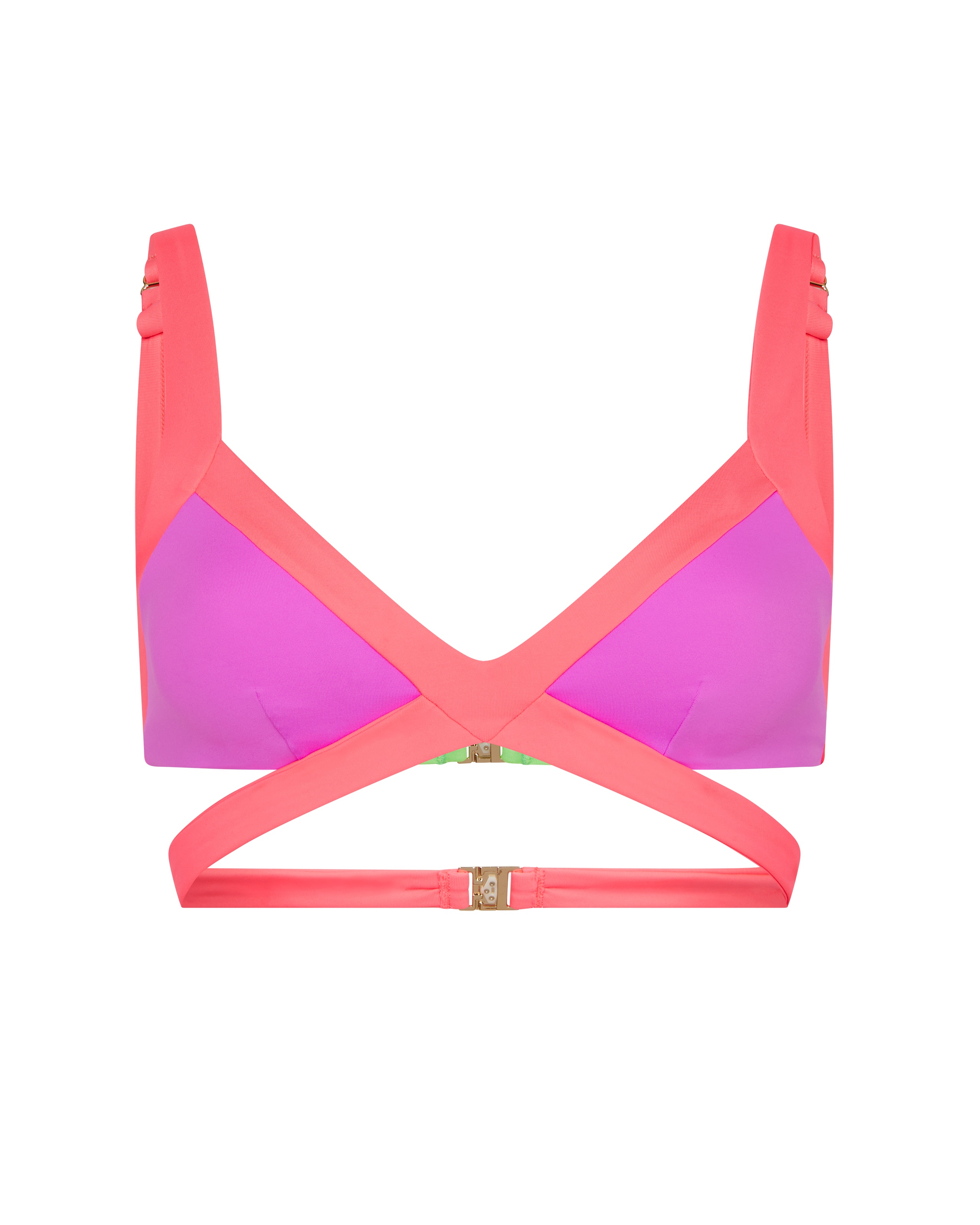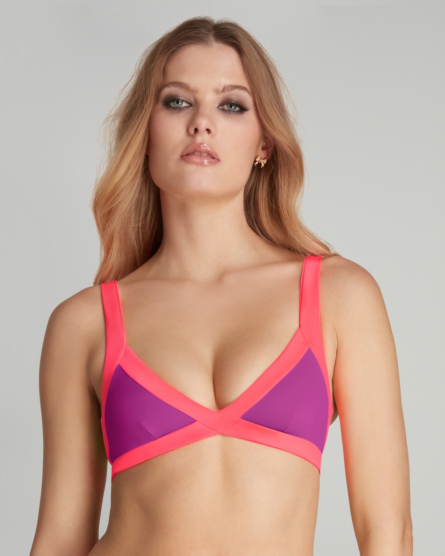 Топ купальника Mazzy фиолетово-розового цвета из итальянской экологичной техно-ткани ECONYL®. Мягкие треугольные чашки. Бретели создают эффектные вырезы. Идеальная пара к плавкам Mazzy для смелого пляжного стиля.