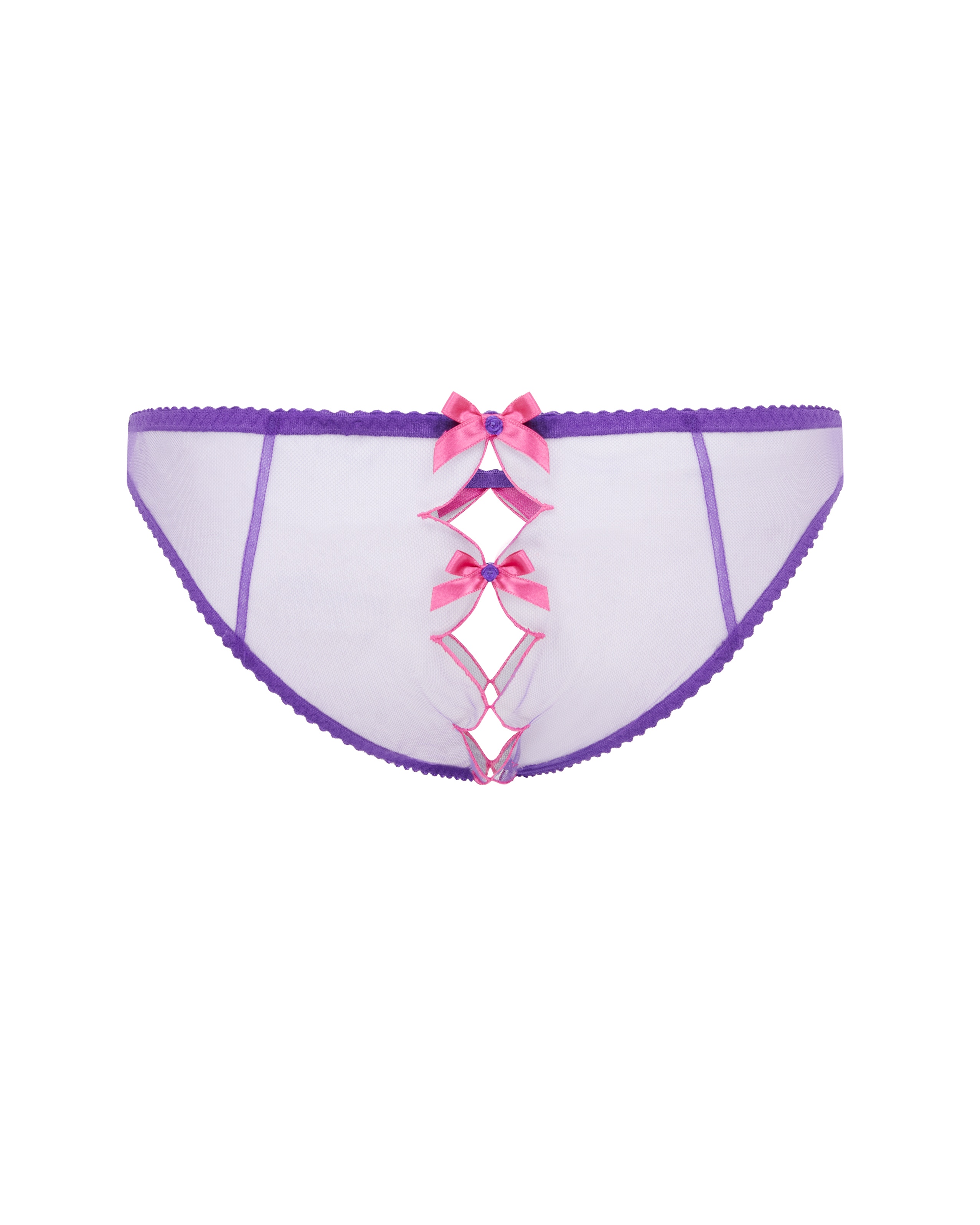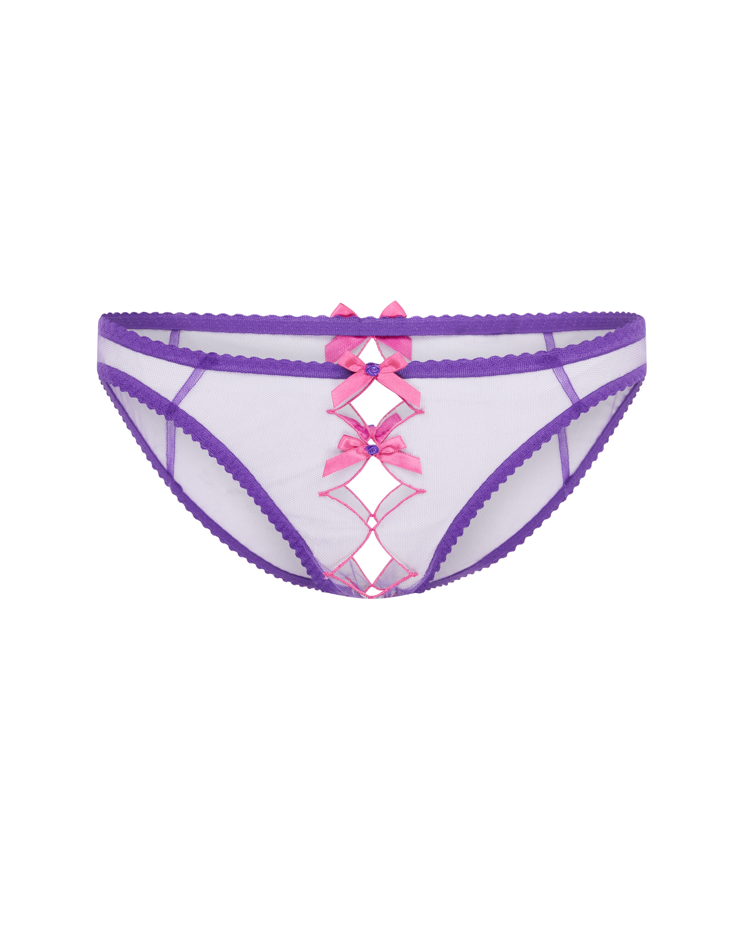 В коллекции Lorna представлены фиолетовые французские трусы из сетчатого тюля с розовой вышивкой. Открытая ластовица и фигурные края создают эффектный акцент.