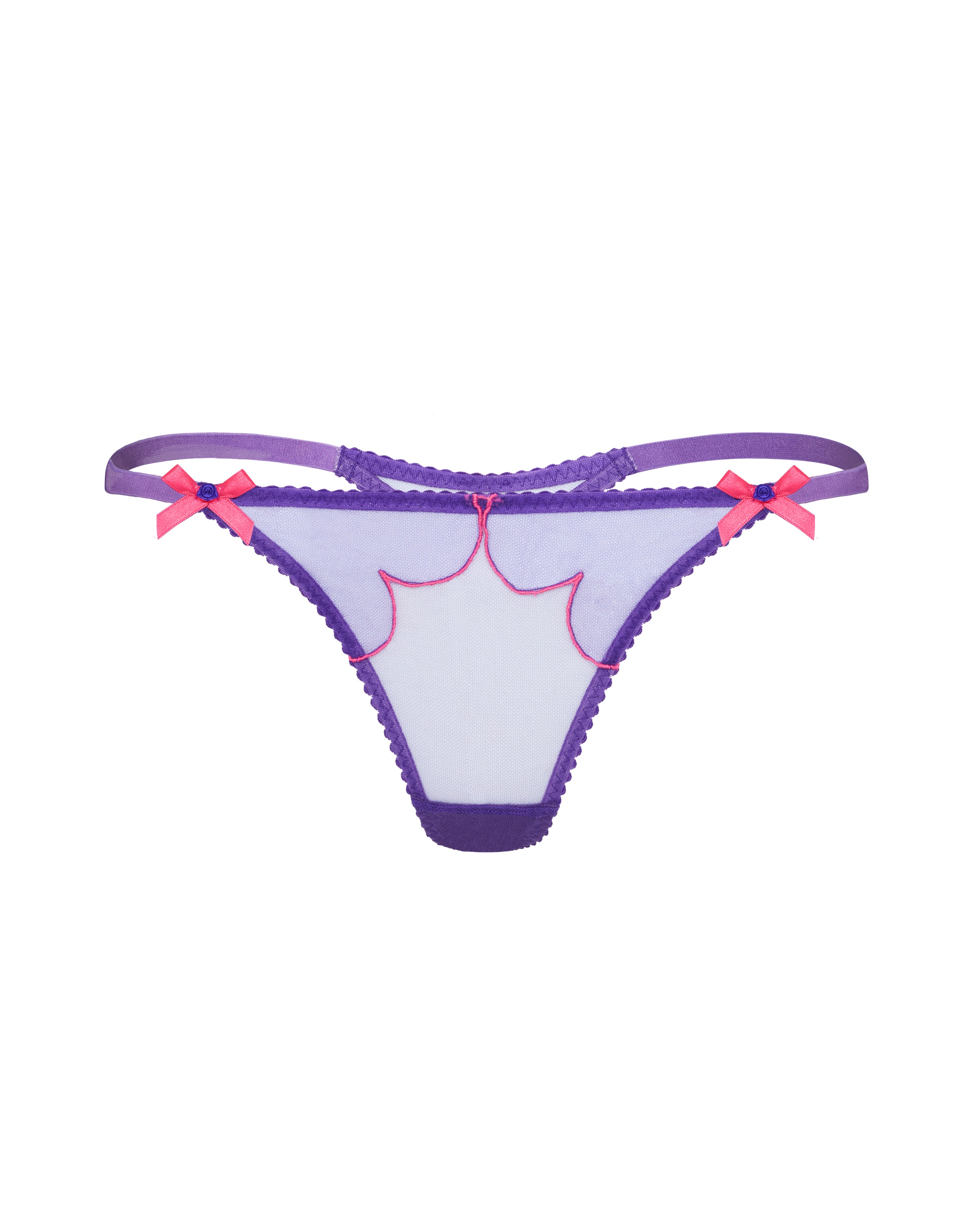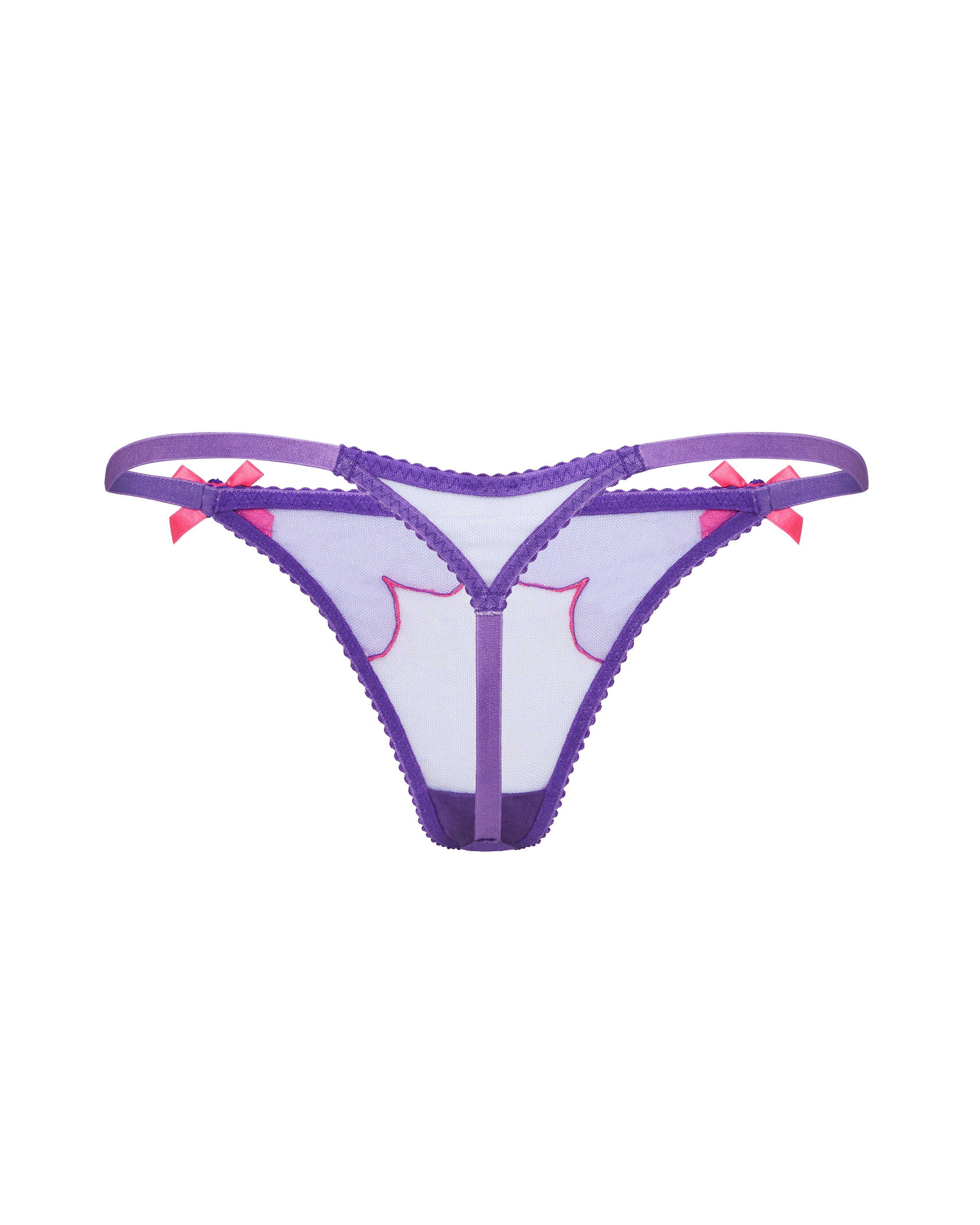 Стринги Lorna в насыщенном фиолетовом цвете выполнены из тонкого тюля с розовой вышивкой. Французские швы и волнистые края создают элегантный силуэт.