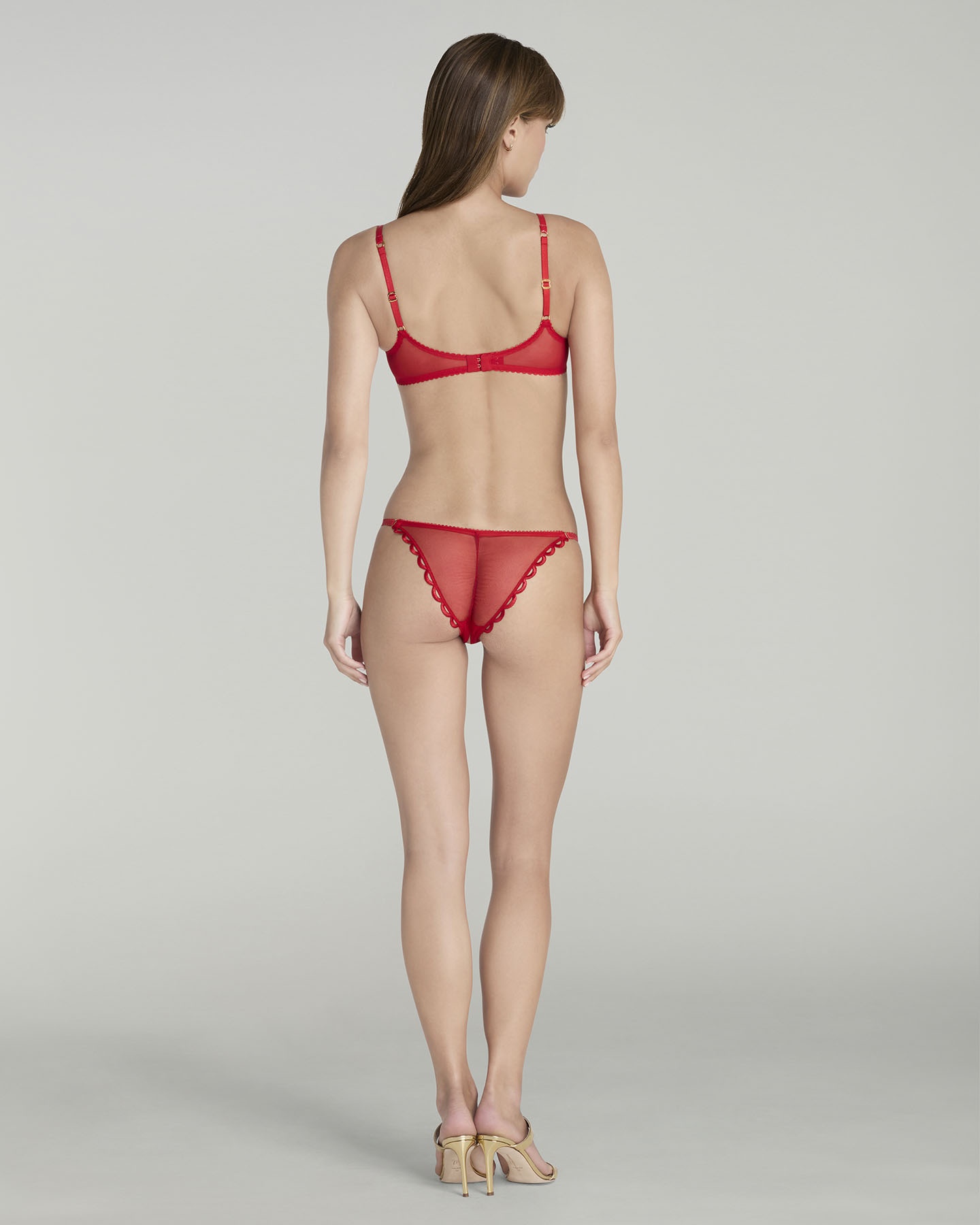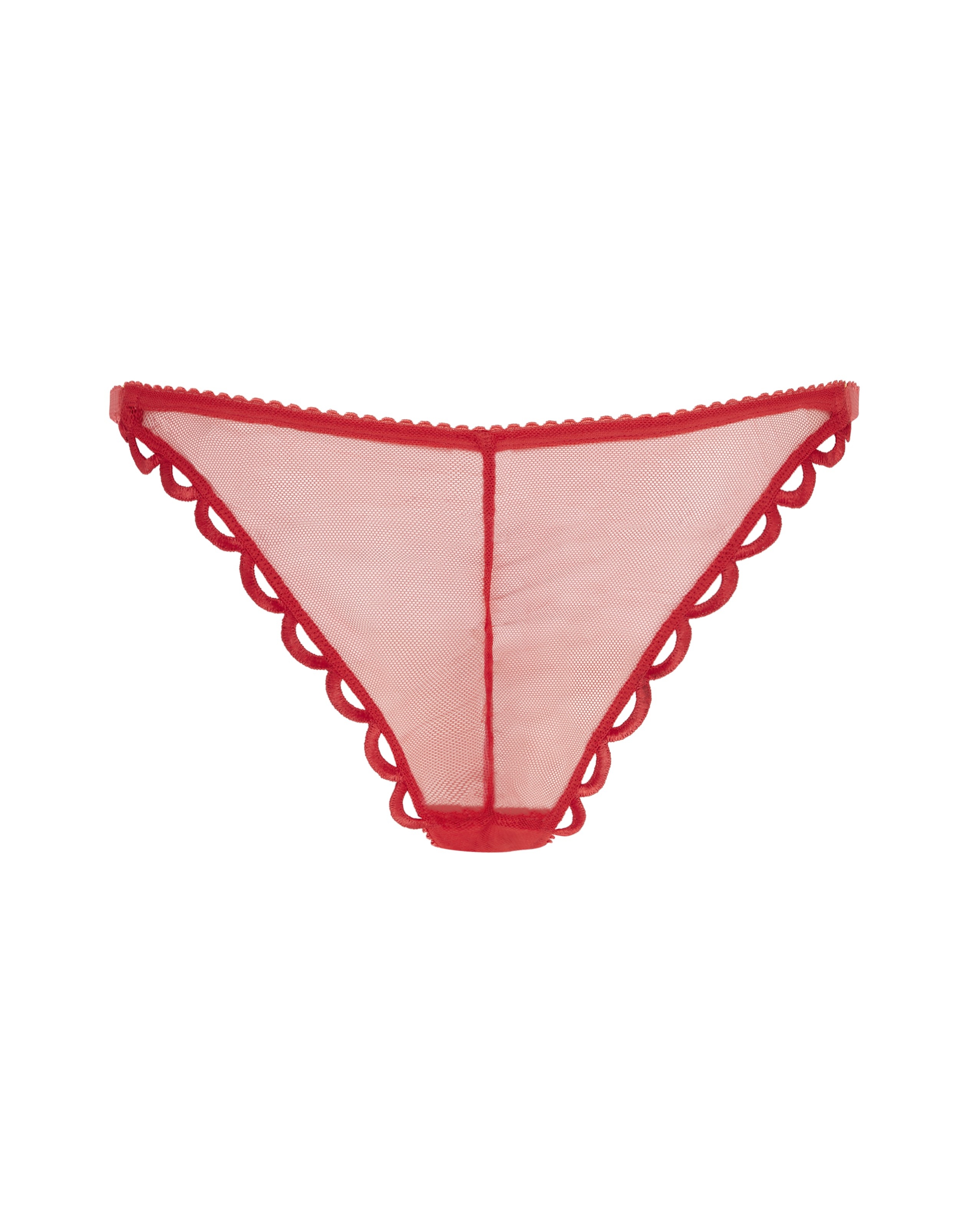 Французские трусы Zarya красного цвета с открытой ластовицей, выполненные из глянцевой ткани, подчеркивают ноги благодаря высокому крою танга. Окантовка из гипюра с эффектом мокрого блеска завершает смелый дизайн, идеально дополняющий остальную коллекцию Zarya.