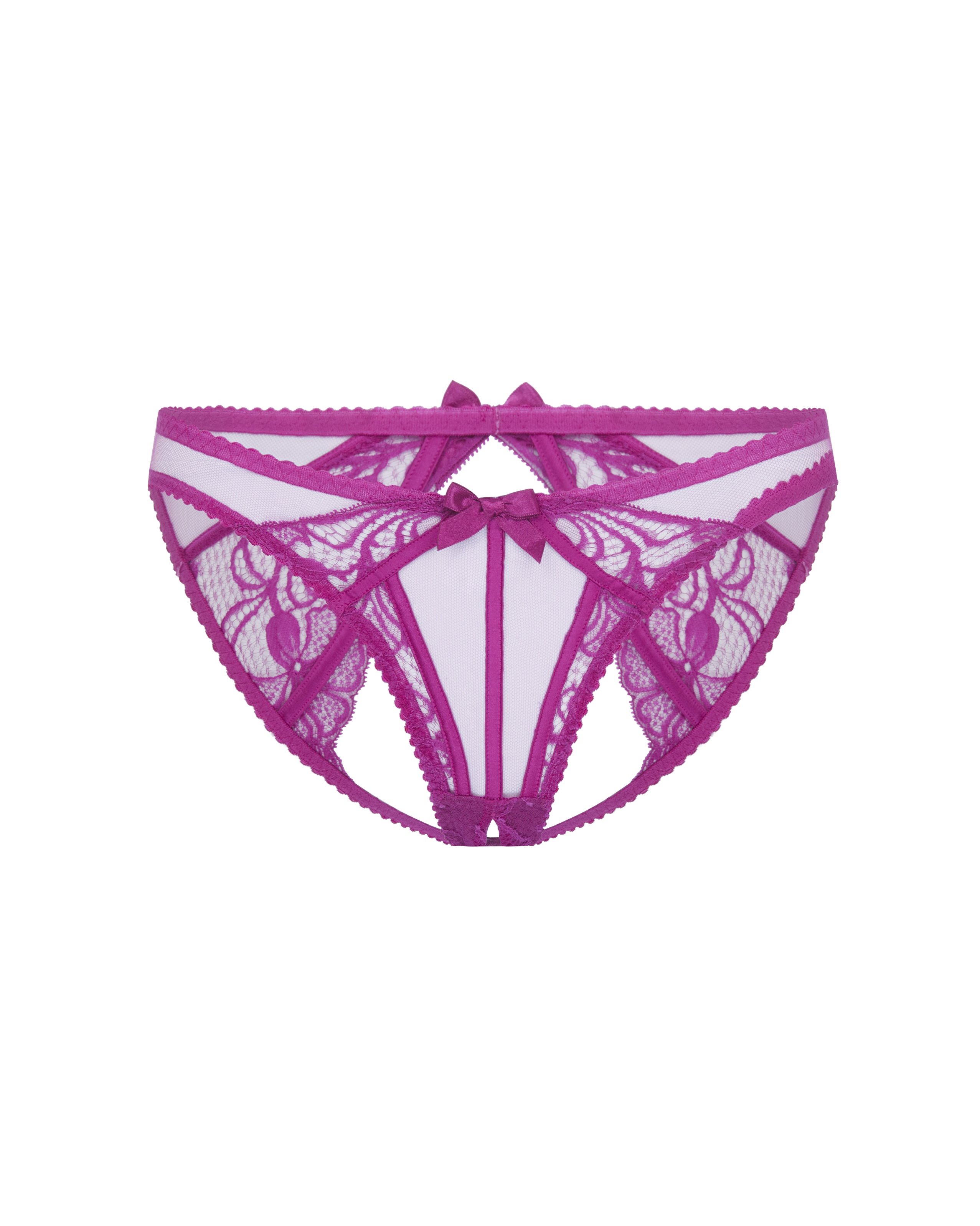 Французские трусы Rozlyn цвета фуксия из прозрачного тюля с веерообразной кружевной вставкой Leavers. Дерзкая открытая ластовица добавляет пикантности. Сочетайте с другими предметами Rozlyn для соблазнительного образа.