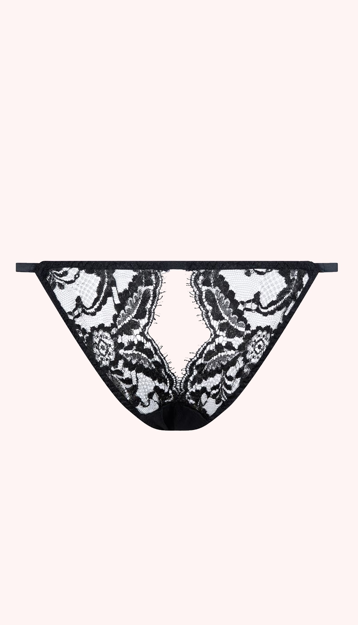 Kendall, как сладкий сон, надолго остается в памяти. Соблазнительные французские трусики с низкой посадкой из полупрозрачного черного тюля декорированы графичной кружевной вышивкой. Сзади основную часть, выполненную в форме стринг, покрывает слой французского кружева ливерс с манящим очаровательным вырезом. Черные сатиновые бантики на талии завершают образ.