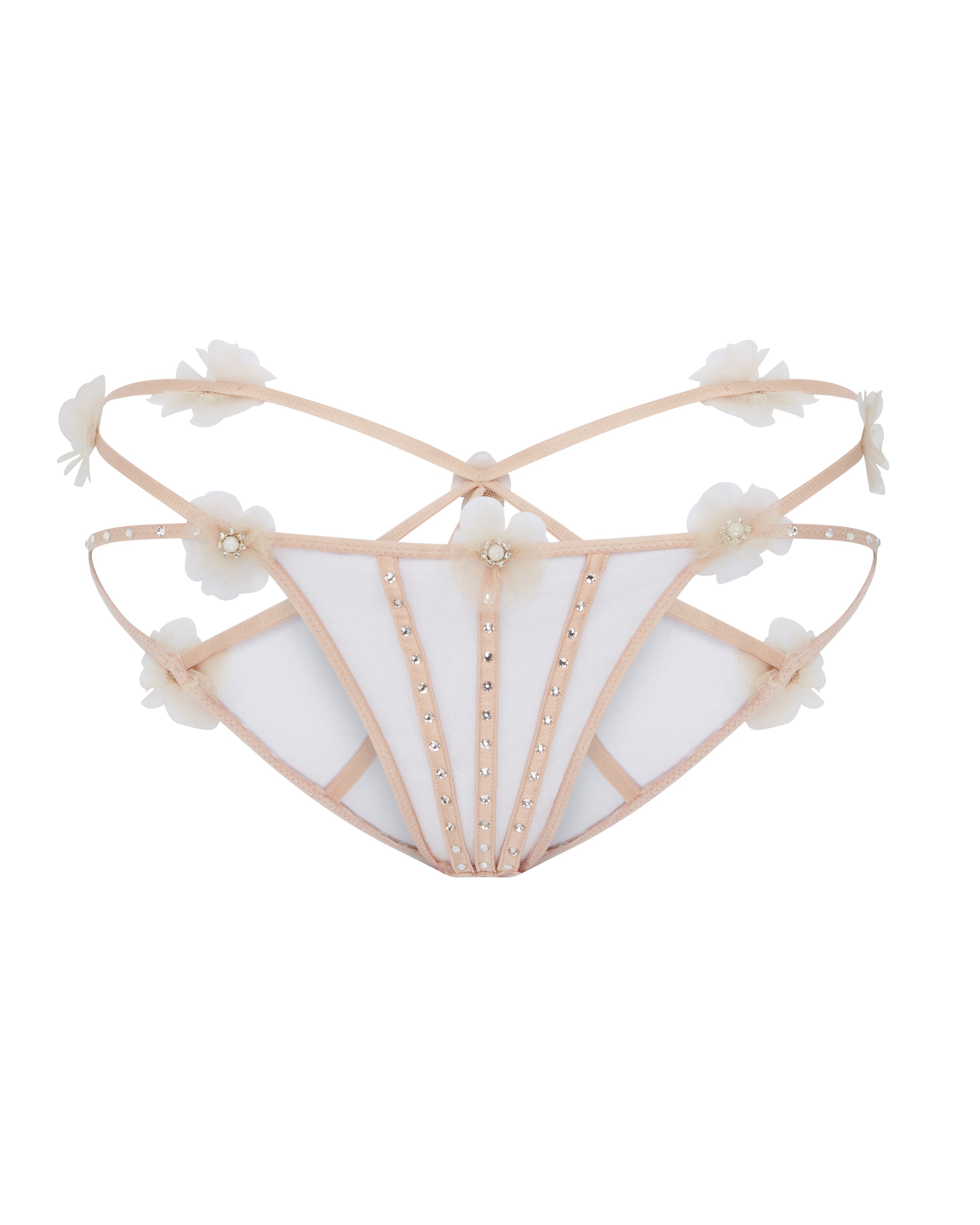 Французские трусы песочного цвета Evangelene изготовлены из прозрачного тюля и декорированы рюшами в виде цветов. Элементы из кристаллов и жемчуга придают изысканности, а открытая ластовица и задняя часть добавляют пикантности. Шелковые вставки и обработка обеспечивают комфорт при носке. Эти трусы станут отличным дополнением к другим элементам коллекции Evangelene для создания мечтательного и романтического образа.