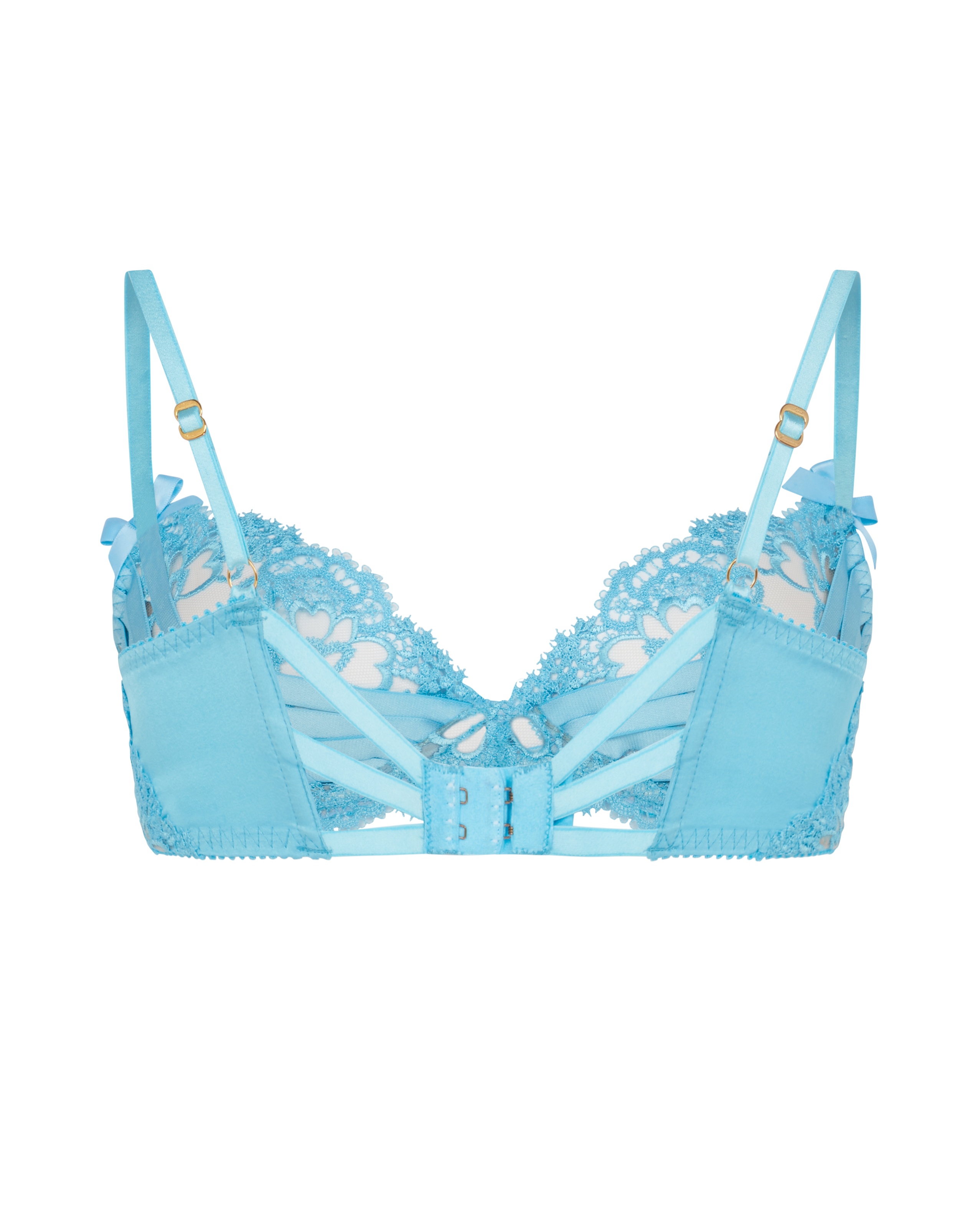 Бюстгальтер Dioni голубого цвета с глубоким вырезом выполнен с использованием швейцарской гипюрной вышивки, созданной лазерной резкой. Замысловатые детали в виде плетеных ремешков расположены в нижней части чашек. Украшен бантом в центре и на верхних точках чашек с подвеской из кристалла Swarovski®. Создайте ослепительный образ с полным комплектом Dioni.
