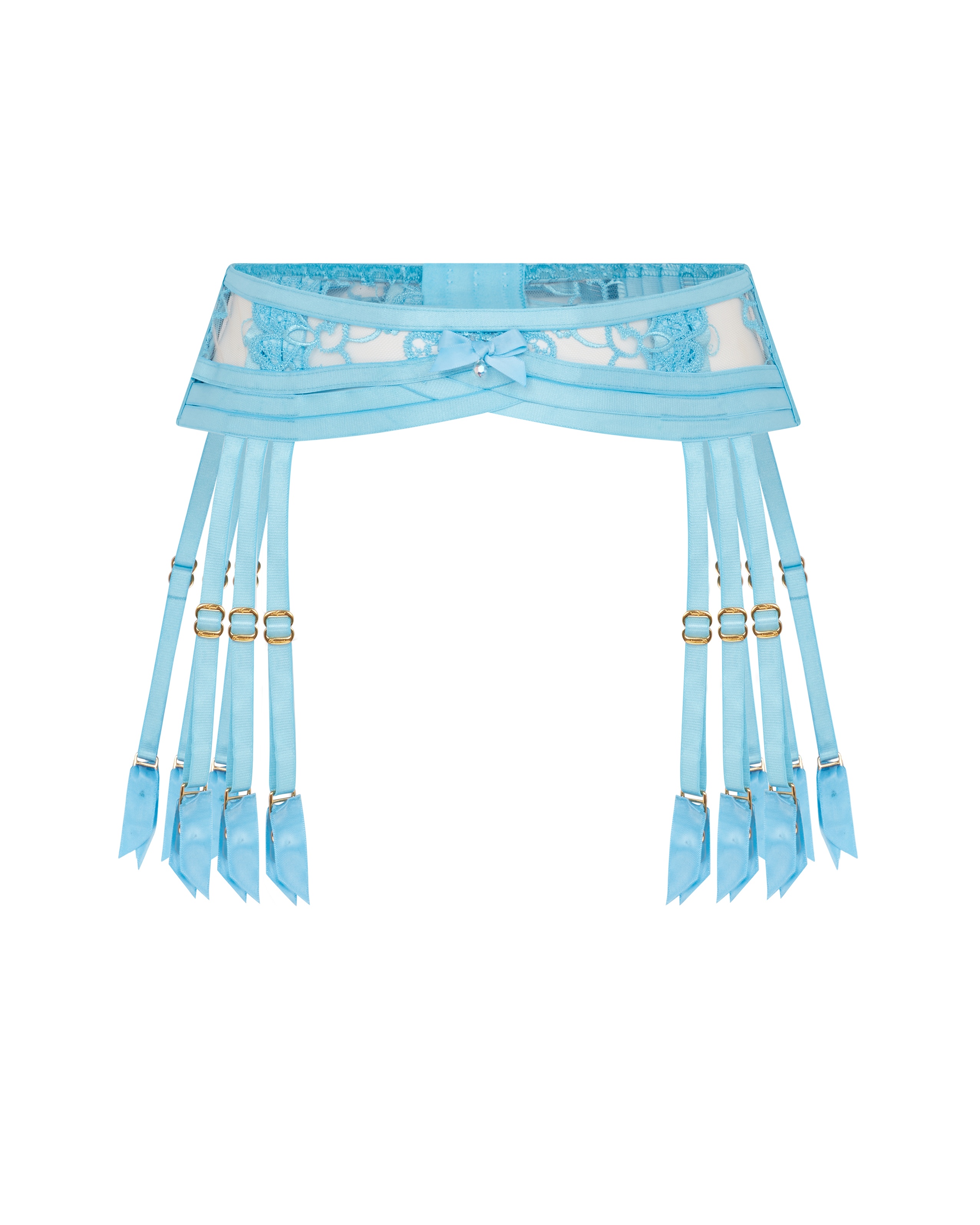 Пояс для чулок Dioni голубого цвета украшен швейцарской гипюрной вышивкой, созданной лазерной резкой. Подвеска из кристалла Swarovski® на талии. Подвязки с позолоченной фурнитурой. Возглавьте соблазнительный образ в полном комплекте Dioni.