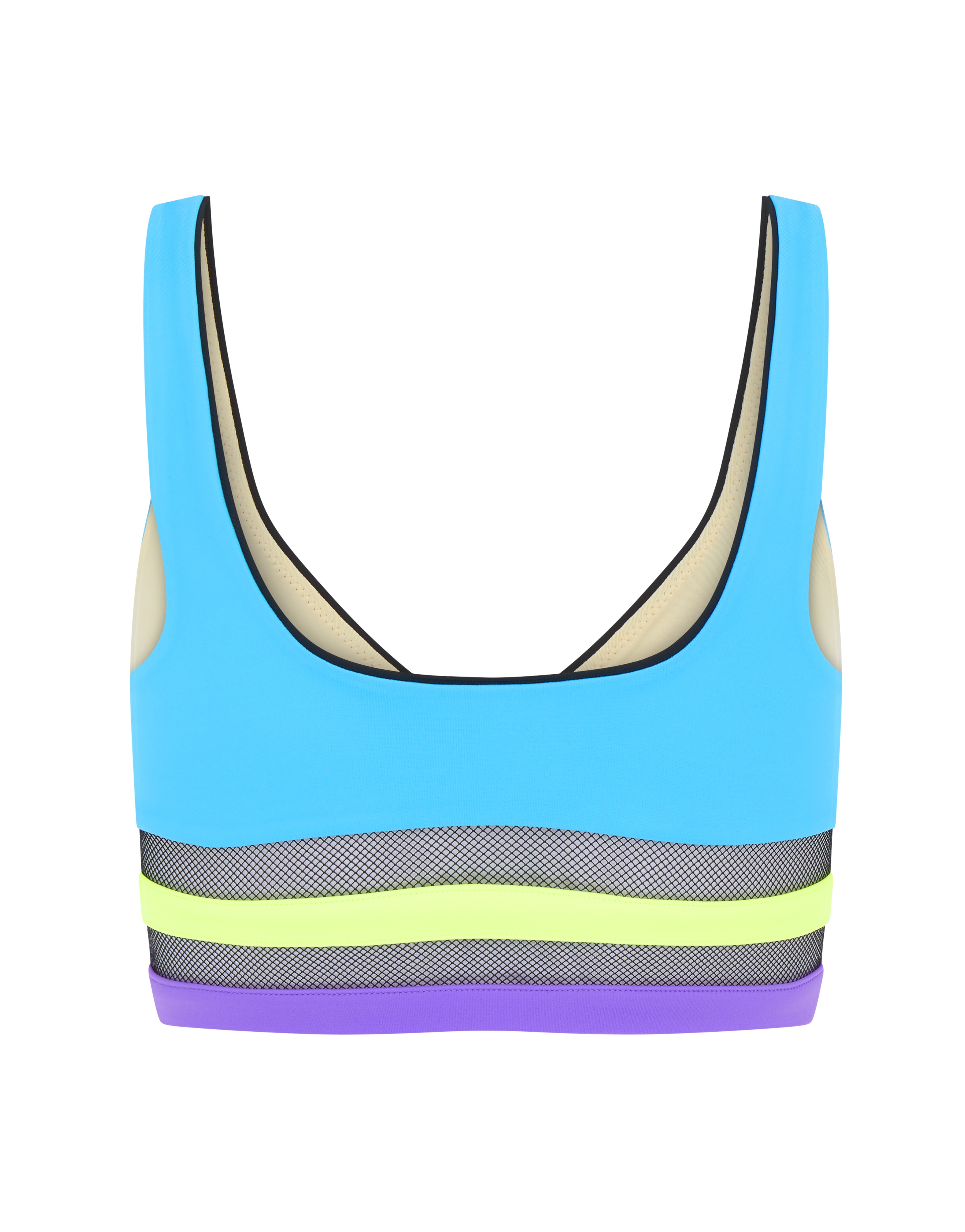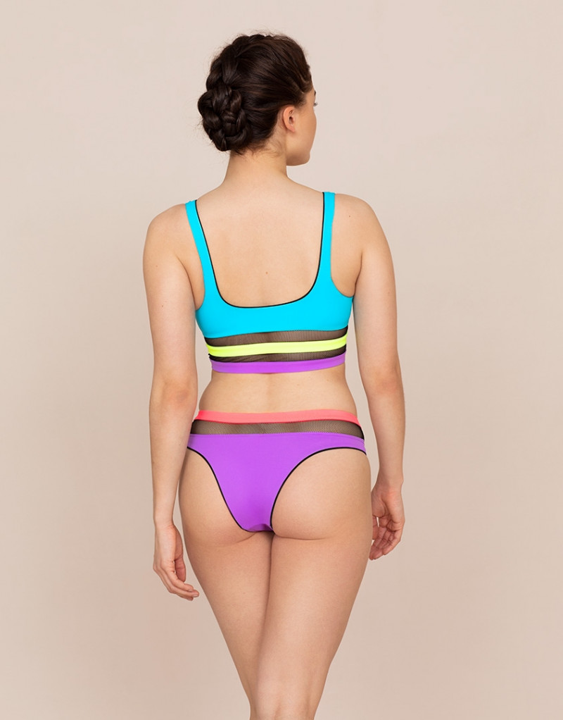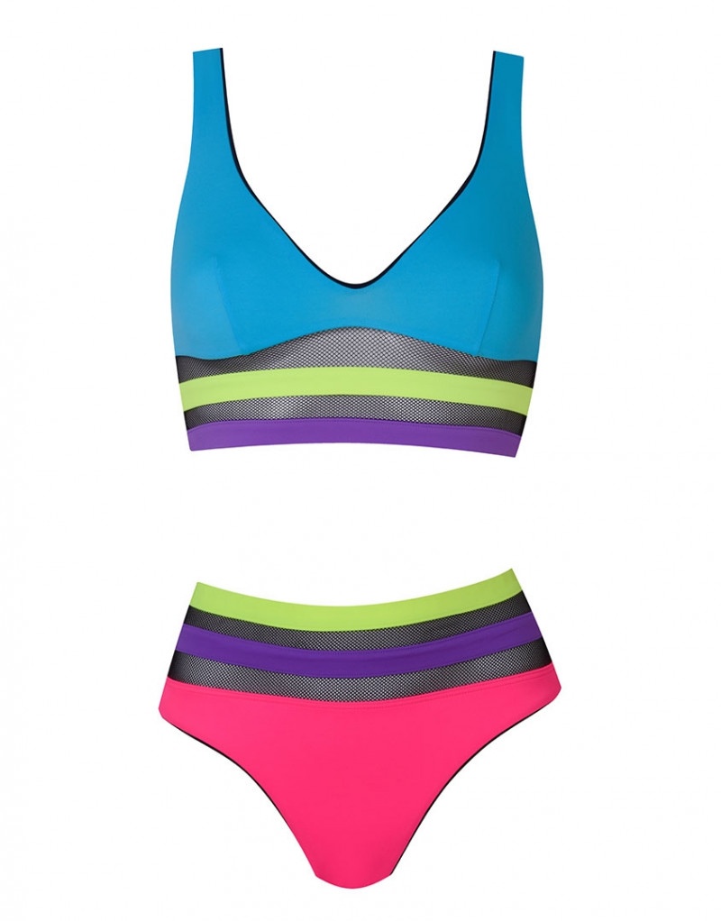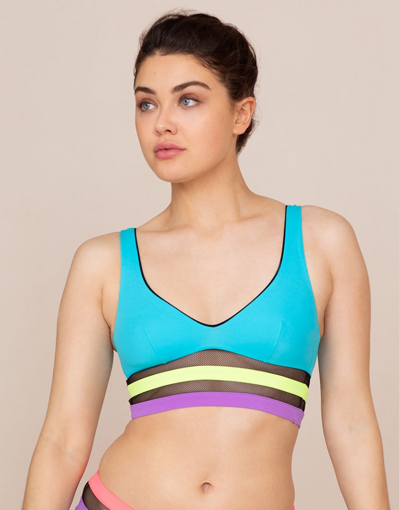 Ощутите летний зной с Zenaya - пляжной коллекцией, в которой невероятно насыщенные оттенки сочетаются с изящными линиями. Яркий голубой бюстгальтер бикини с формованными мягкими чашками и глубоким декольте обрамлен снизу черной сеткой с эффектными неоновыми полосками, создающими спортивный силуэт. Эффектная модель из эластичной ткани.