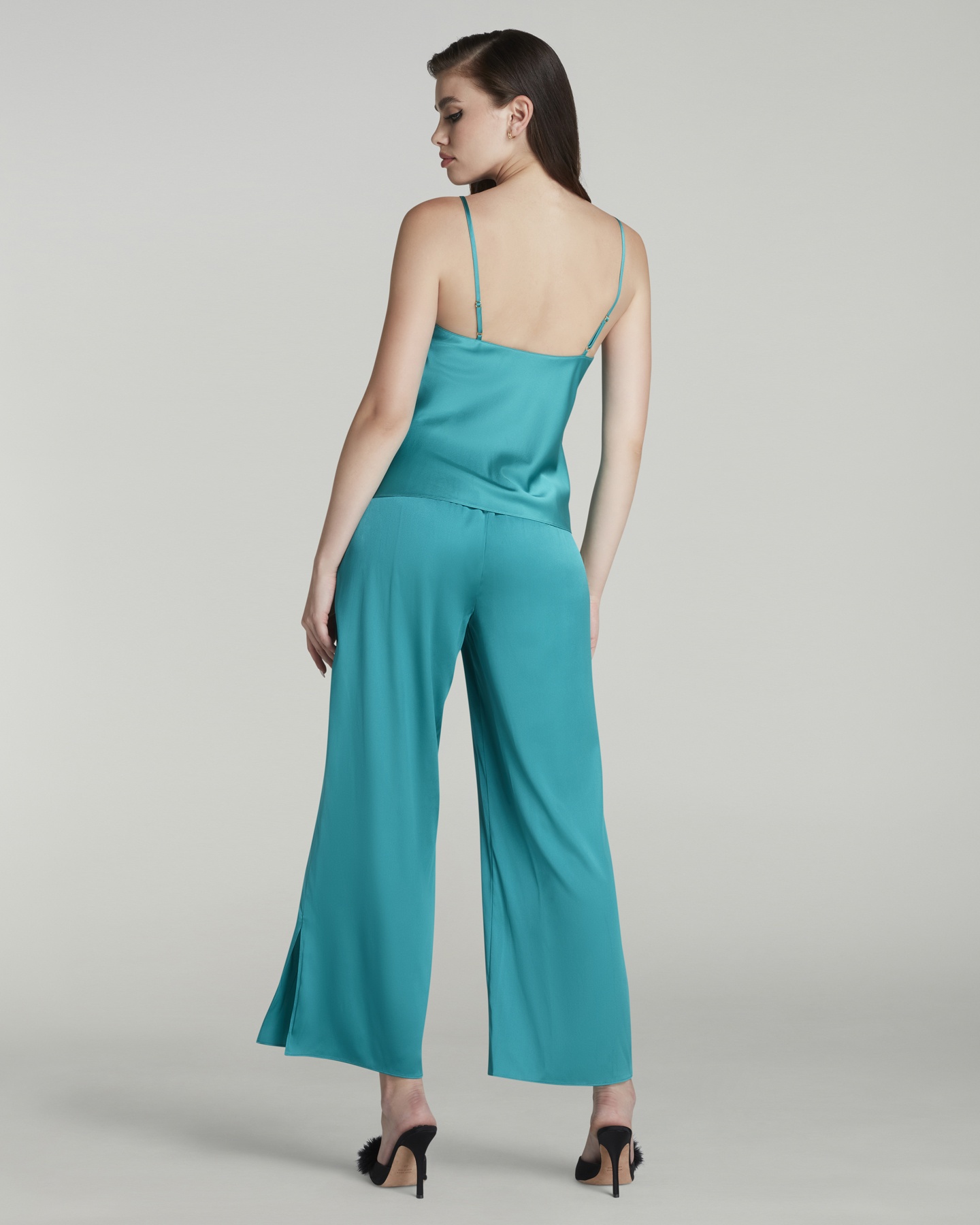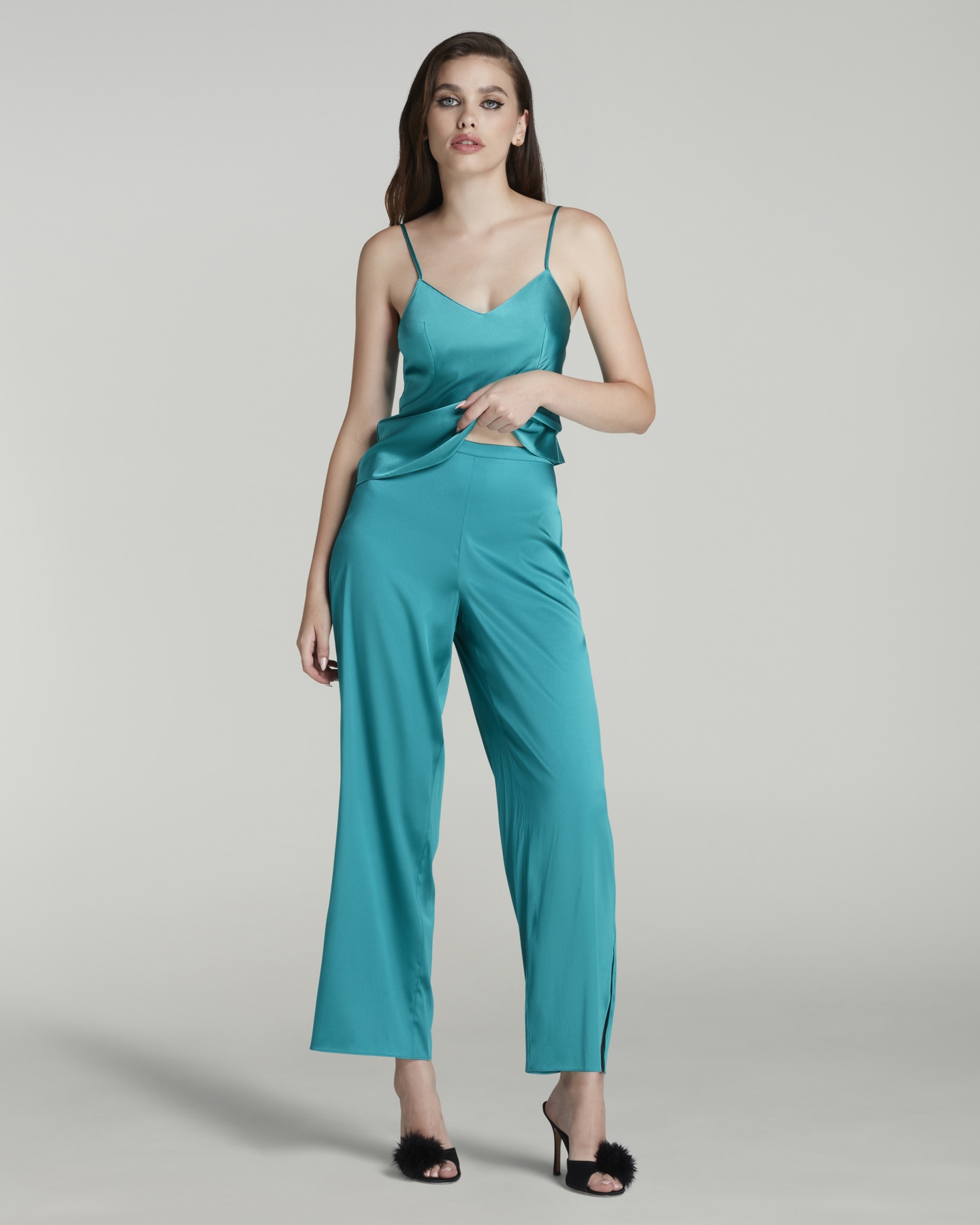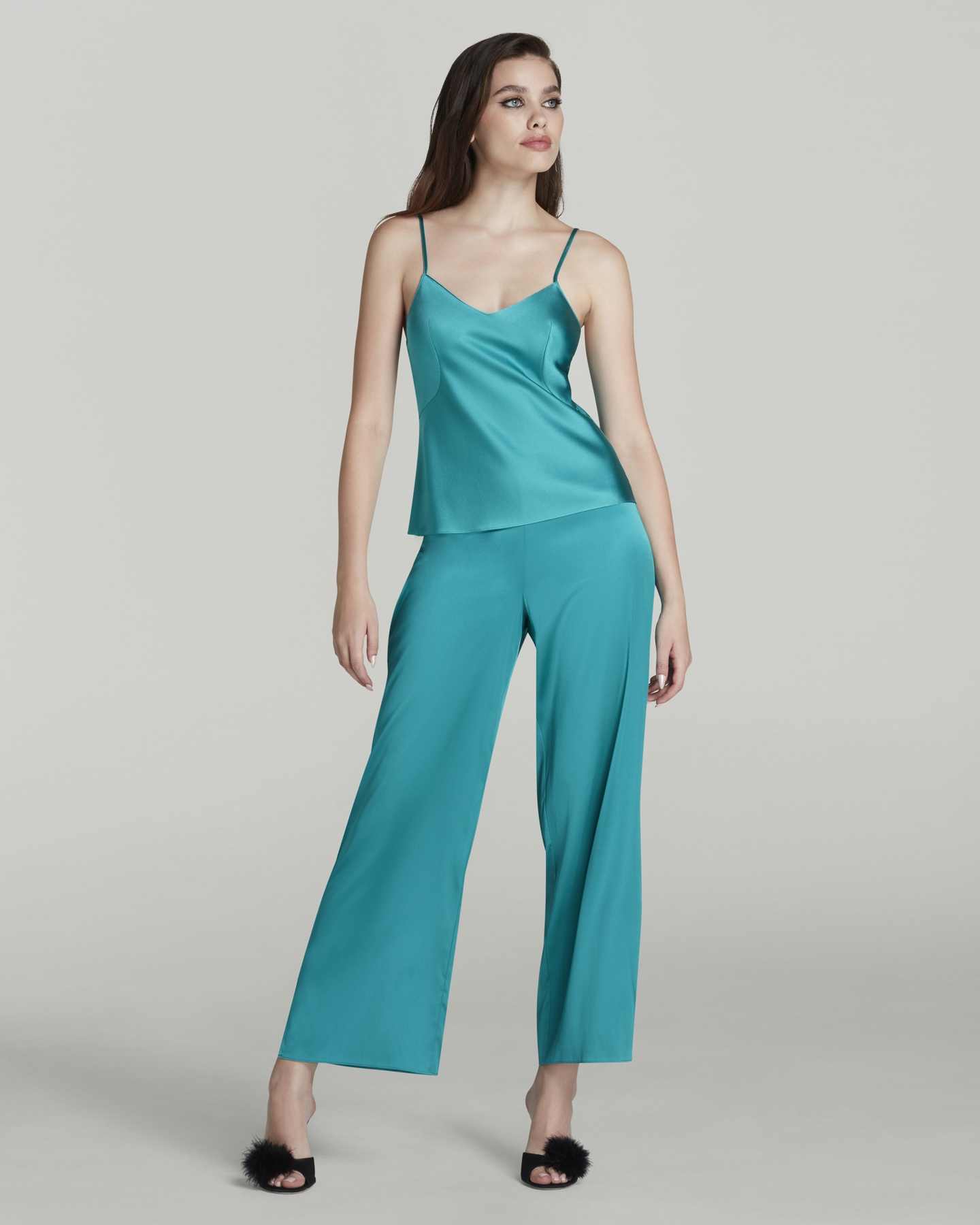 Пижамные брюки Arlette голубого цвета изготовлены из шелкового атласа с небольшим добавлением эластичных волокон для комфорта. Пояс с частично эластичной вставкой обеспечивает удобную посадку. На задней части вышит логотип AP. Сочетайте с камисолью Arlette для создания элегантного образа для сна.