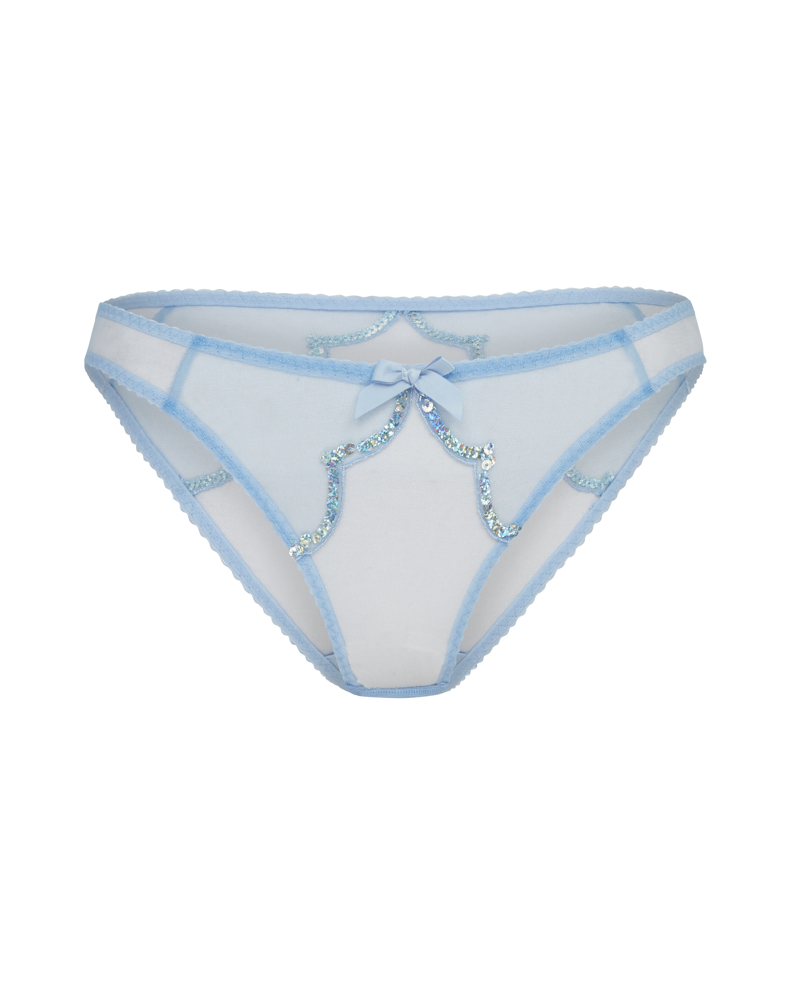 При пошиве брифов из коллекции Lorna Party в качестве основы был выбран сетчатый тюль нежно-голубого цвета. Фестончатая окантовка на передней и задней панелях декорирована мерцающими пайетками в тон. Классическая модель украшена атласным бантиком на поясе. Завершите образ с бюстгальтером и поясом для чулок из этой же коллекции.