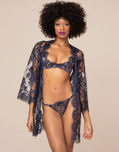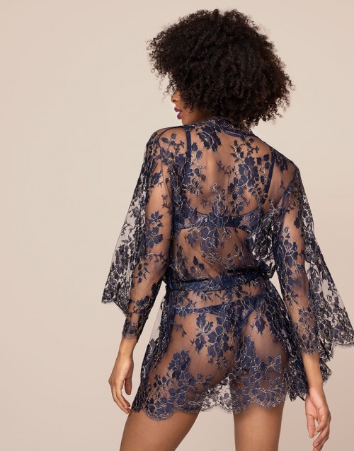 Роскошная Mimosa - воплощение романтических грез. Кимоно из персикового кружева украшает контрастный верхний слой темно-синего и золотого французского кружева Ливерс. Внутренняя подкладка из шелкового сатина, мягкая кружевная оторочка, широкие рукава и пояс-лента завершают утонченный образ. Сочетайте с комплектом белья Mimosa.