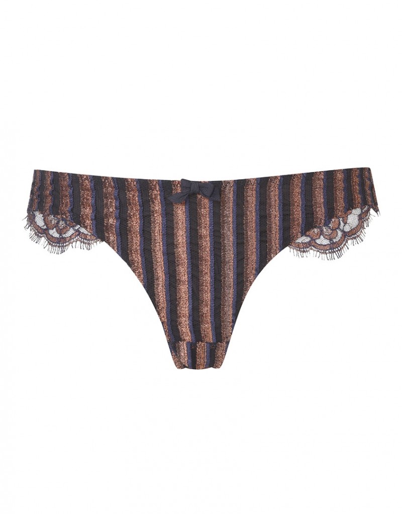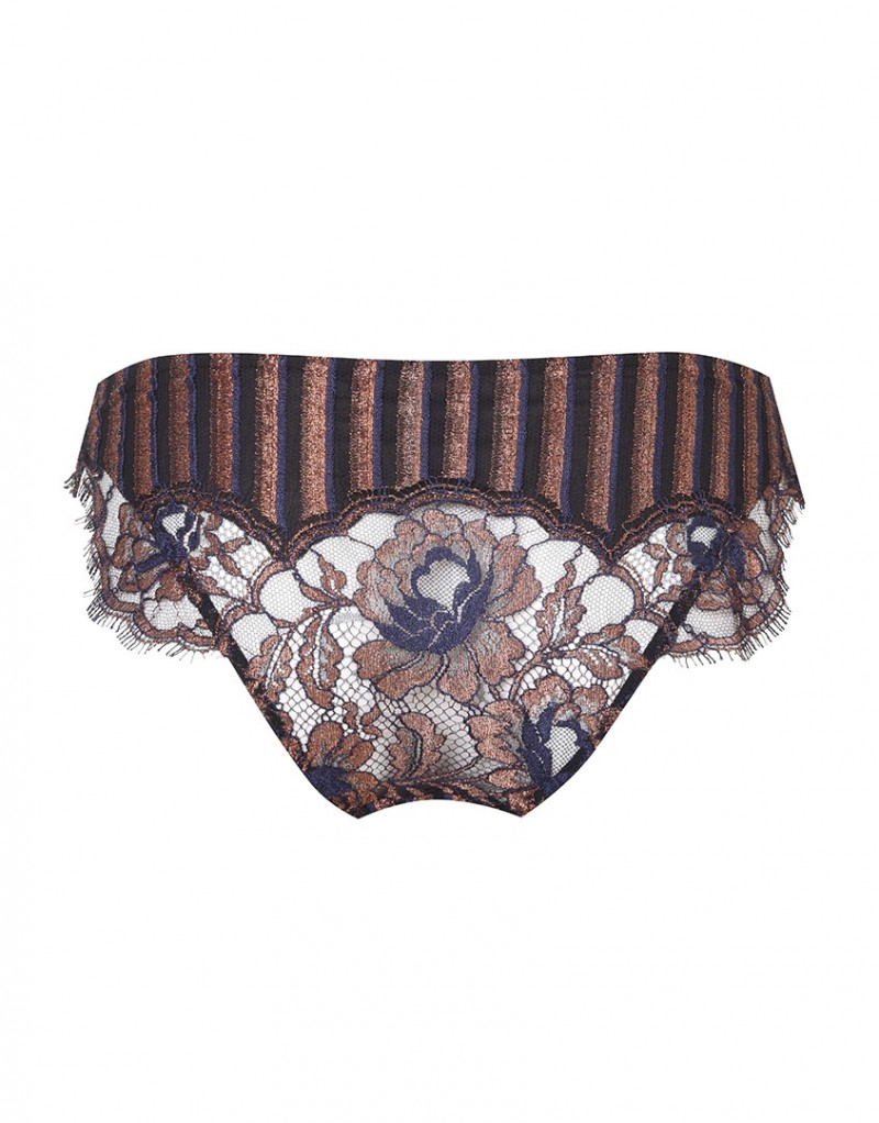 Будьте экстраординарны вместе с Sapphira! Шикарные трусики сияют полосками сверкающего люрекса бронзового и темно-синего оттенка. Панели ресничного кружева на бедрах и ягодицах завершают образ. Детали: сочетайте с коллекцией Sapphira. Эффектный и роскошный комплект белья в кутюрном стиле. Материалы и уход: 100% полиамид. Темно-синие полоски: 100% вискоза. Бронзовые полоски: 79% полиамид, 21% металлизированная фибра. Подкладка: 90% шелк, 10% эластан. Рекомендована раздельная ручная стирка и бережная сушка.