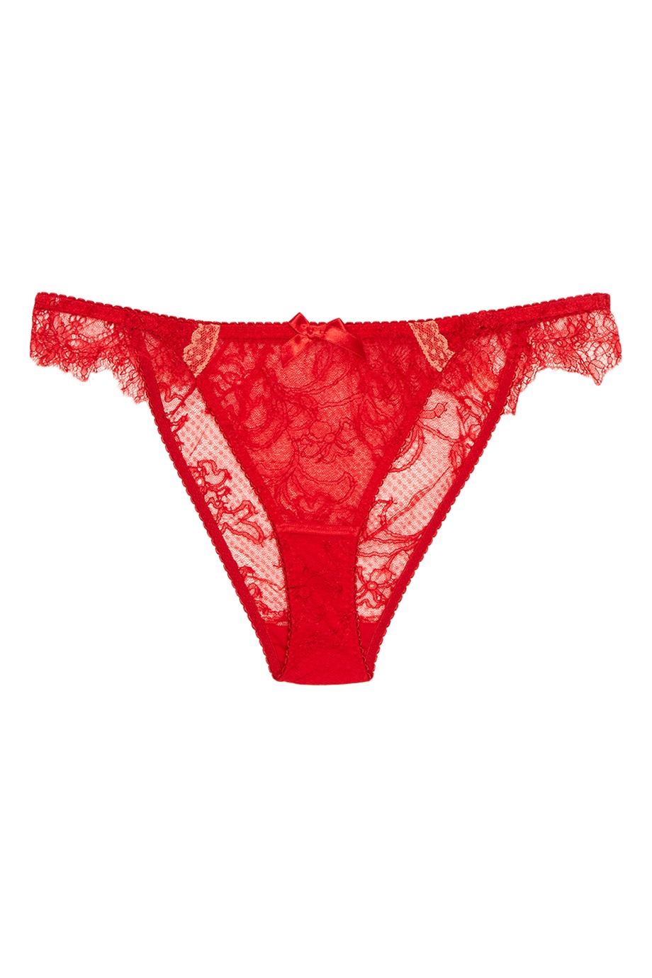 Новая кружевная коллекция Alannah сделает каждый день незабываемым. Трусики из двуслойного красного кружева с соблазнительной оторочкой на бедрах украшены продольными бледно-розовыми лентами спереди и сзади. Петельная отделка по краю и красный бантик на талии завершает образ.
