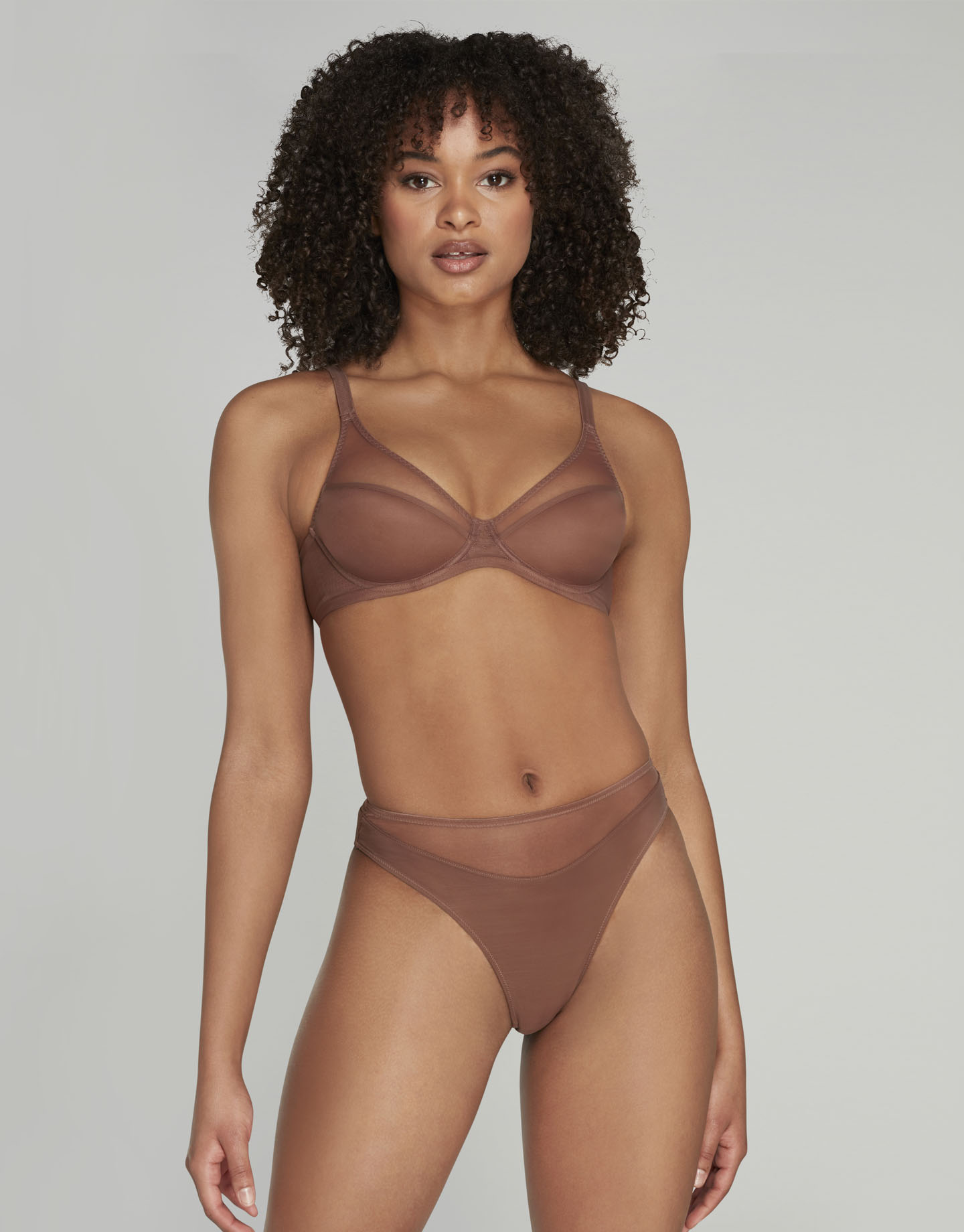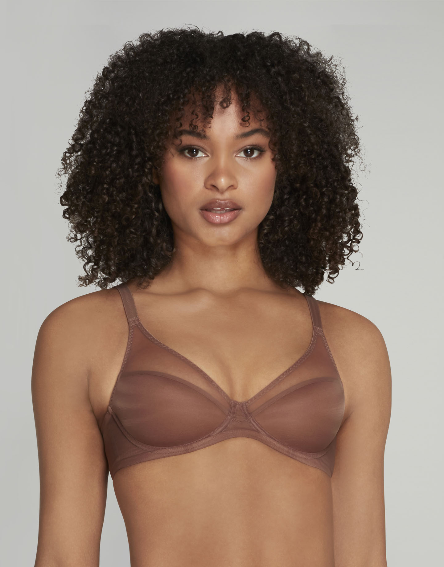 Бюстгальтер Lucky с мягкими чашечками выполнен из бельгийского тюля цвета мокка. Переливающаяся текстура тонкой ткани дополнена уплотнением с легким эффектом пуш-ап. Верхняя треть чашечек оставлена без подкладки для создания полупрозрачного эффекта, характерного для коллекции Lucky. Поддержка на косточках усилена слоем микрофибры под грудью.