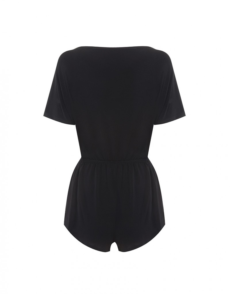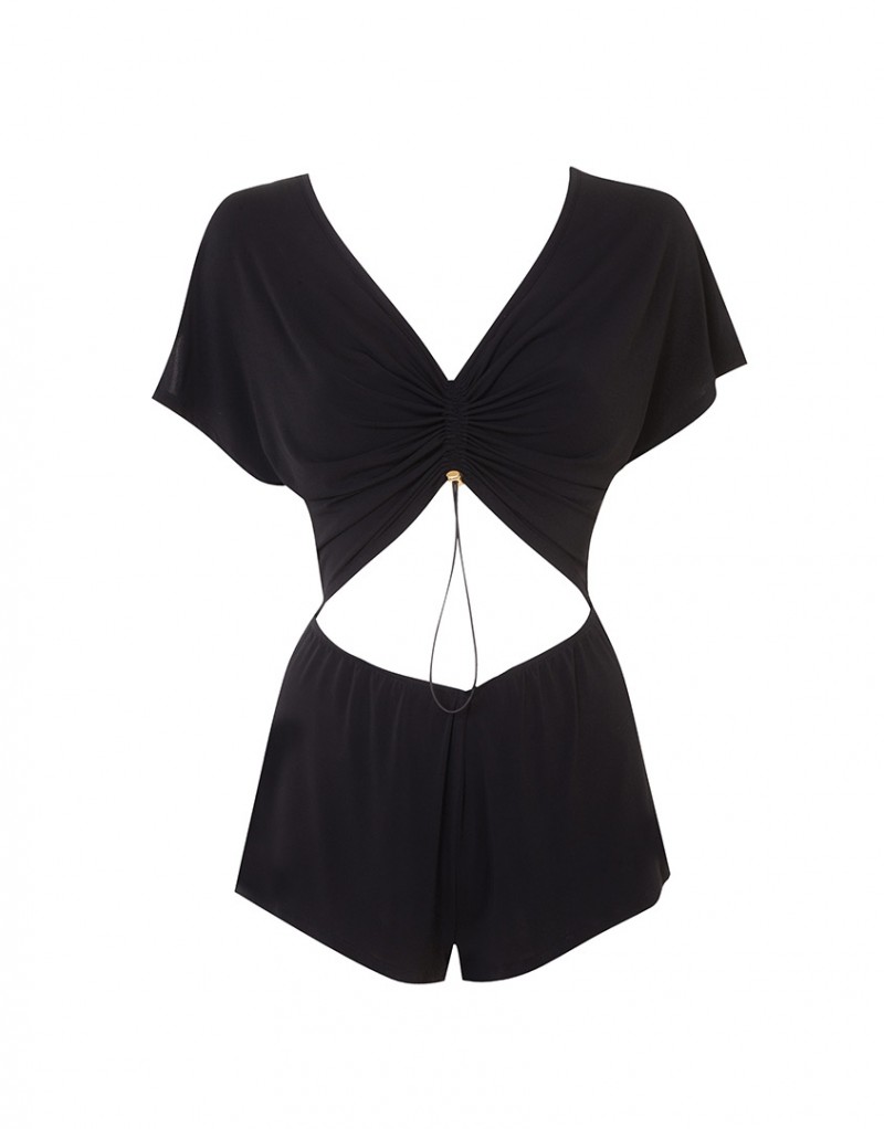 Соблазнительный черный комбинезон из мягкого материала украшает широкий V-образный вырез сзади и стянутая оборка ткани над обнаженной поясницей.