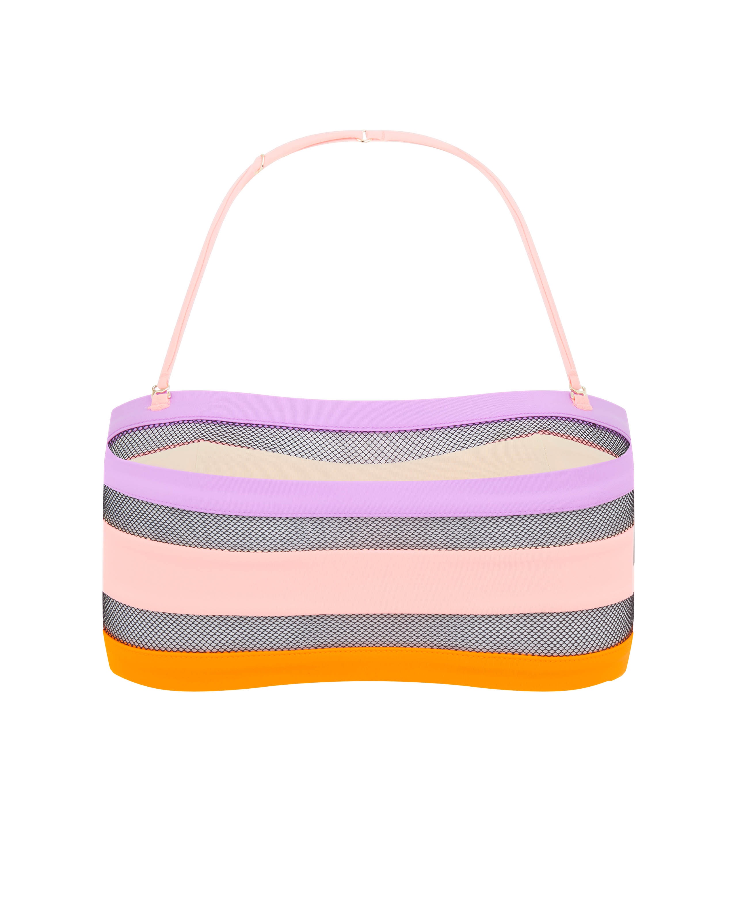 При создании топа купальника Zenaya была использована итальянская эластичная ткань, разработанная специально для плавания. Модель бандо с чашками мягкой формовки и съемными бретелями. Яркие полосы кораллово-розового, сиреневого и оранжевого цветов создают контраст с мягкой черной сеткой. Чтобы создать привлекательный и эффектный образ сочетайте с плавками из этой же коллекции.
