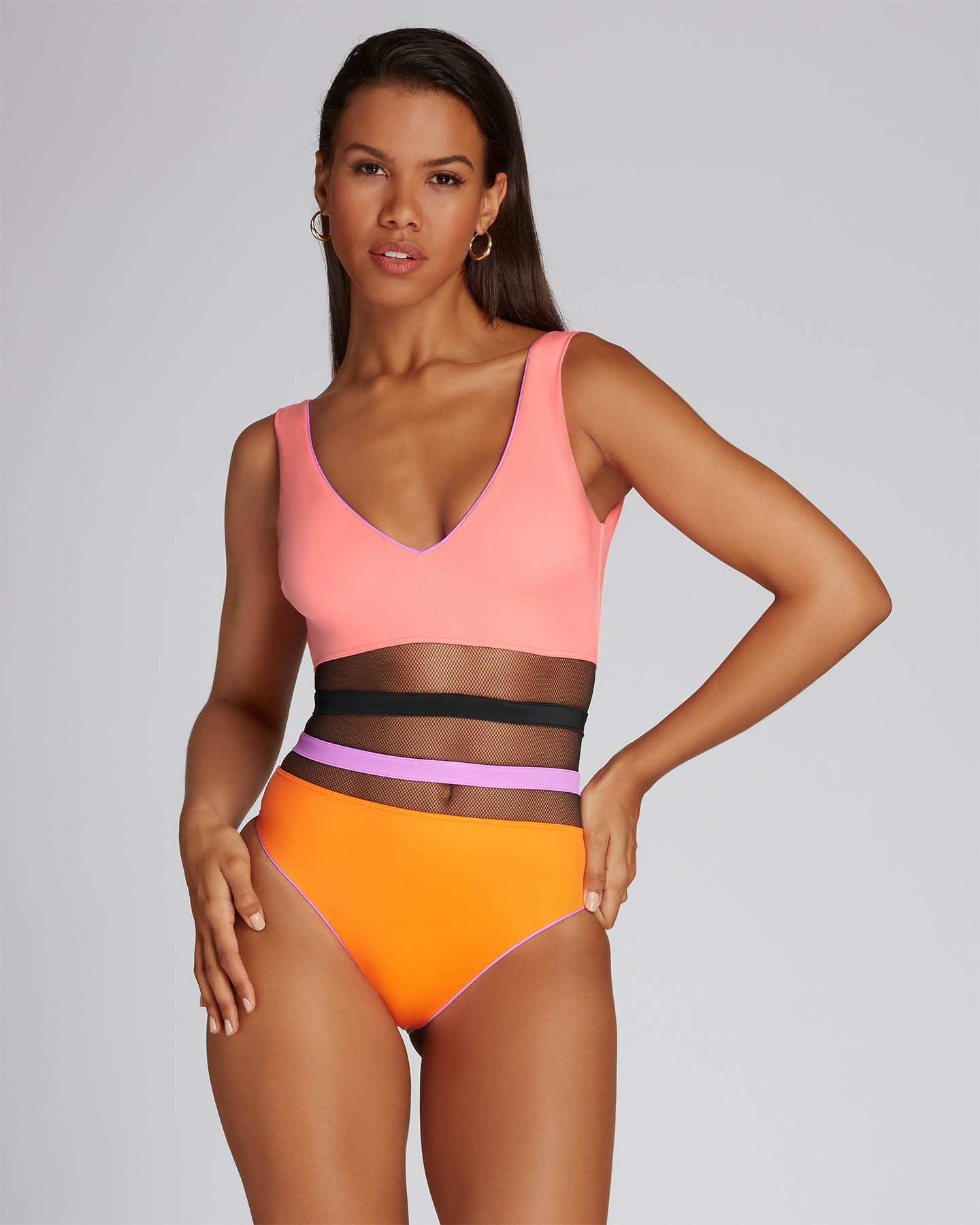 При создании слитного купальника Zenaya была использована эластичная ткань для плавания из Италии кораллово-розового, оранжевого, сиреневого и черного цвета. Модель в спортивном стиле с V-образным вырезом спереди и низким овальным сзади визуально удлиняет ноги. Яркие цветные полосы контрастируют с мягкой черной сеткой, создавая привлекательный и эффектный образ.