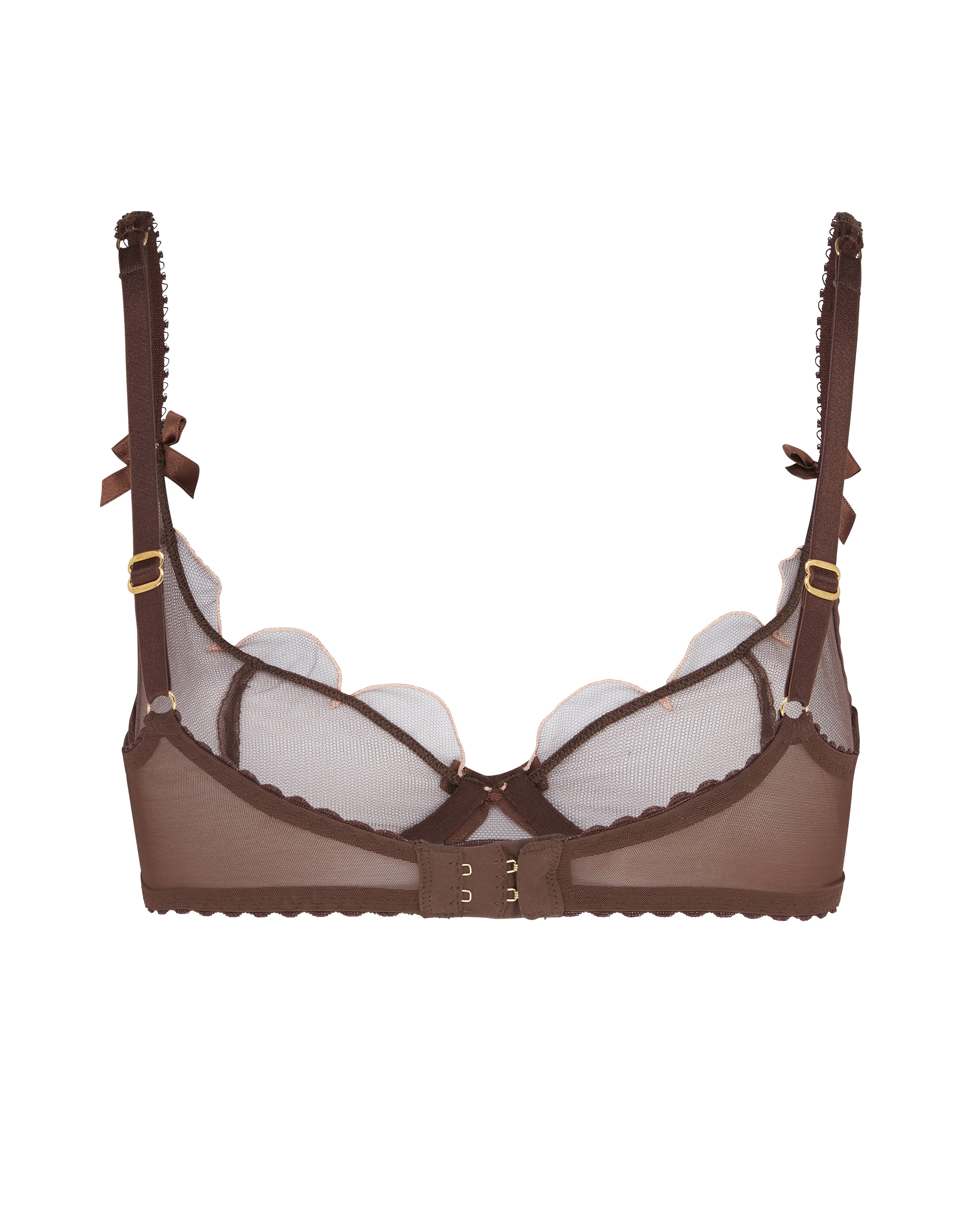 Бюстгальтер Lorna из коричневого полупрозрачного тюля с фестончатым вышитым краем персикового цвета — классика Agent Provocateur. Модель с мягкими чашечками на косточках и регулирующимися бретелями. Бюстгальтер украшен бантами с миниатюрными розочками. В дополнение подберите трусики Lorna.