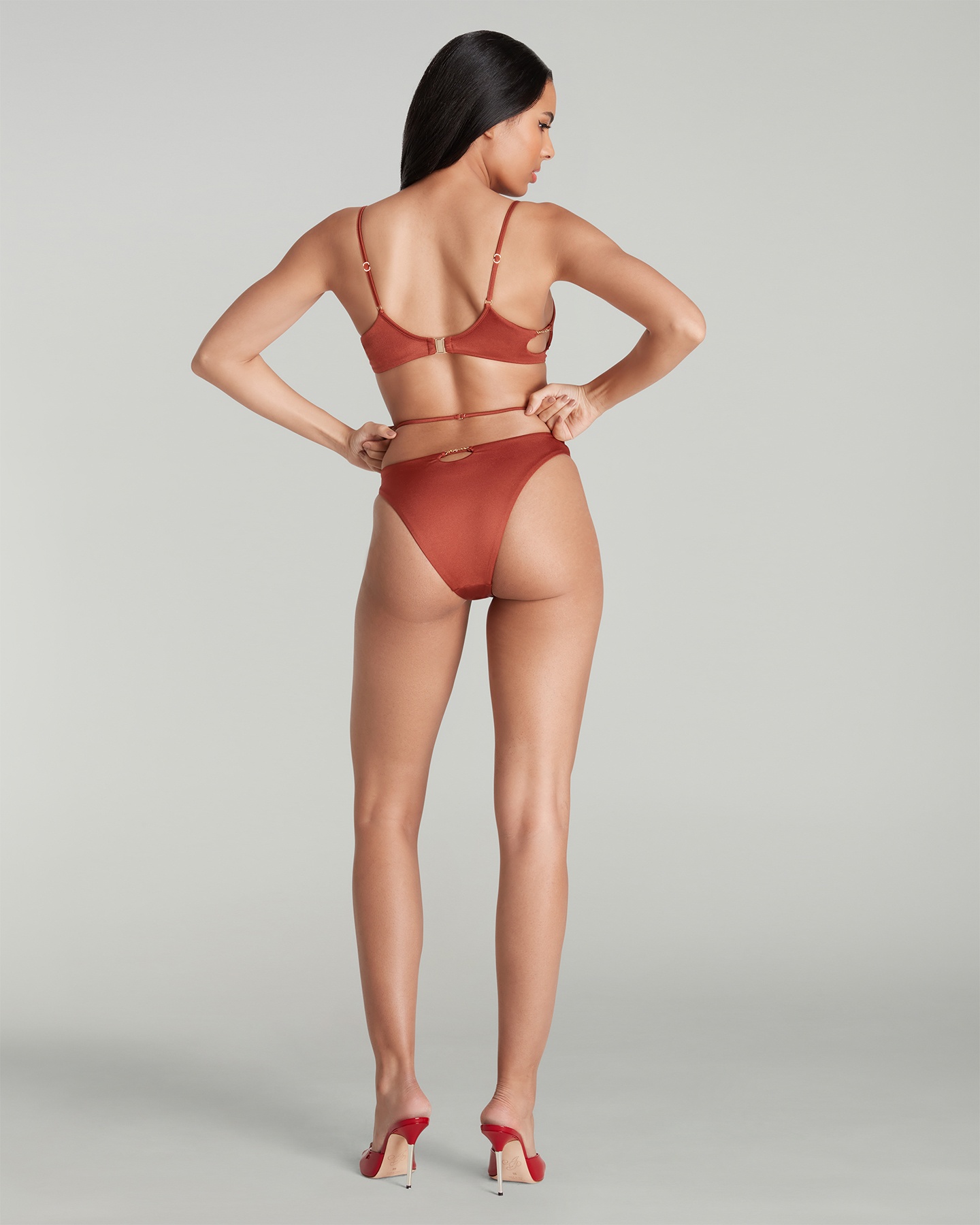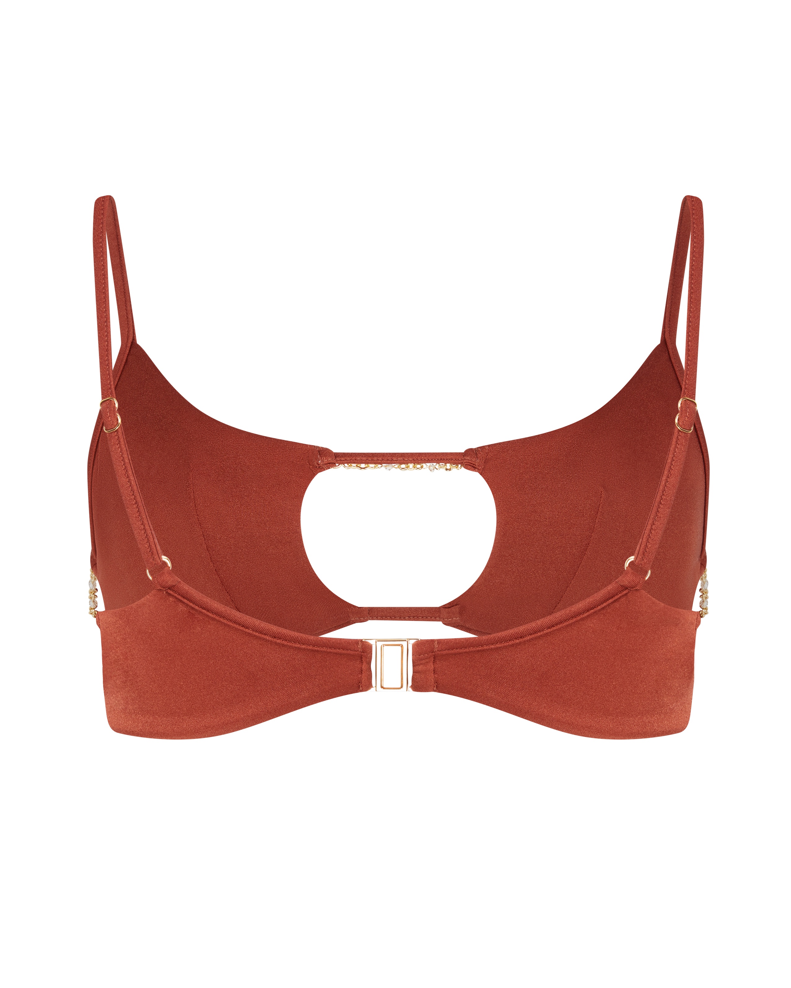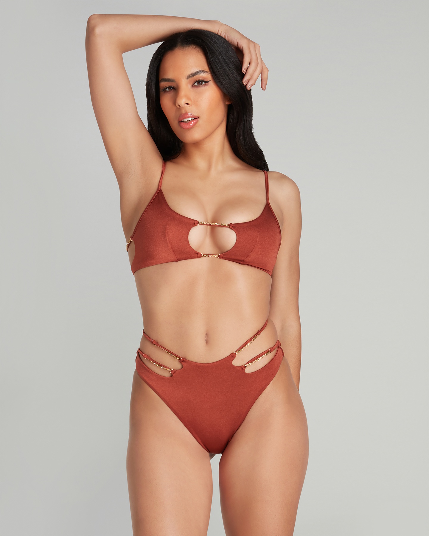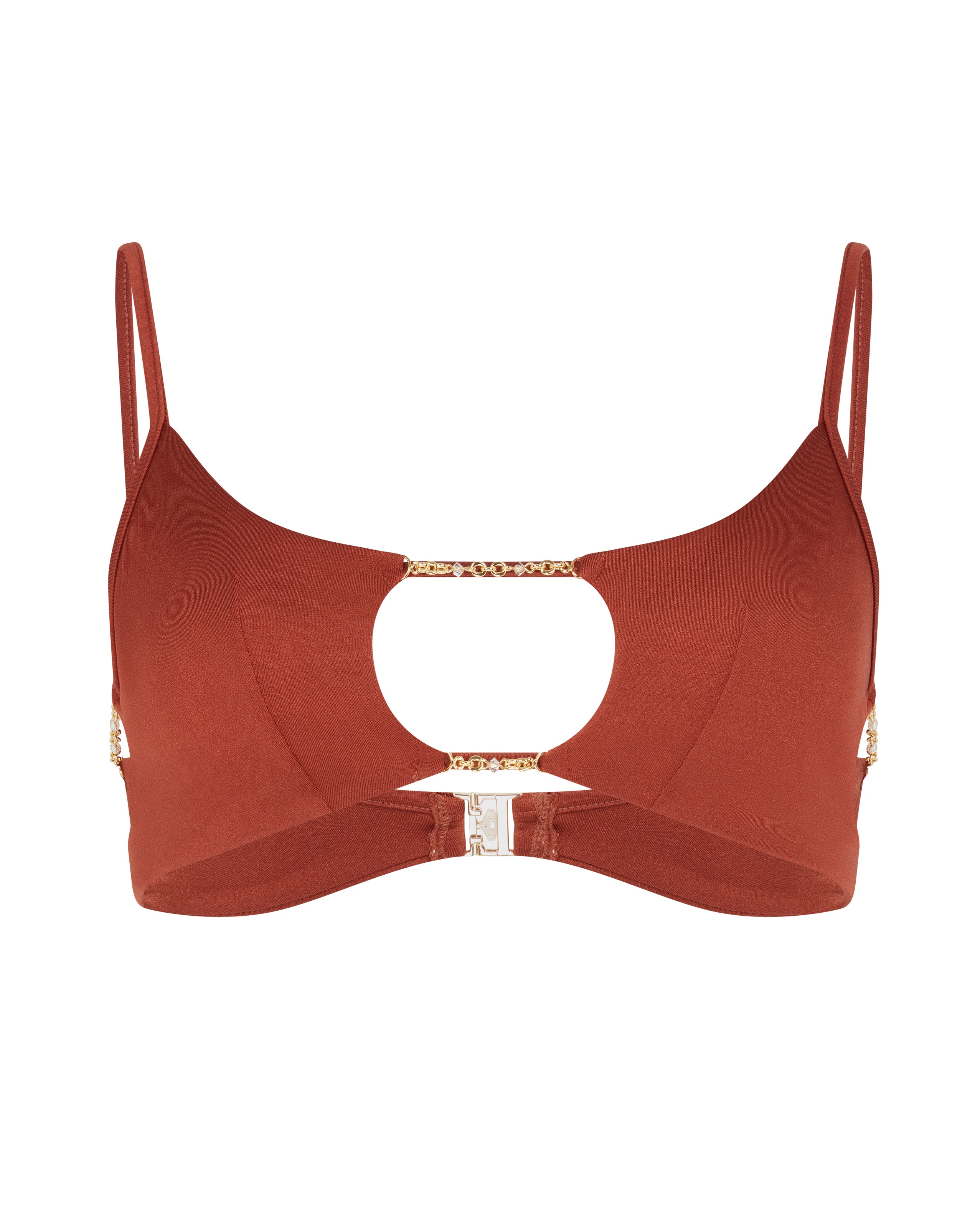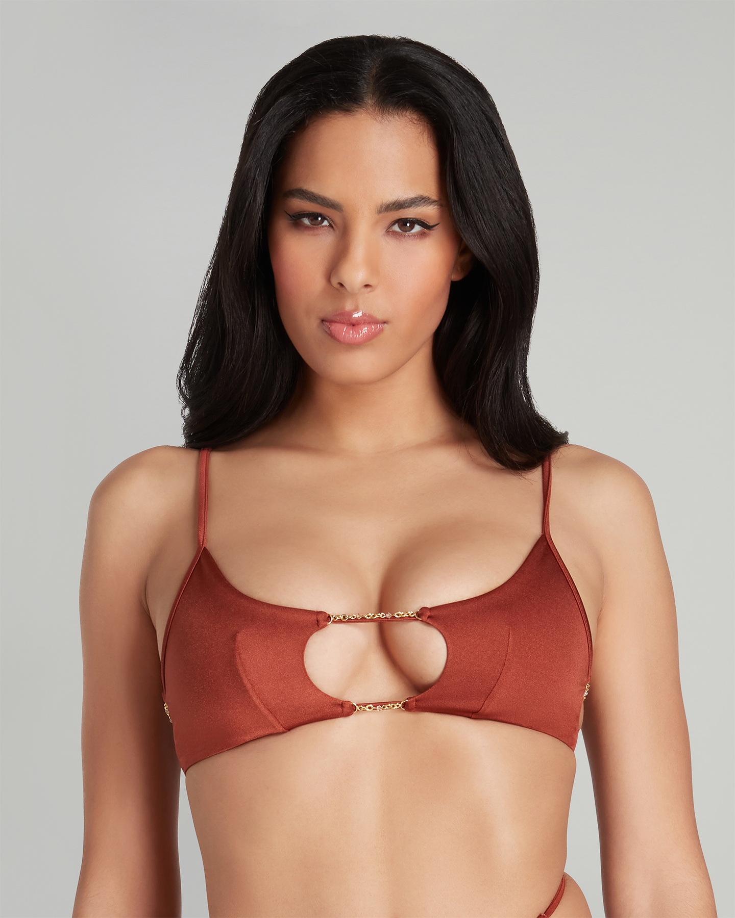 Топ купальника Christiana коричневого цвета из итальянской купальной ткани с легким блеском. Дерзкие вырезы, украшенные цепочками под золото и сверкающими кристальными бусинами. Фурнитура с покрытием из настоящего золота имеет водо- и термостойкое покрытие. Сочетайте с плавками Christiana для создания смелого образа.