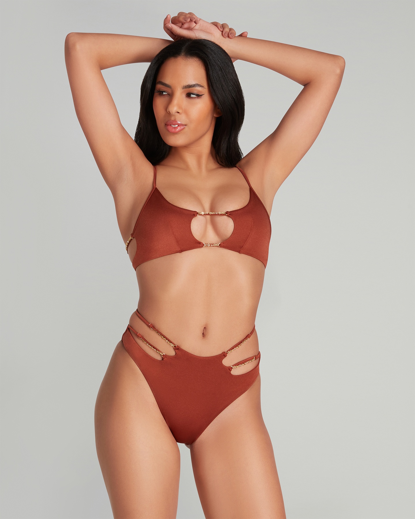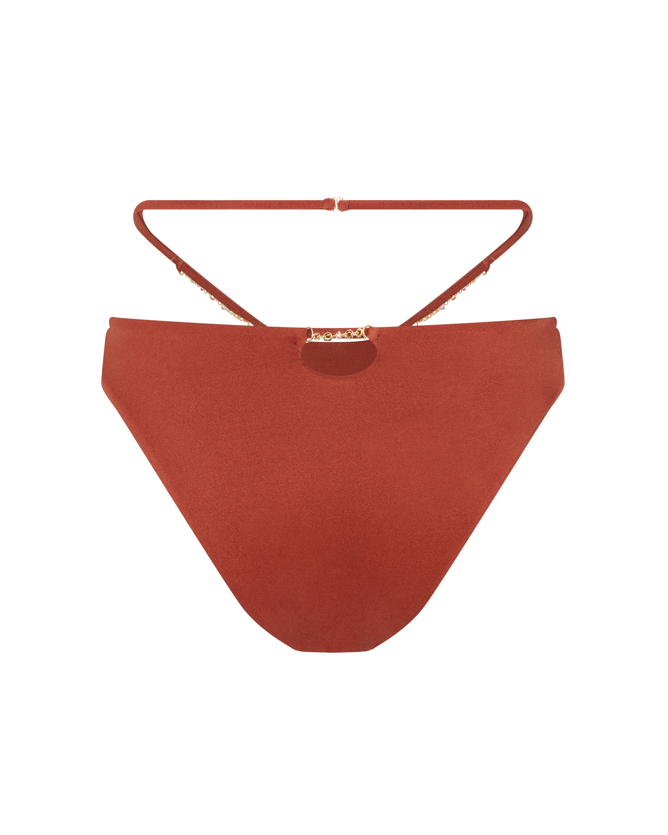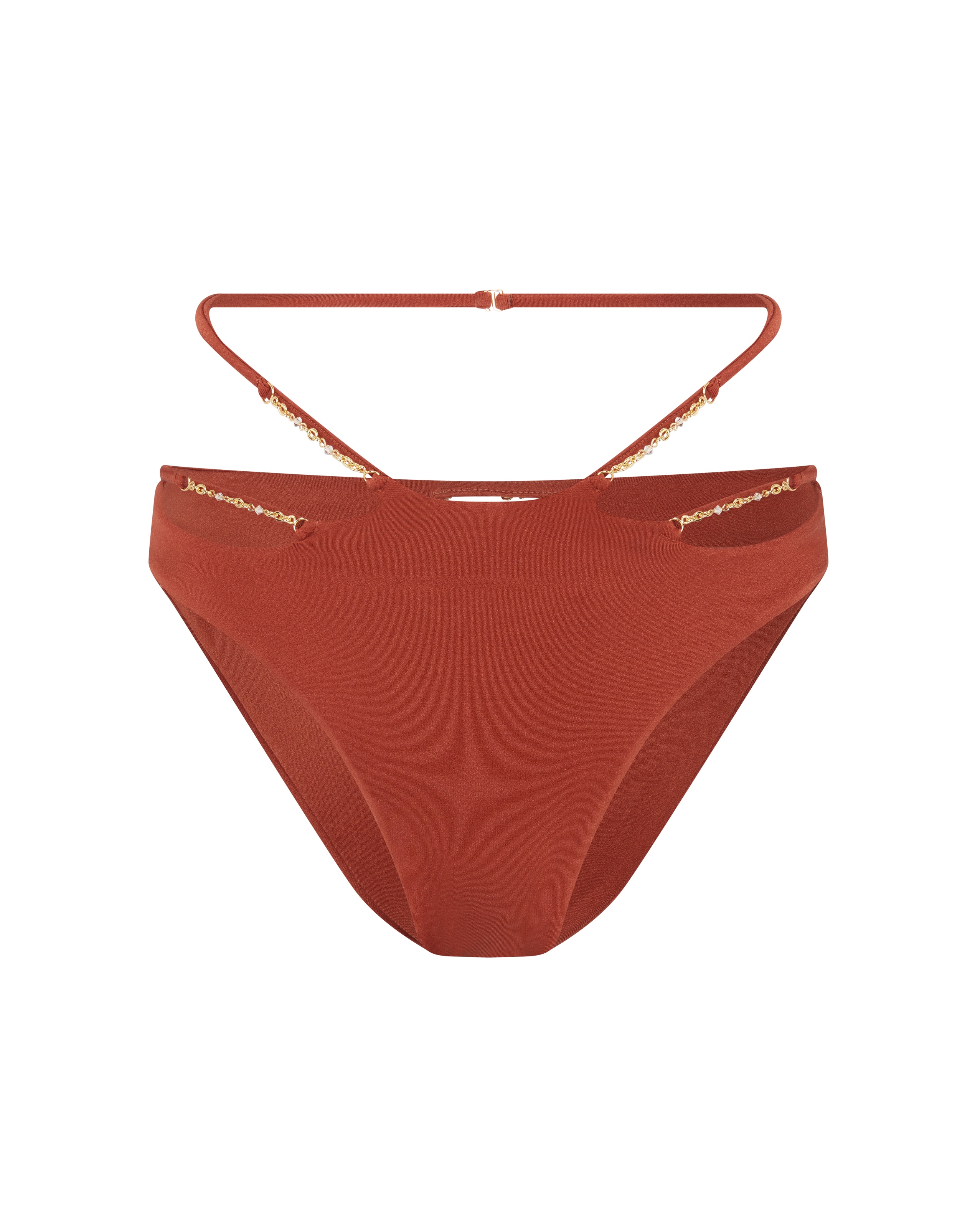 Плавки купальника Christiana коричневого цвета из итальянской купальной ткани с легким блеском. Дерзкие вырезы, украшенные цепочками под золото и сверкающими кристальными бусинами. Фурнитура с покрытием из настоящего золота имеет водо- и термостойкое покрытие. Сочетайте с топом Christiana для дерзкого образа.