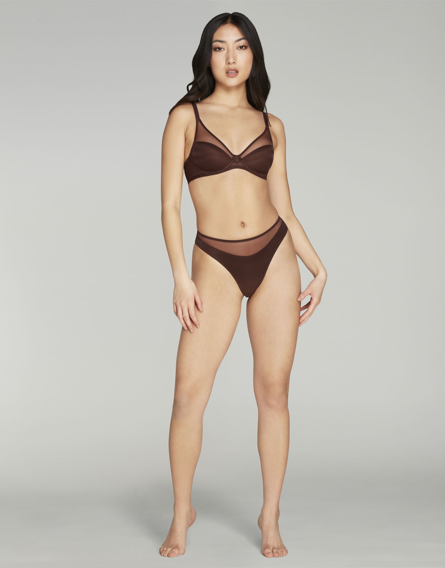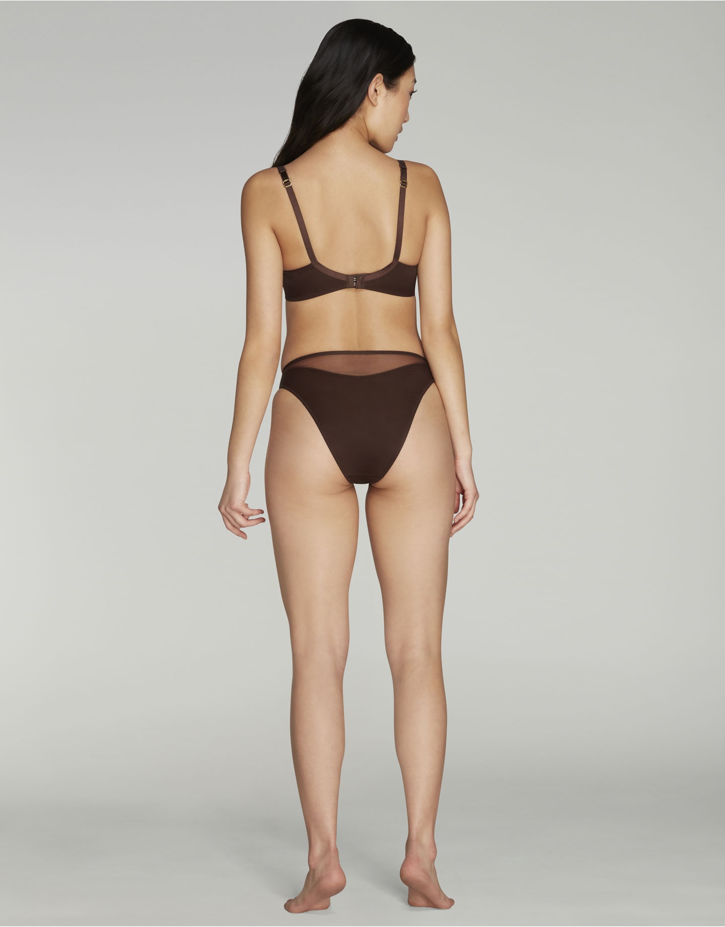 Трусики Lucky шоколадного цвета выполнены из эластичного тюля. Высокая посадка дополнена полупрозрачными вставками сверху. Классическая, чуть углубленная линия бикини обработана тонкими эластичными швами.