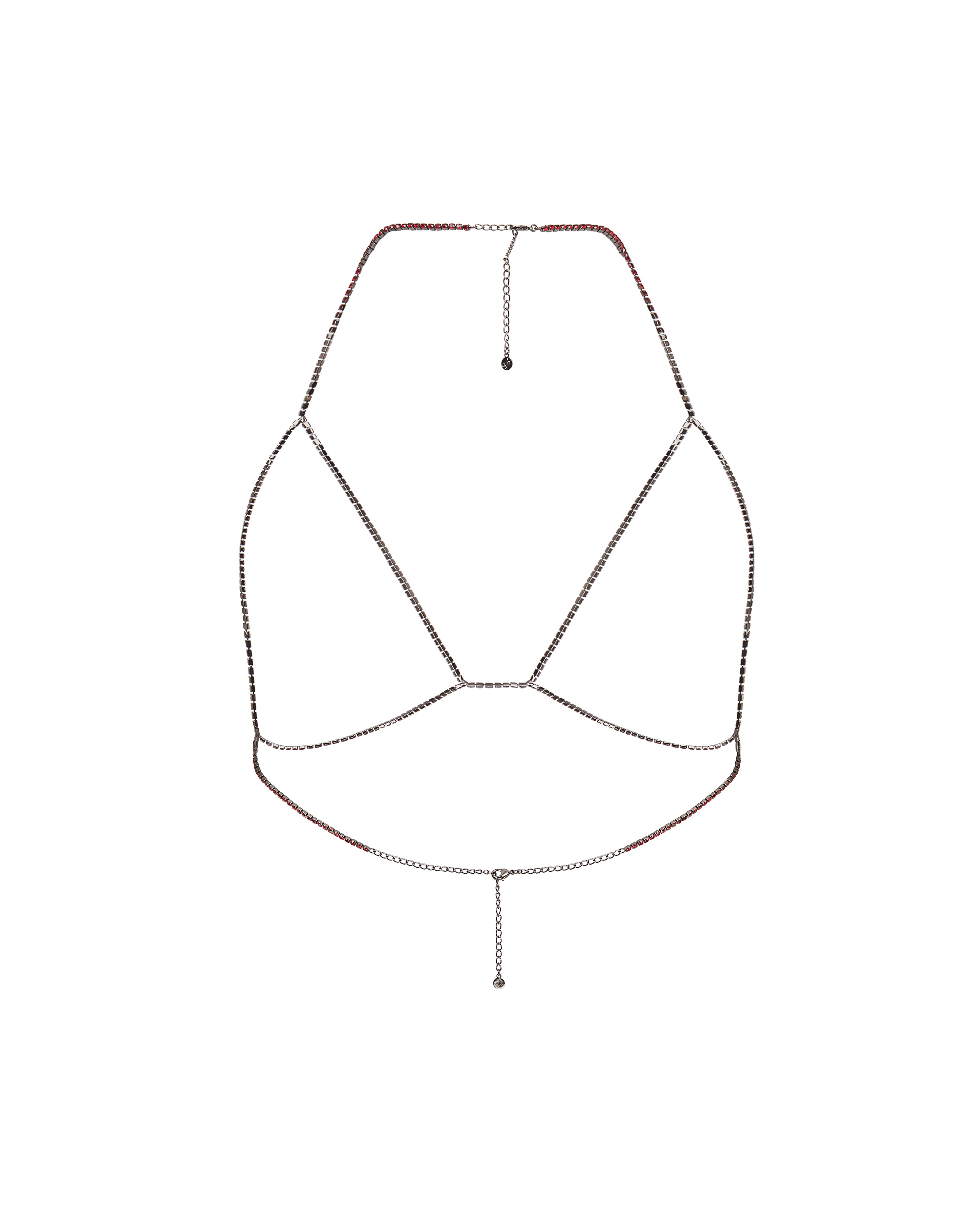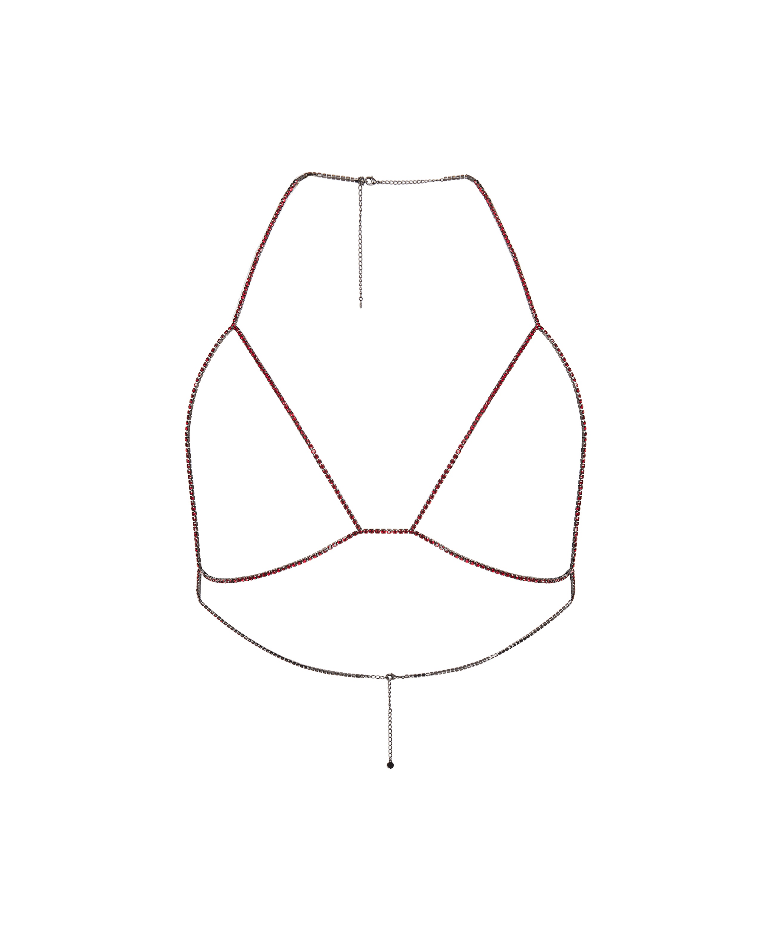 Рубиновая цепь на грудь Bougie: гламурная деталь в духе 70-х для смелого акцента. Мерцает и приковывает взгляды. Сочетайте с бикини или вечерним нарядом.