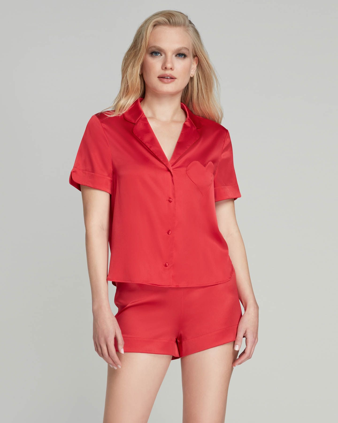 Красная пижамная рубашка Joie с короткими рукавами идеальна для уютных ночей. Шелковая модель оснащена милым кармашком в форме сердца на груди. Сочетайте с соответствующими шортами, создавая стильный и комфортный ночной комплект.