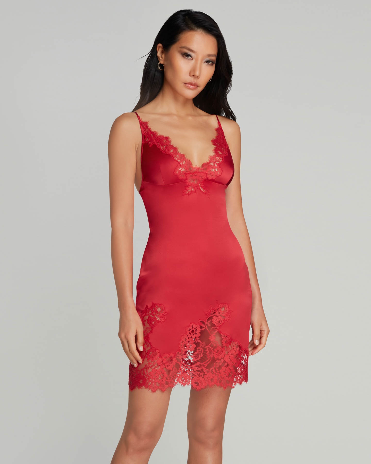 Красная сорочка Emmaline средней длины изготовлена из шелкового сатина с добавлением эластана для большего комфорта. Модель украшена вставками из французского кружева Leavers по линии декольте и по нижнему краю. Регулируемые бретельки перекрещиваются на спине, обеспечивая идеальную посадку.