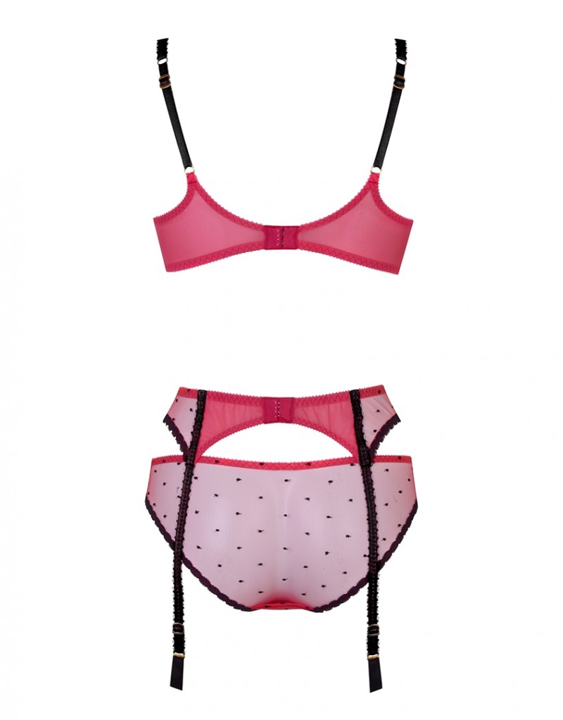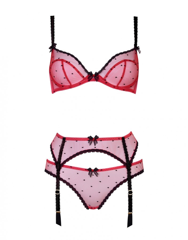 Смелая кокетливая Poppie - новая коллекция из полупрозрачного тонкого тюля с вышитым контрастным узором. Чашки бюстгальтера красного цвета разделены швами на три части, нижняя часть дополнена двойным слоем ткани для дополнительной поддержки. В центре бюстгальтер украшен черными бантиками с бутонами, которые прекрасно сочетаются с узором в горошек. Черная кружевная оторочка вдоль линии декольте завершает образ.