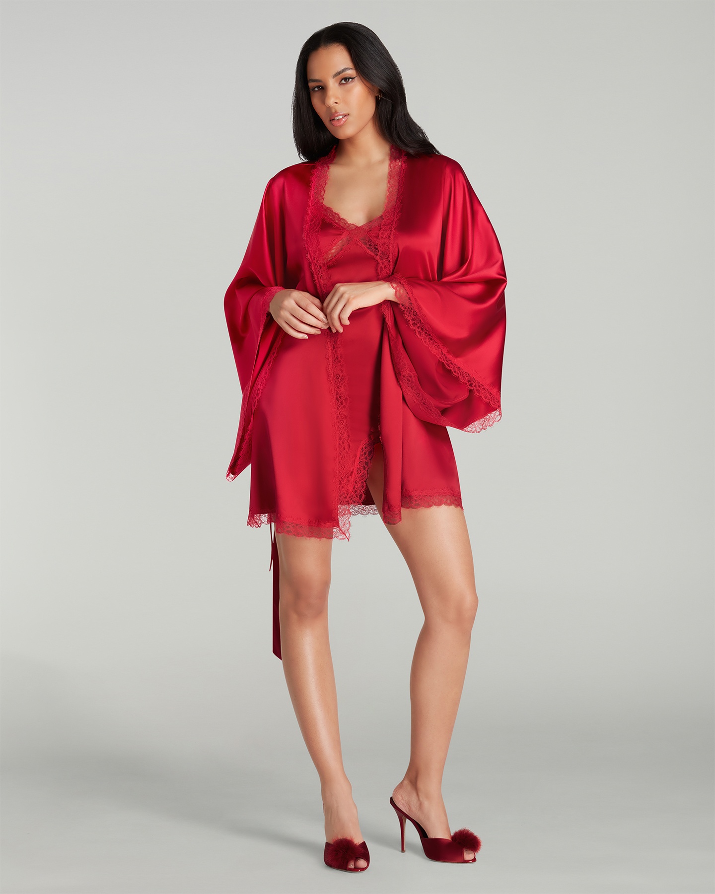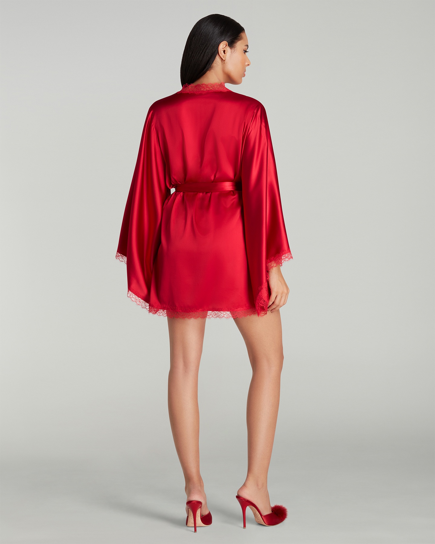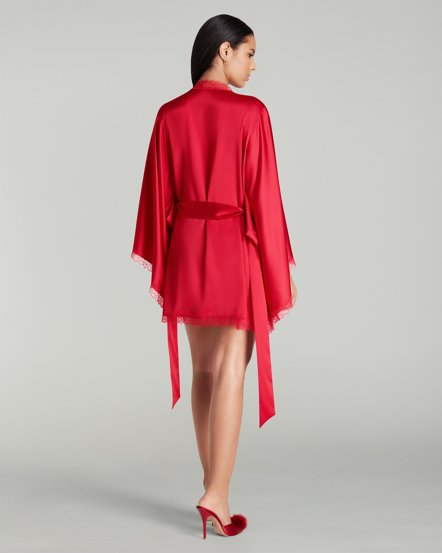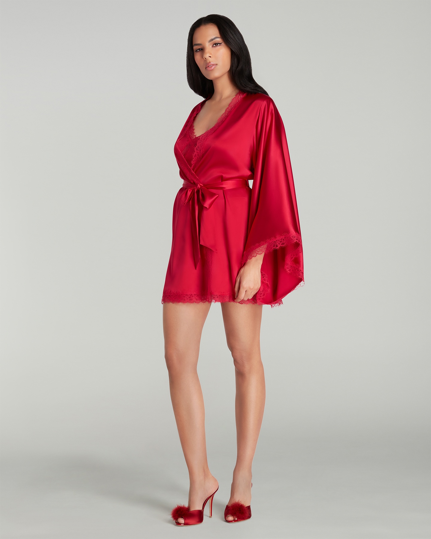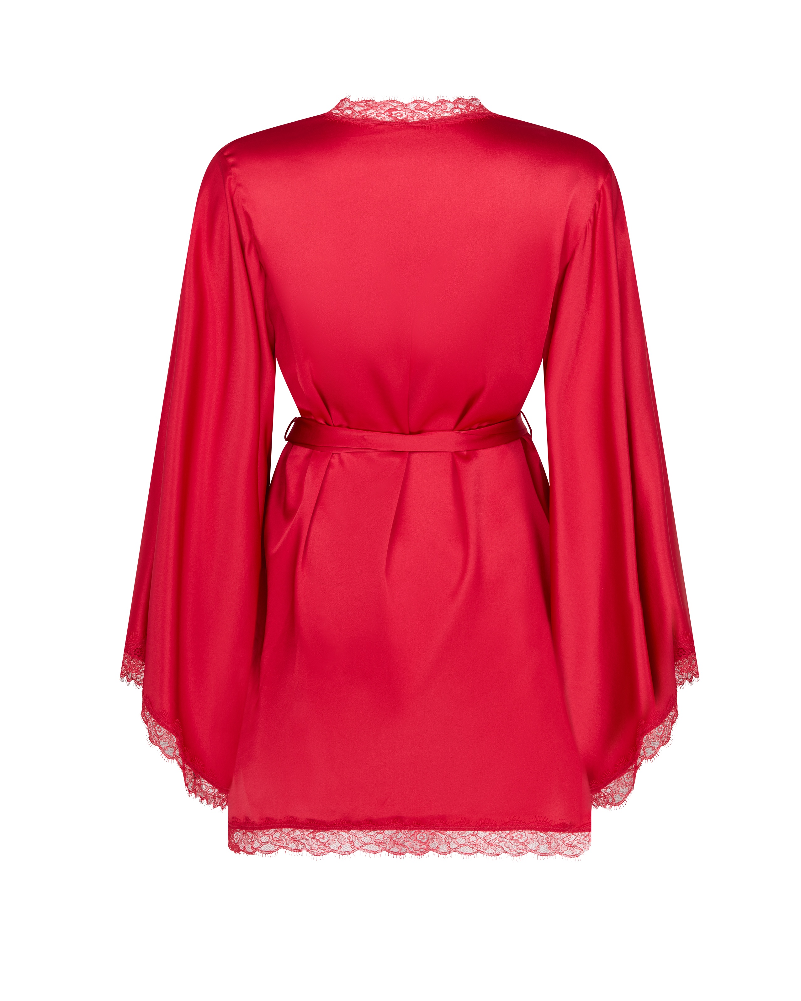 Короткий халат-кимоно Gisele насыщенного красного цвета из эластичного шелкового атласа с расклешенными рукавами. Отделка кружевом Leavers и завязывающийся пояс завершают образ. Наденьте с сорочкой или пижамой Gisele для роскошного отдыха.