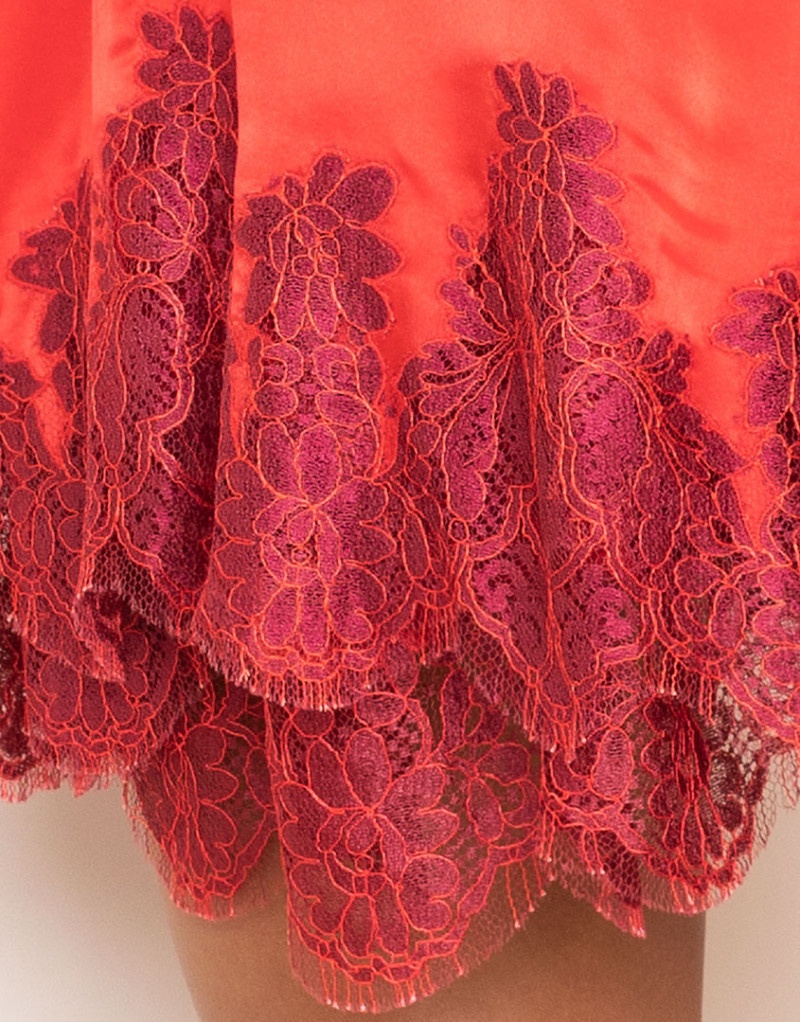 Talia - само воплощение роскоши. Премиальная коллекция из французского кружева Ливерс рубиново-красного цвета. Эффектное классическое кимоно выполнено из роскошного алого шелка с кружевной оторочкой на рукавах и по подолу. Пояс-кушак завершает образ.