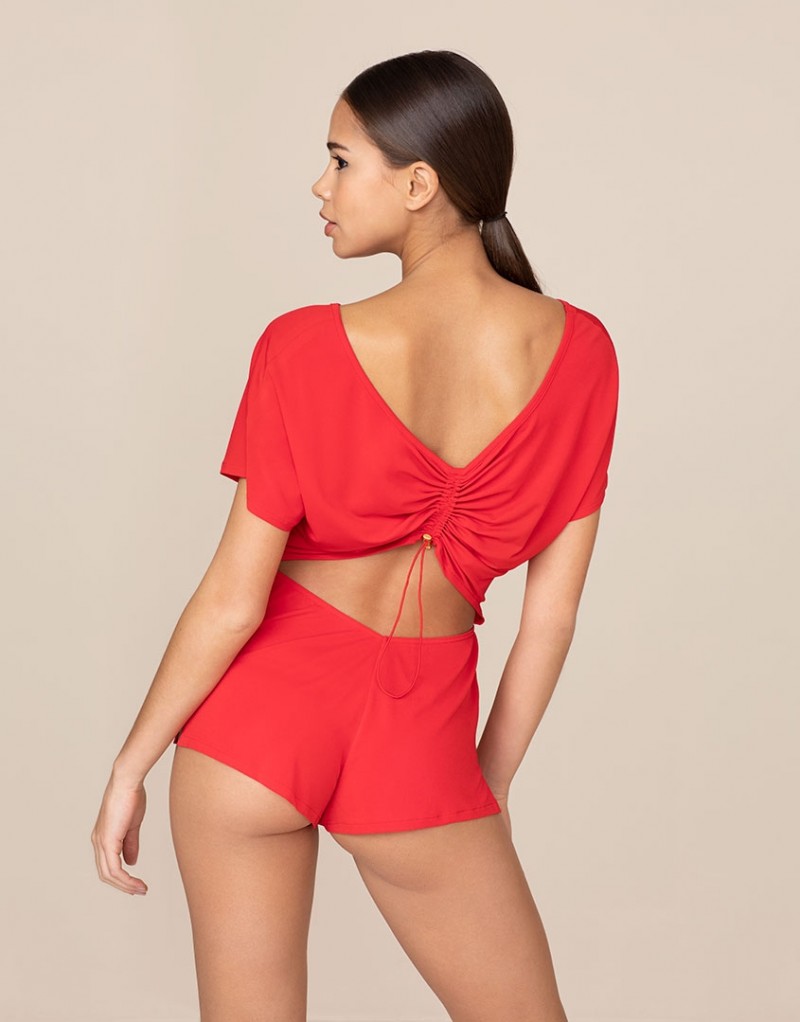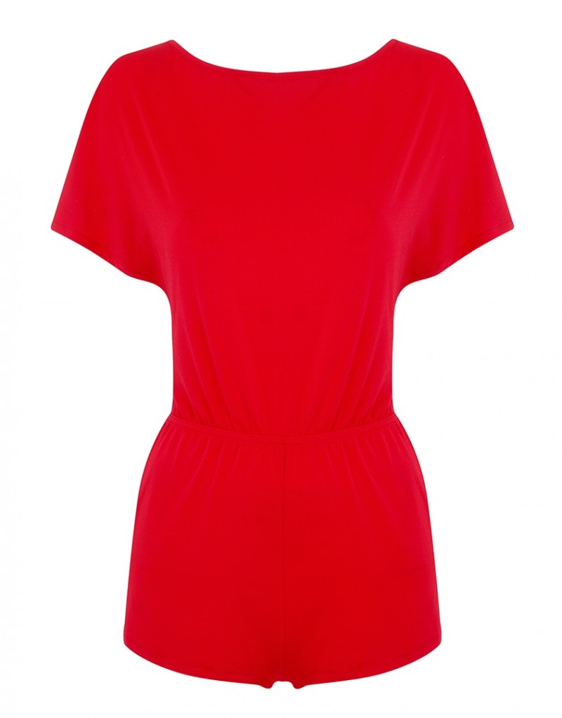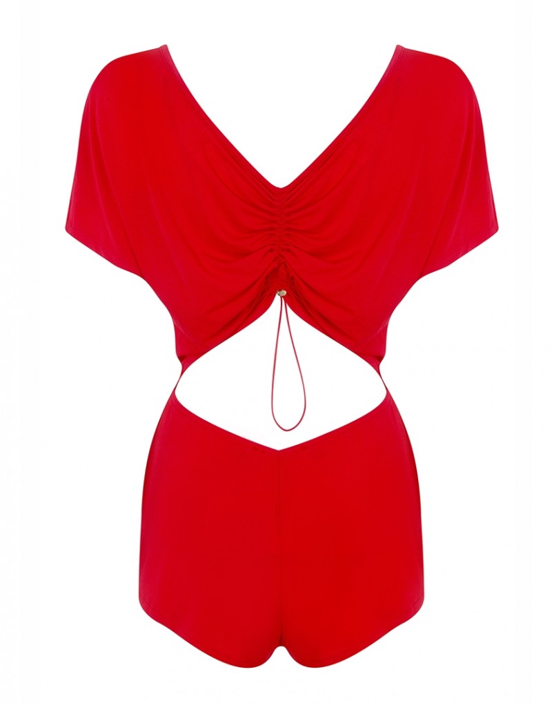 Соблазнительный красный комбинезон из мягкого материала украшает широкий V-образный вырез сзади и стянутая оборка ткани над обнаженной поясницей.
