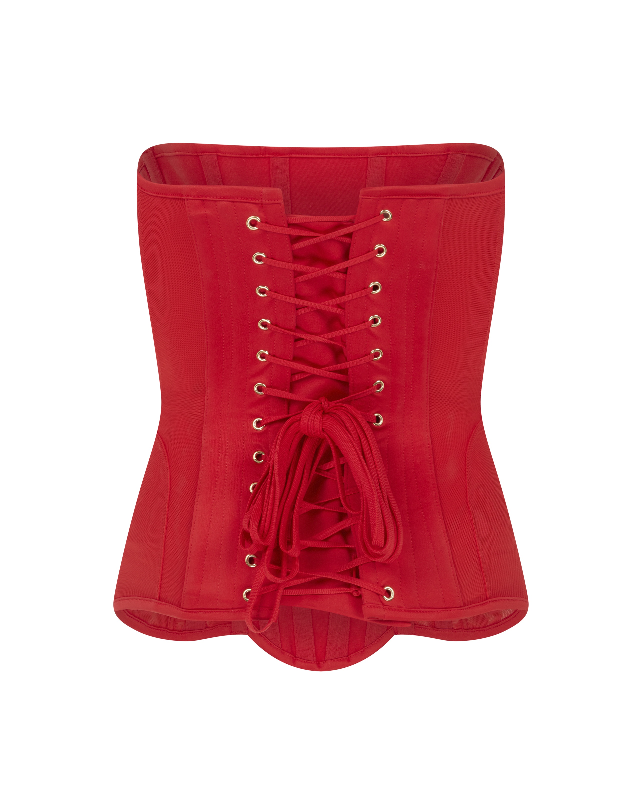 Красный корсет Scarlie с прямым ретро-вырезом и шнуровкой сзади повторяет изгибы тела благодаря косточкам и вставкам на бедрах. Итальянская сетка внутри создает легкость, а атлас снаружи — блеск в стиле pin-up.
