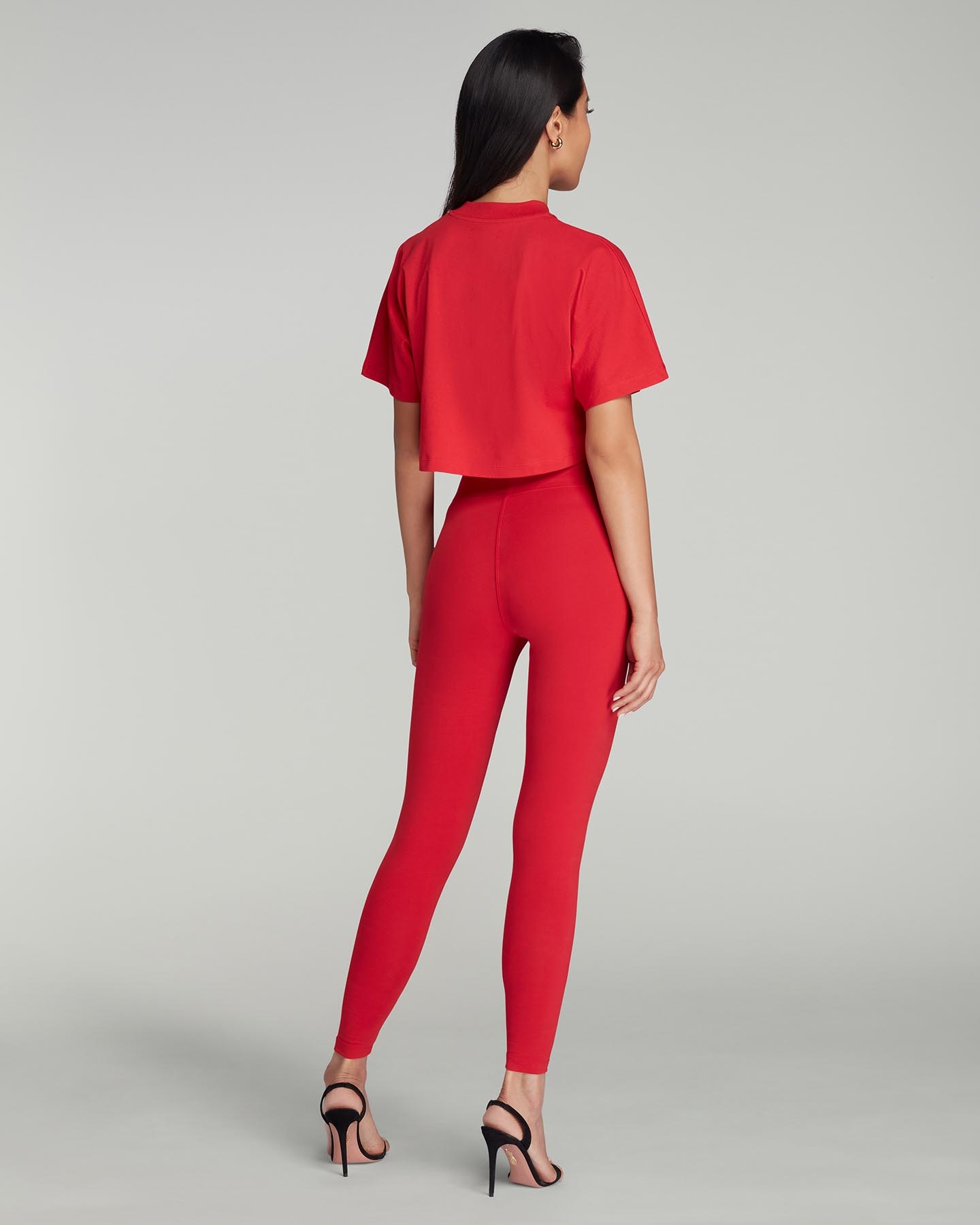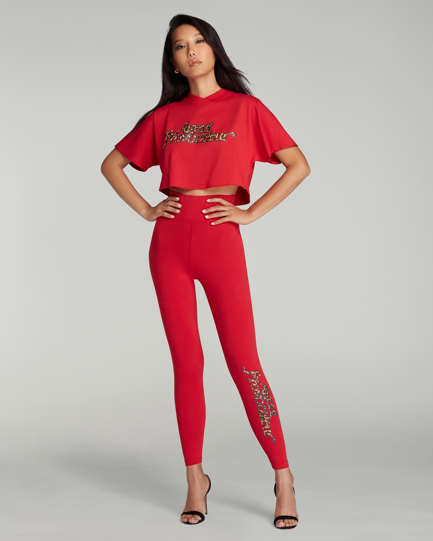 Красный кроп-топ с короткими рукавами и V-образным вырезом изготовлен из эластичного хлопчатобумажного двухслойного трикотажа. На груди расположилась аппликация в виде логотипа Agent Provocateur в леопардовой расцветке. Сочетайте с низом из этой же коллекции для создания комфортного и яркого образа.