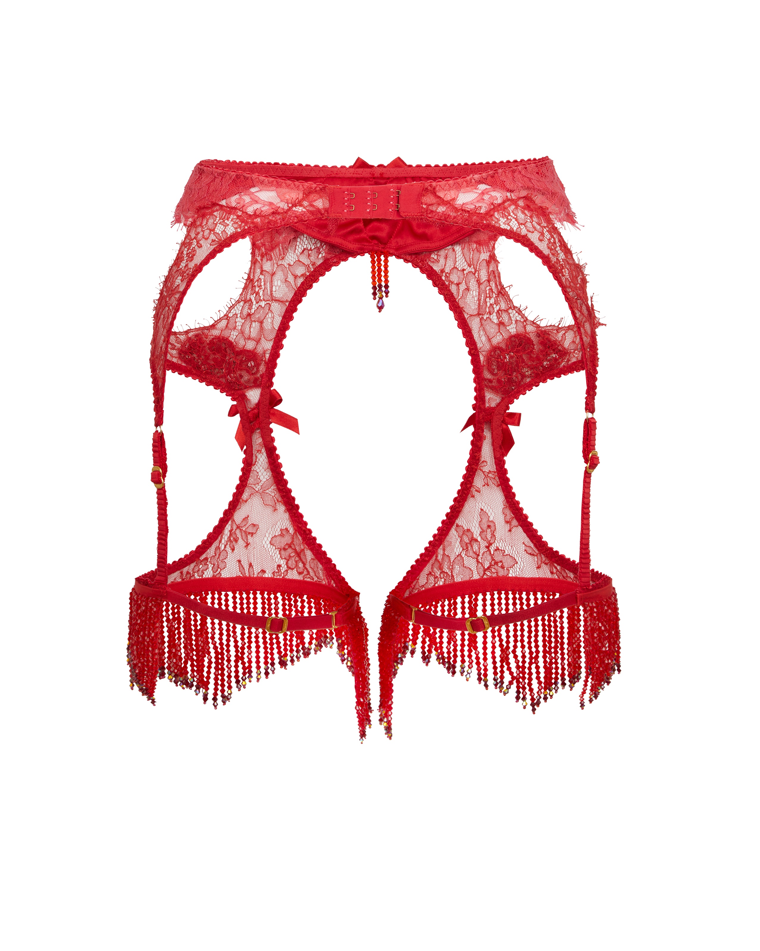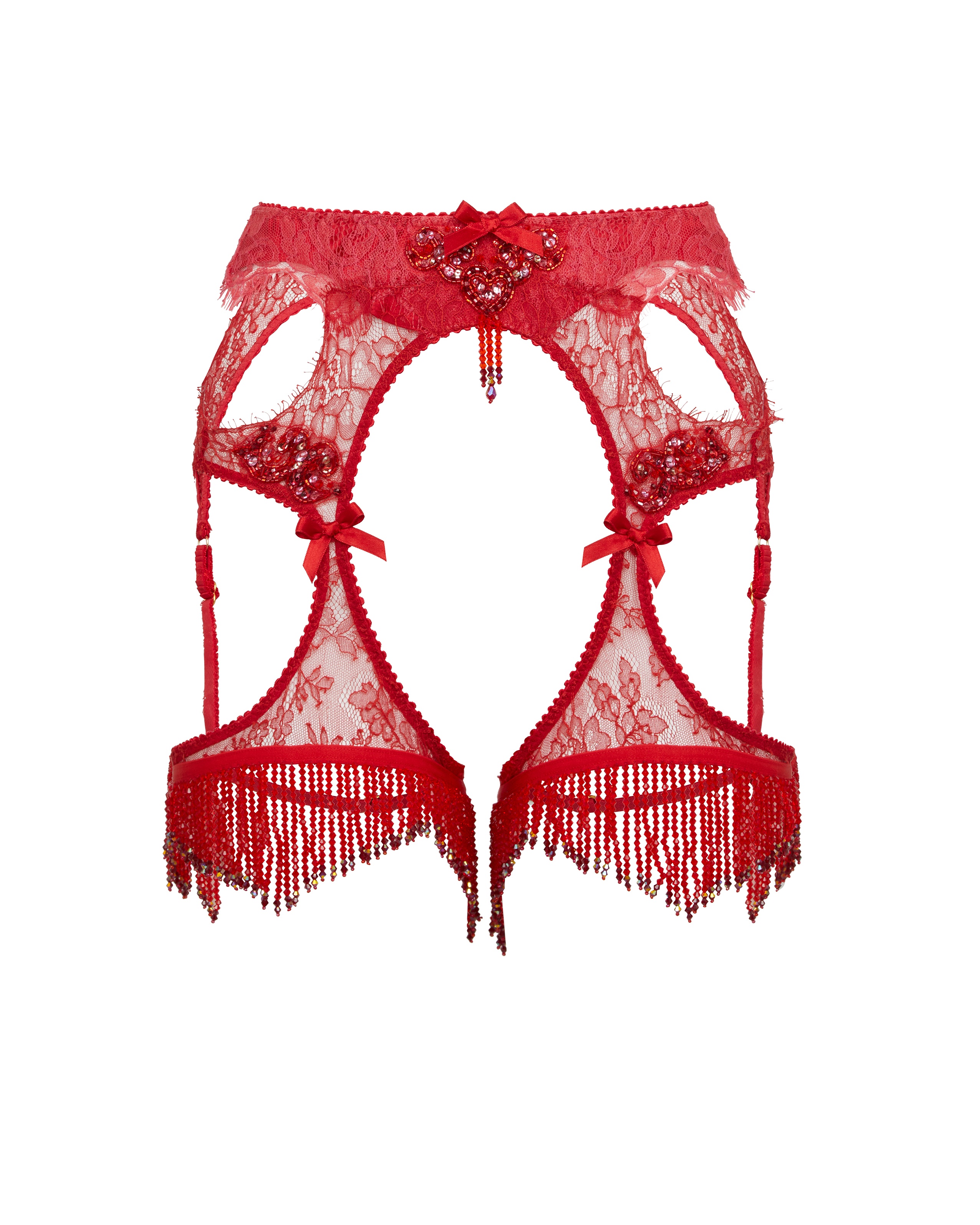 Этот пояс Graicelle объединяет красный шелк и розовое кружево Leavers спереди, ажурные вырезы на талии и длинные регулируемые «крылья» с бисером и кисточками. Сочетайте его с комплектом Graicelle для завораживающего образа.