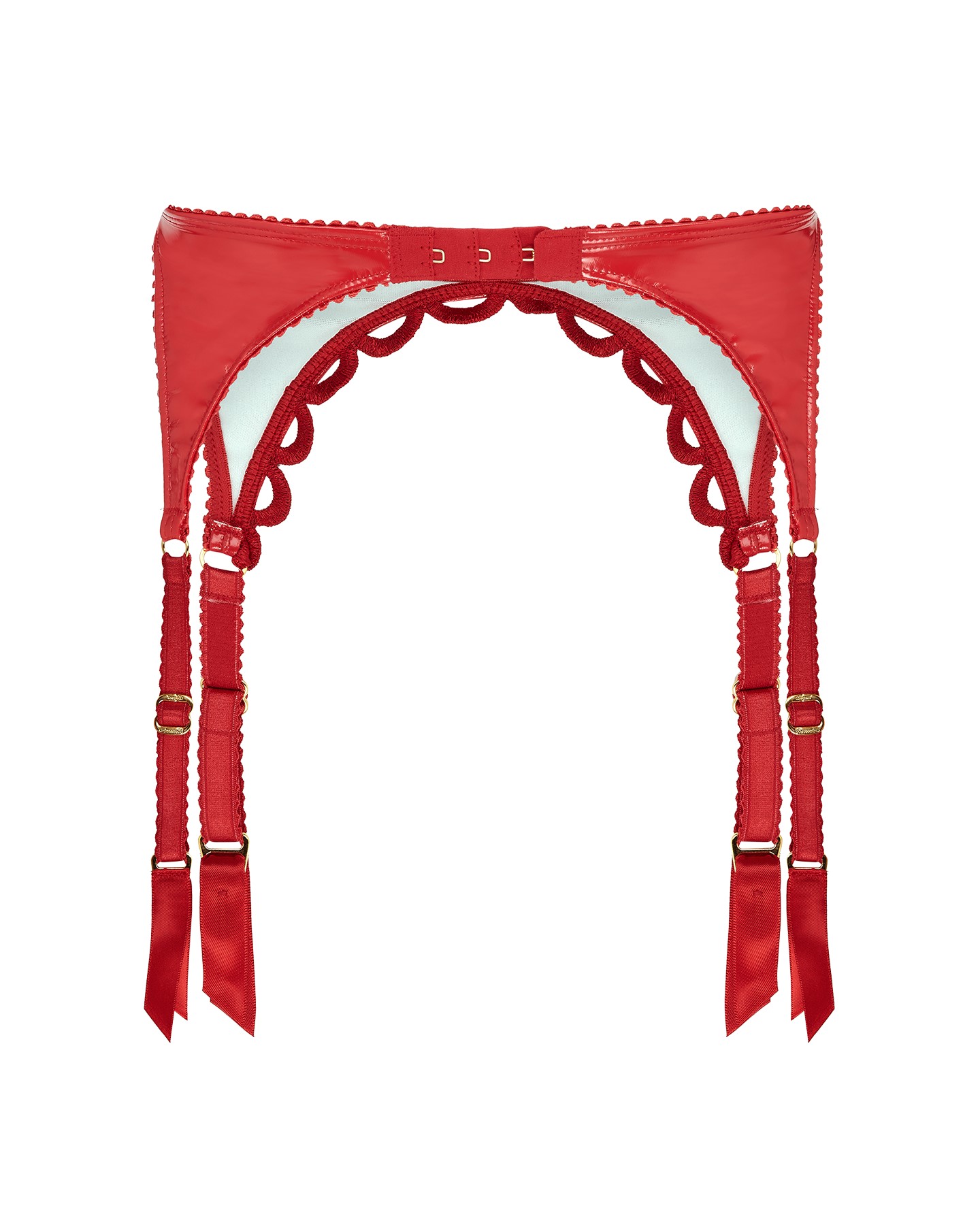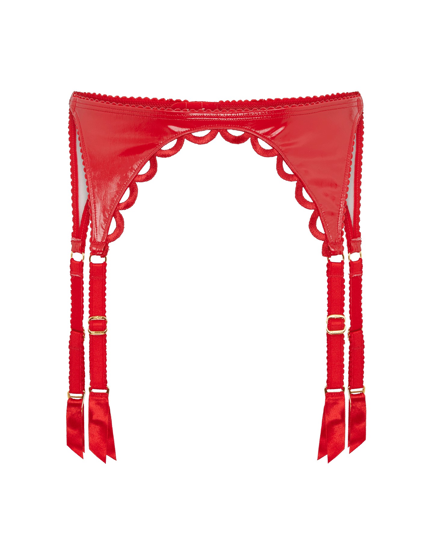 Пояс для чулок Zarya красного цвета из глянцевой ткани украшен гипюровой отделкой, а детали из металла с позолотой добавляют роскошный акцент. Этот пояс станет ключевым элементом для создания дерзкого и эффектного образа.