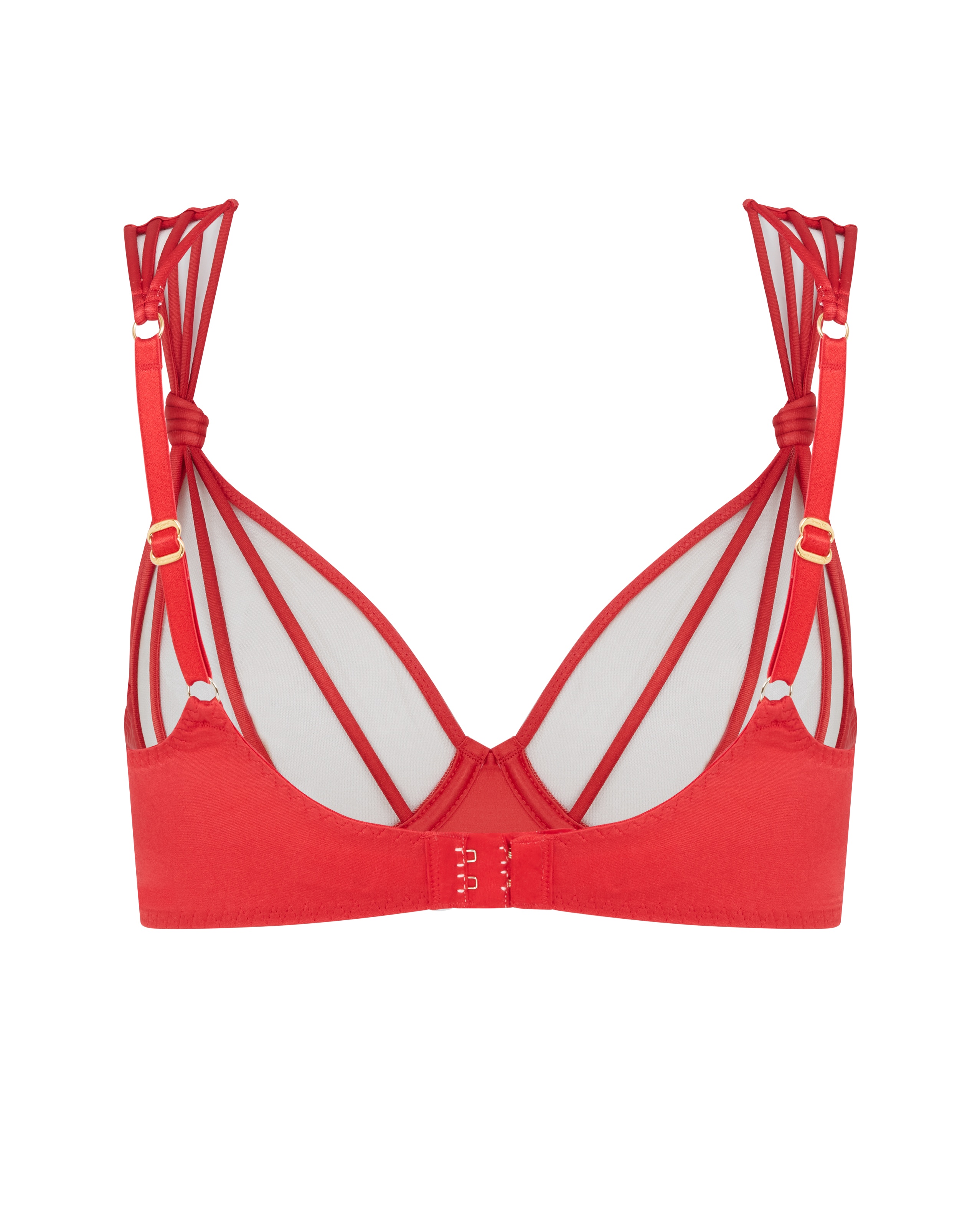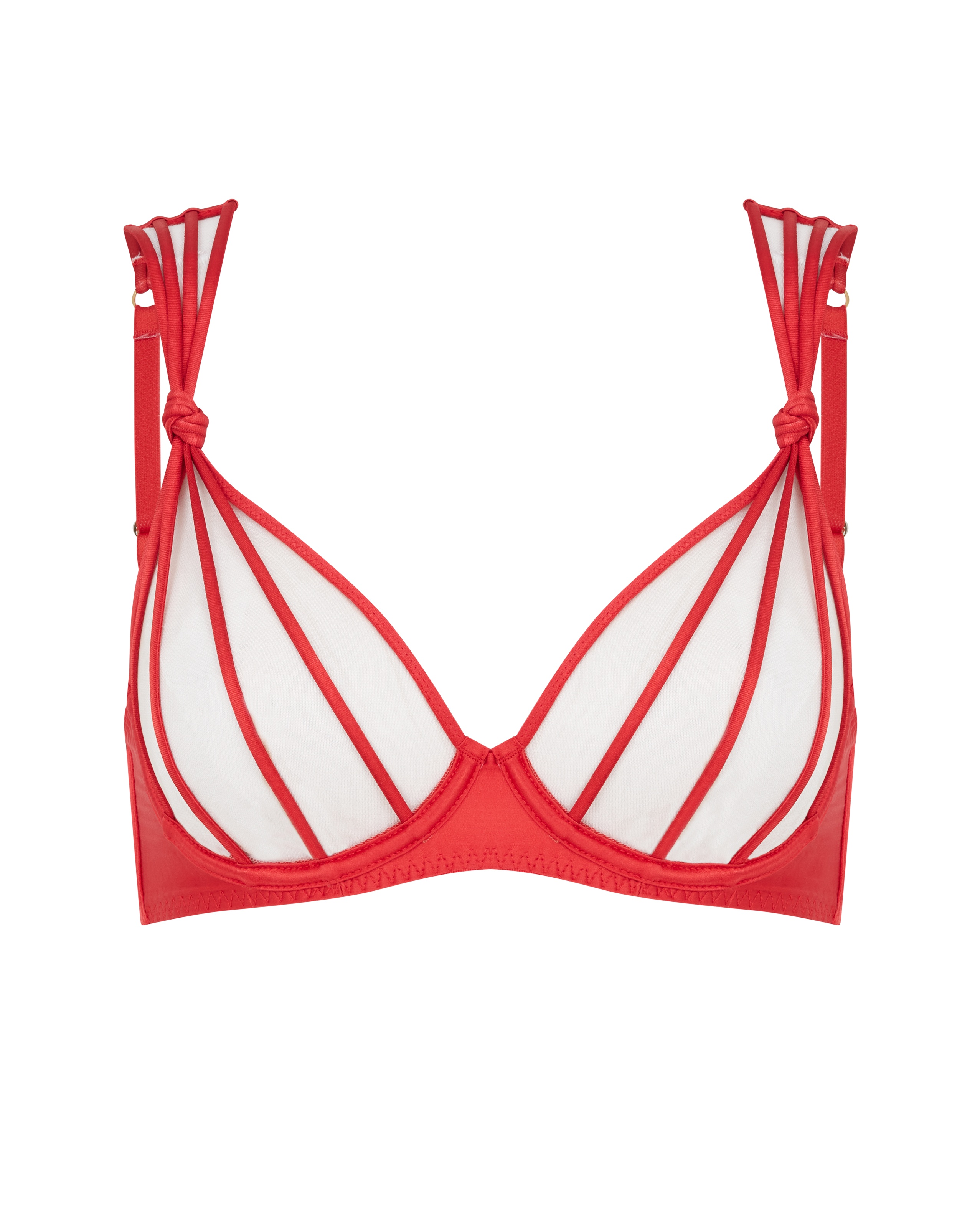 Красный бралет Ozara: прозрачный тюль, дерзкие ремни и акцентные узлы. Смелый образ, который невозможно игнорировать. Дополните ансамбль коллекцией Ozara для максимального эффекта.