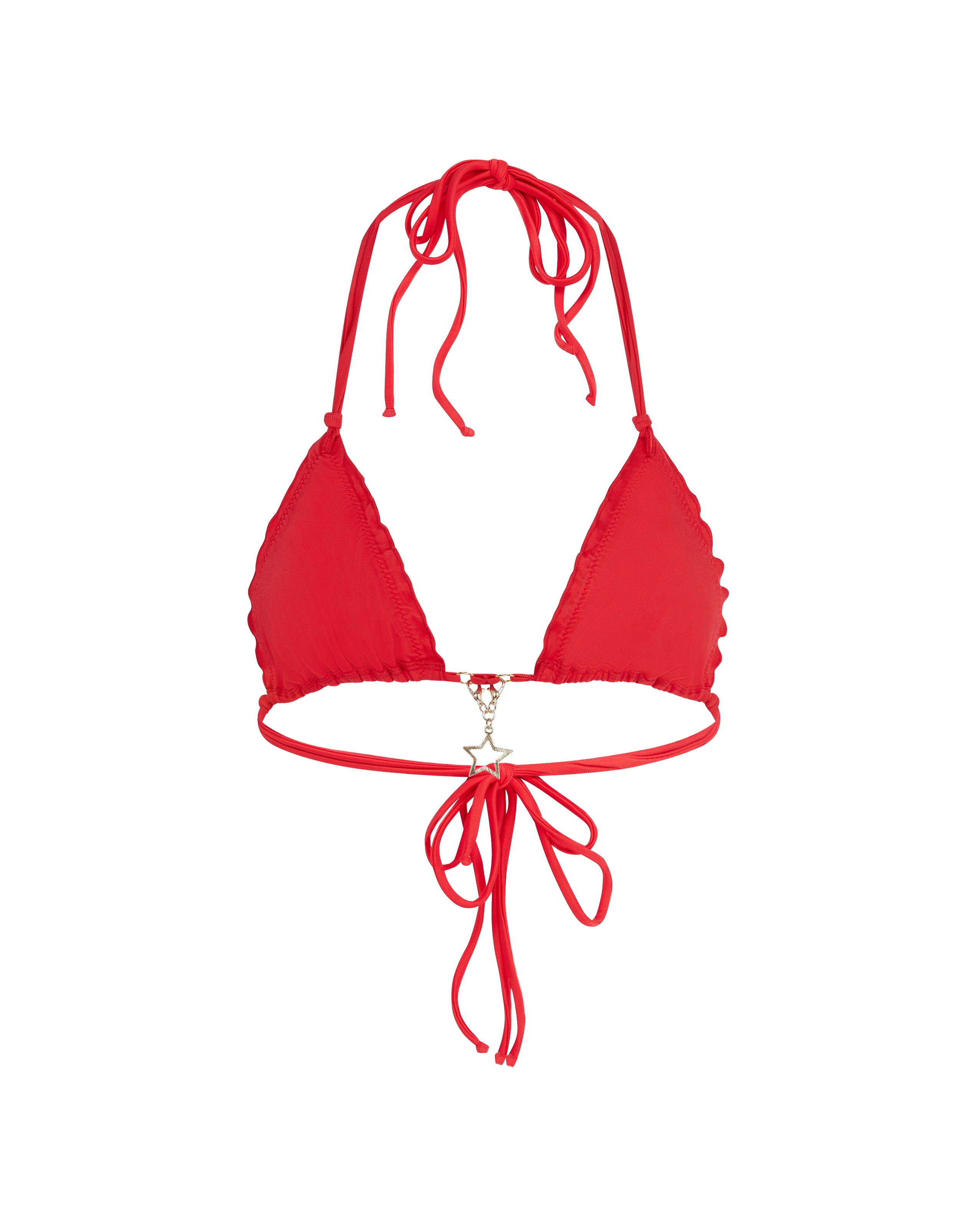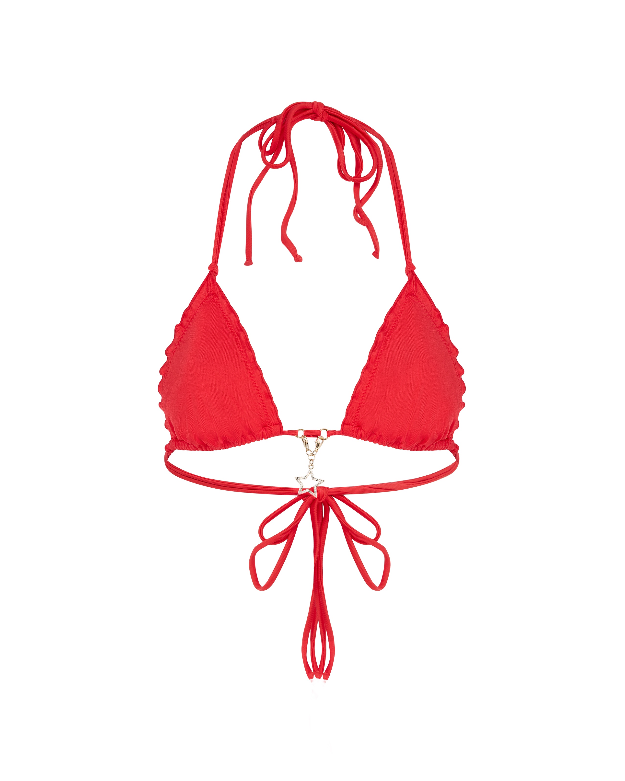 Топ купальника Berry красного цвета на завязках-халтер имеет треугольные чашки с регулируемой сборкой. Итальянская купальная ткань, кокетливые рюши по краю и кристальная звездочка с водостойким покрытием между чашками создают соблазнительный образ. Сочетайте с плавками Berry для дополнительной порции гламура.