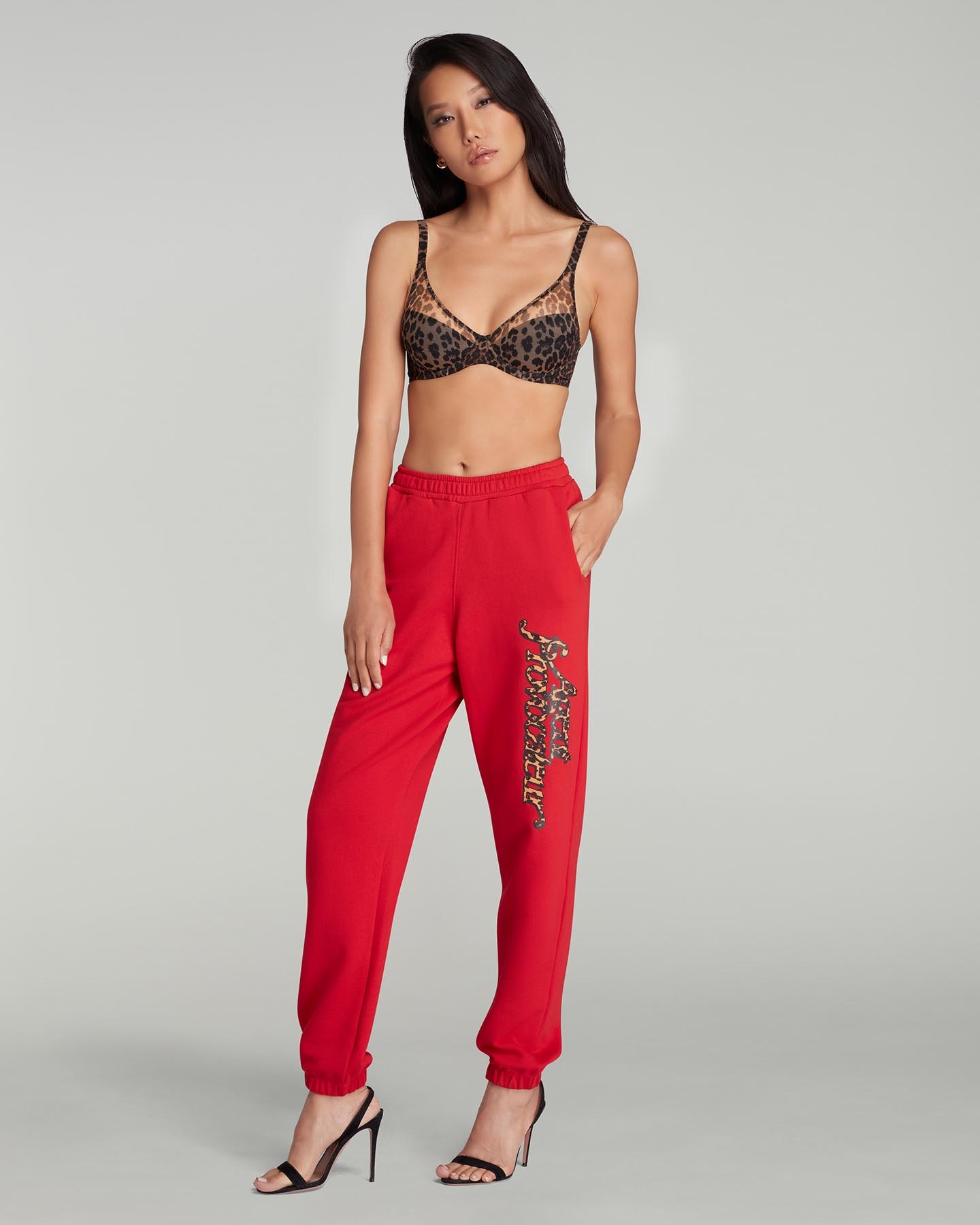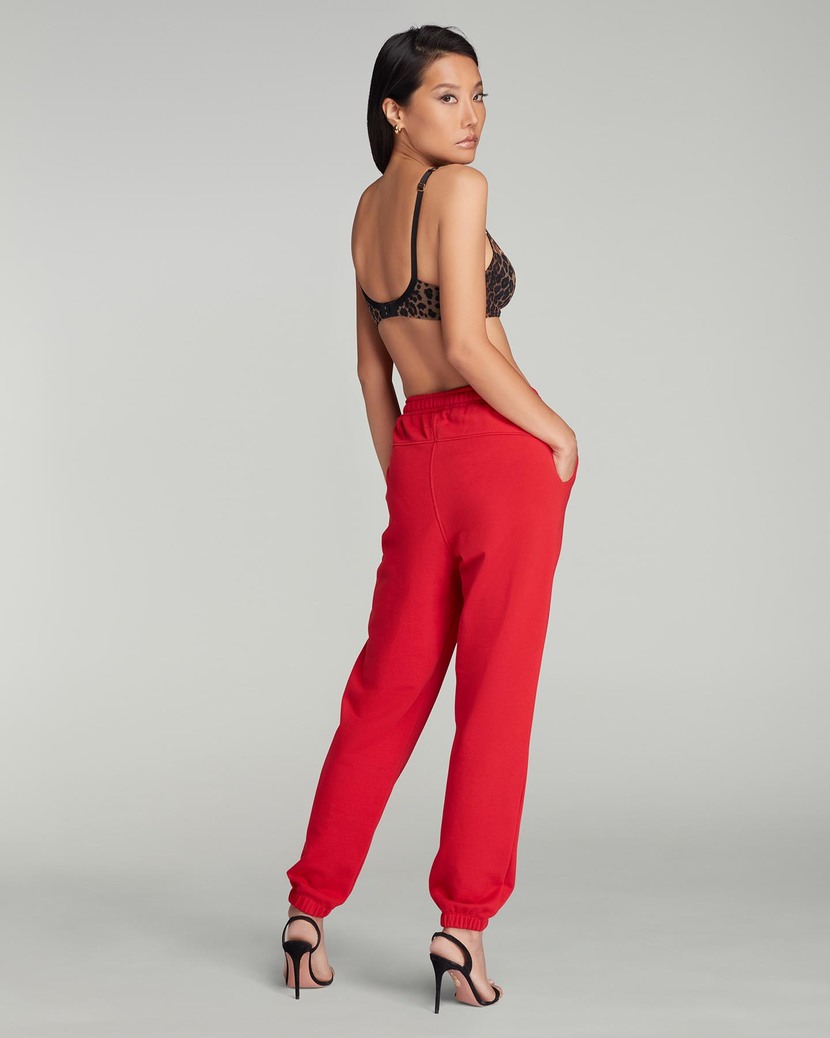 Красные джоггеры из коллекции Rayley пошиты из органического хлопчатобумажного трикотажа. Модель с эластичной резинкой на талии украшена аппликацией в виде логотипа Agent Provocateur на брючине с леопардовым принтом. Можно сочетать с другими вещами из этой же коллекции.