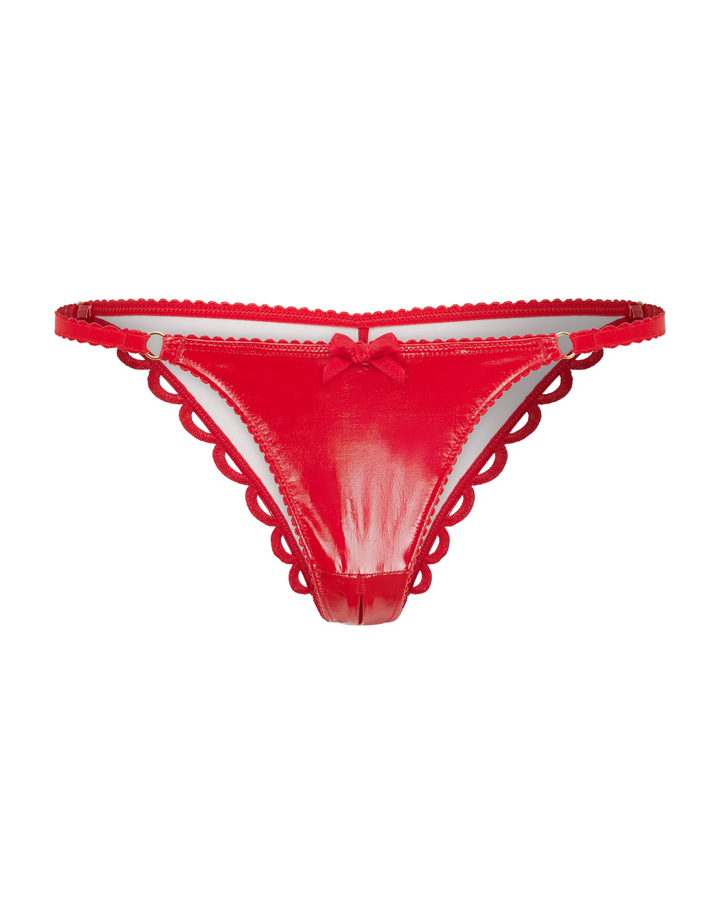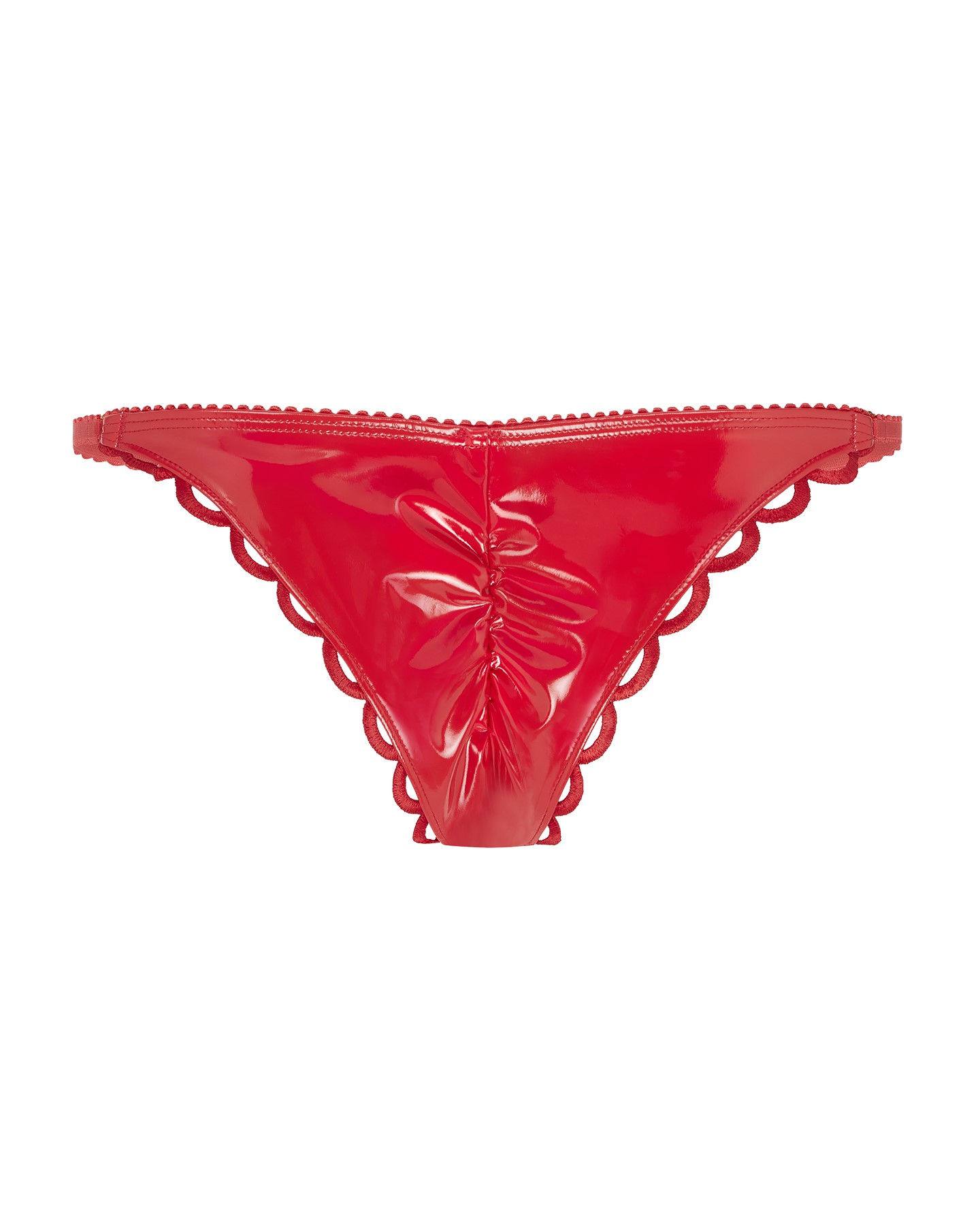 Французские трусы Zarya с открытой линией ластовицы выполнены из красной блестящей ткани, а их высокие танга-боковины визуально удлиняют ноги. Окантовка из глянцевого гипюра завершает дизайн, идеально сочетаясь с остальными элементами коллекции Zarya.