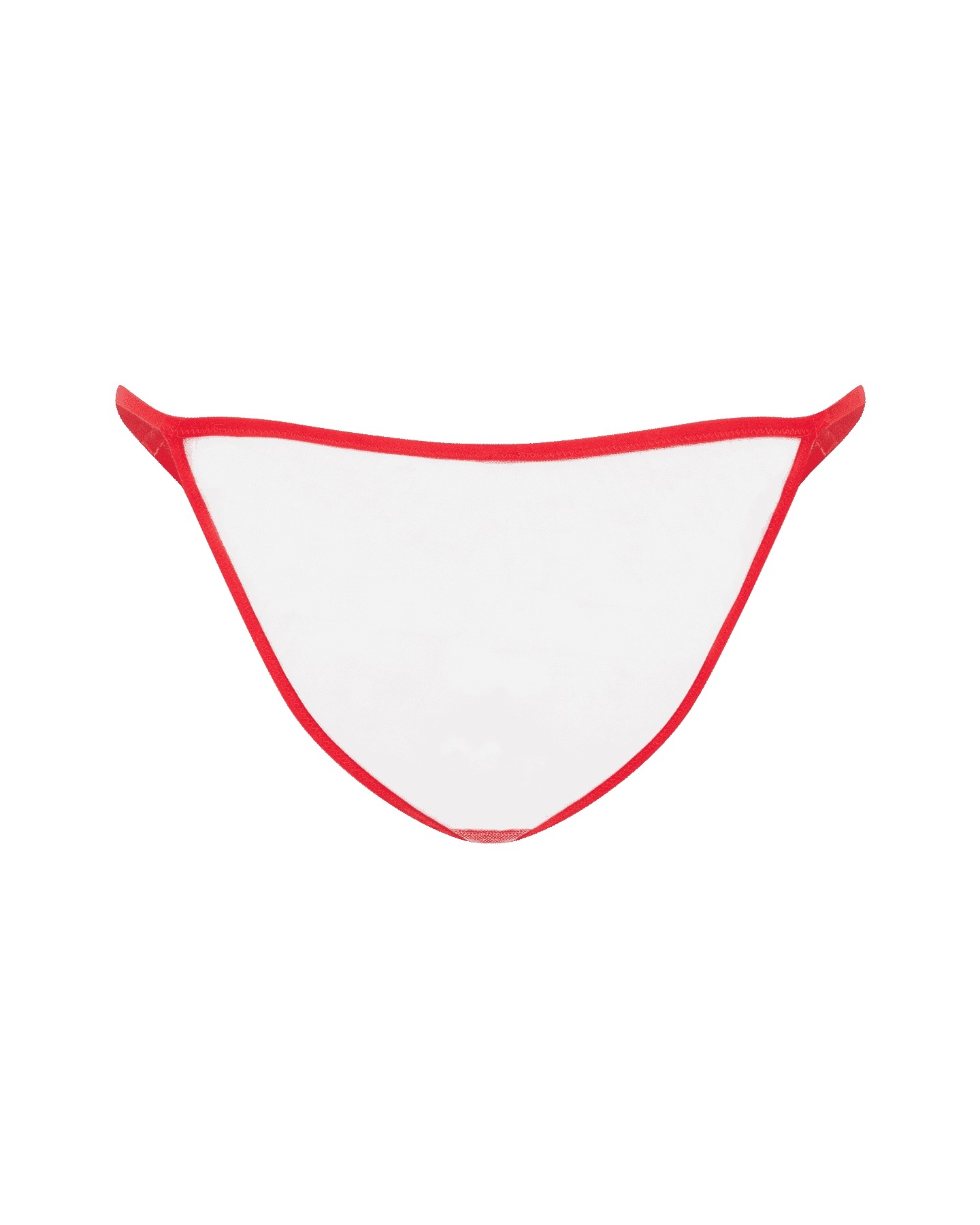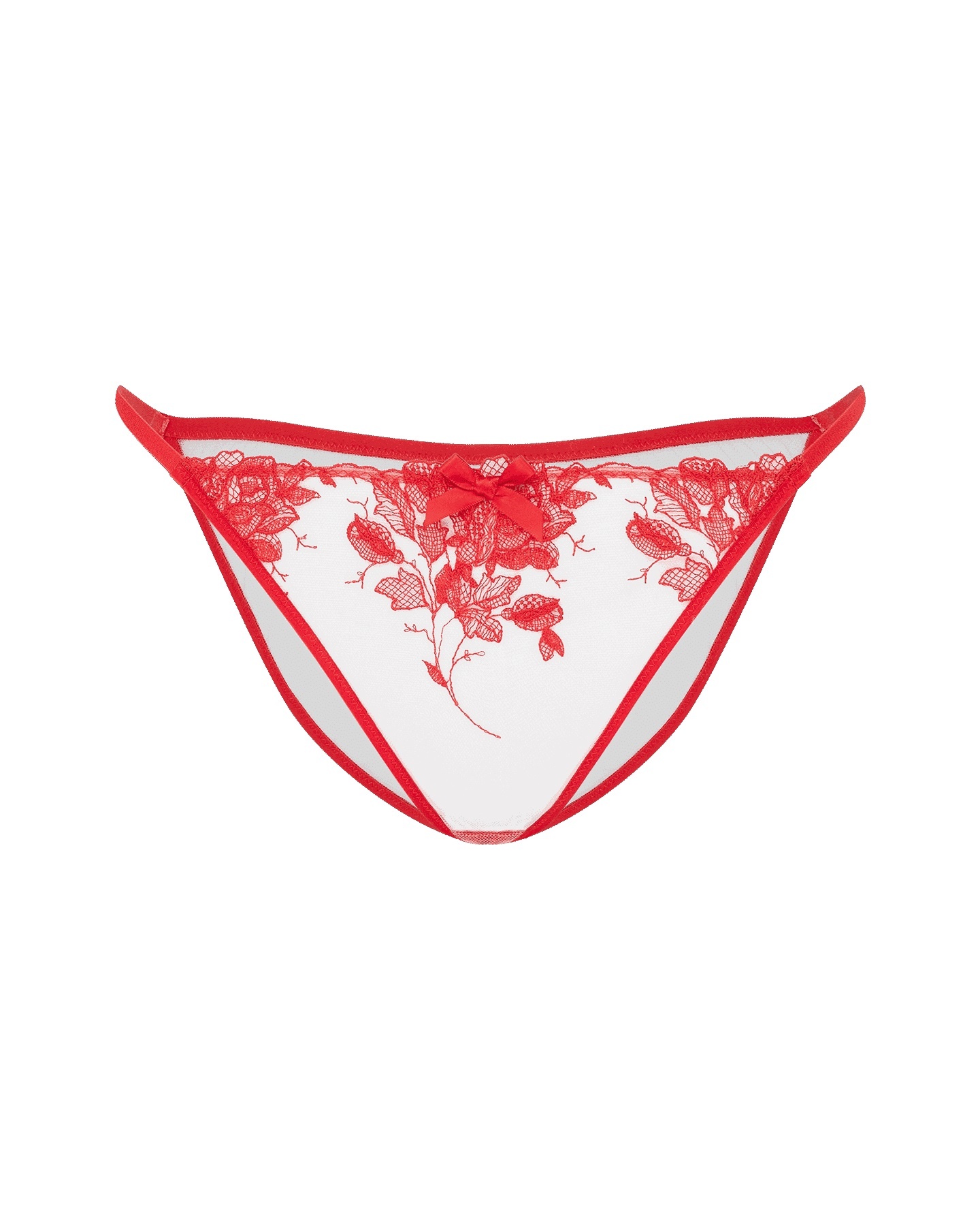 Классические трусы Elvie в форме танга выполнены из песочного тюля с цветочной вышивкой красного оттенка. Шаловливая сборка на задней части добавляет игривости. Составьте свой цветочный ансамбль с бельем Elvie.