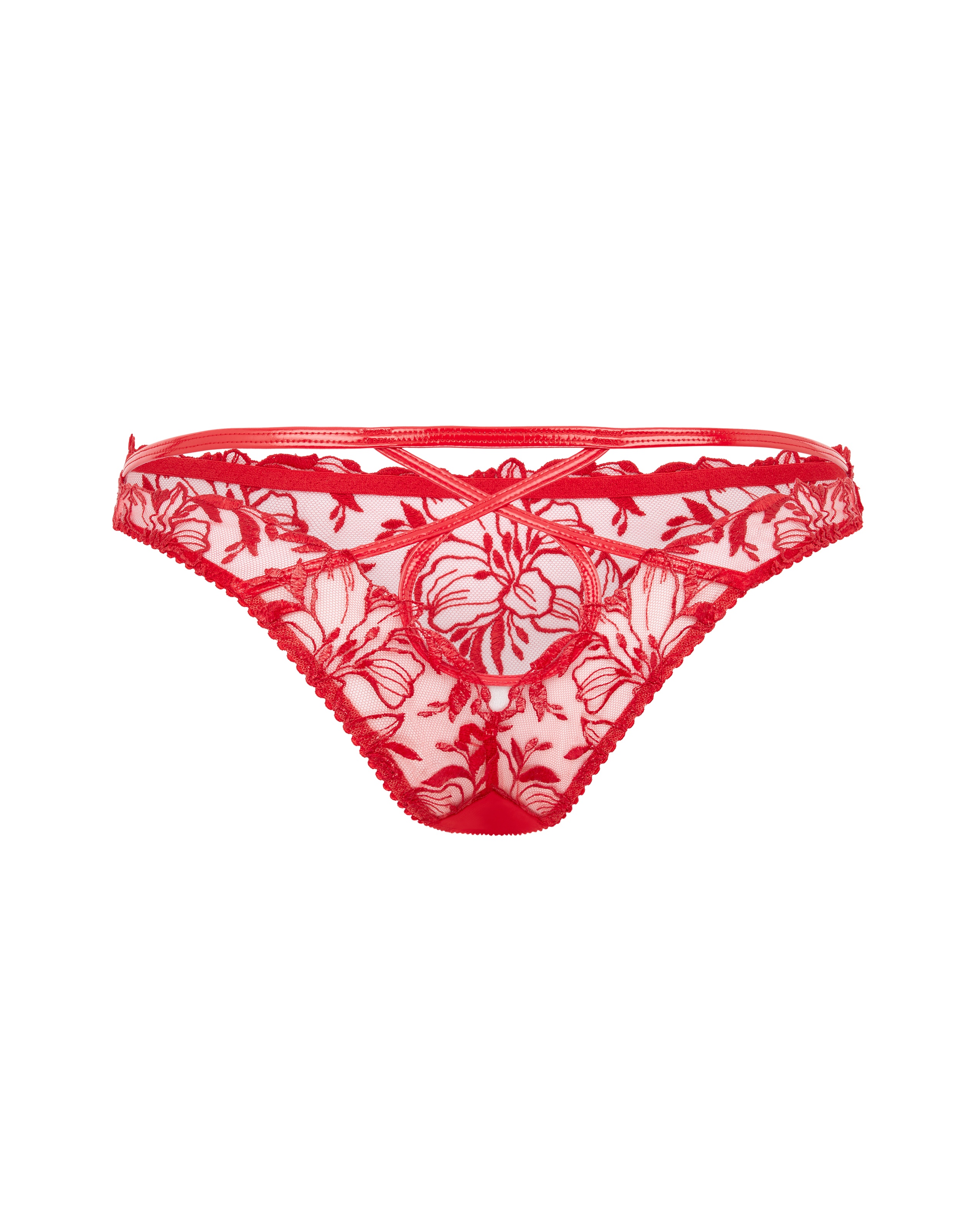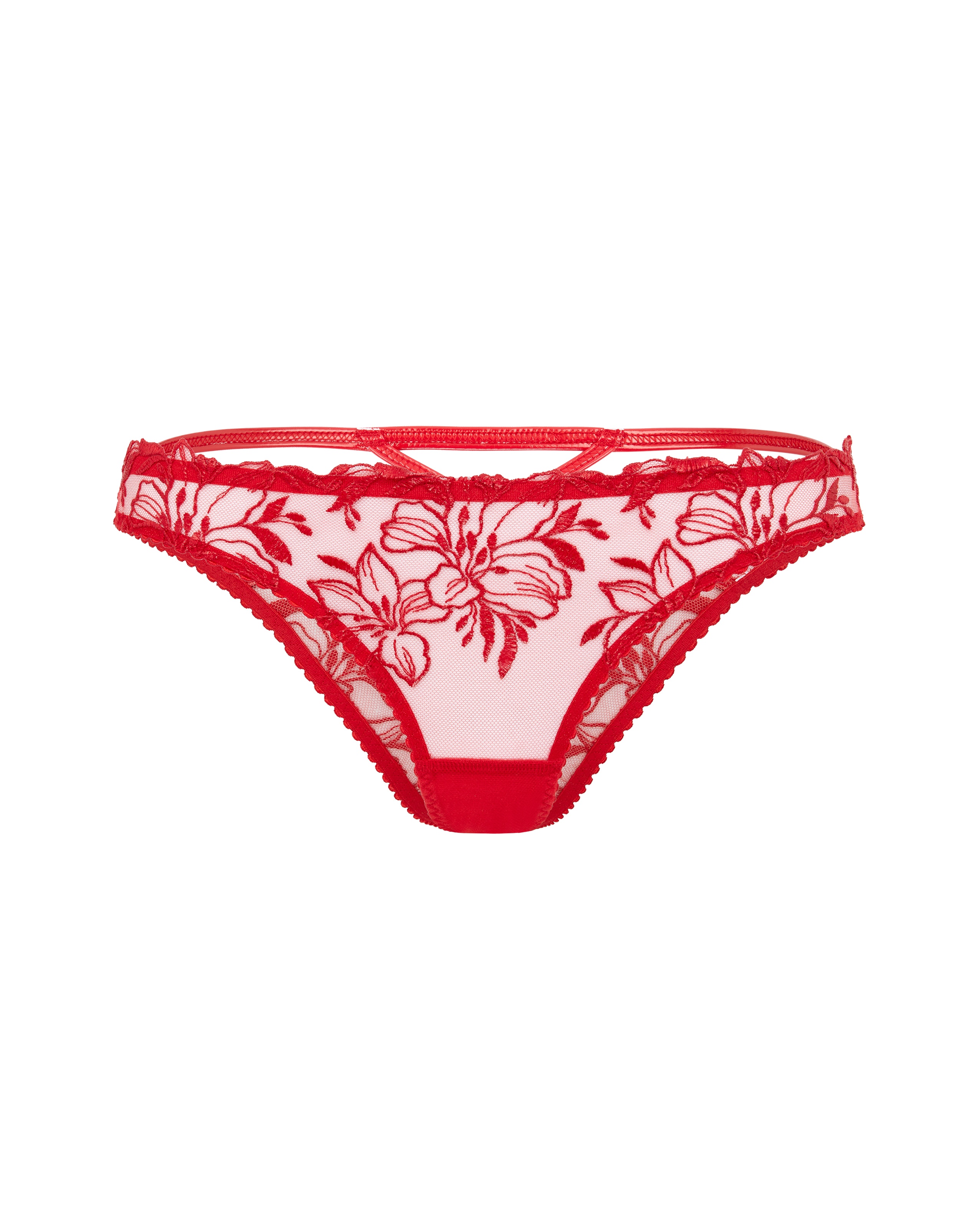 Дополните свою коллекцию нижнего белья с привлекательными красными брифами из коллекции Ozella. Изготовленные на основе прозрачного тюля, украшенного замысловатой цветочной швейцарской вышивкой и дополненного соблазнительной отделкой с эффектом мокрого блеска, их дизайн включает смелый перекрестный и вырезной эффект, подчеркнутый привлекательной обвязкой из ПВХ сзади. Носите их в сочетании с коллекцией Ozella для создания абсолютно очаровательного комплекта.