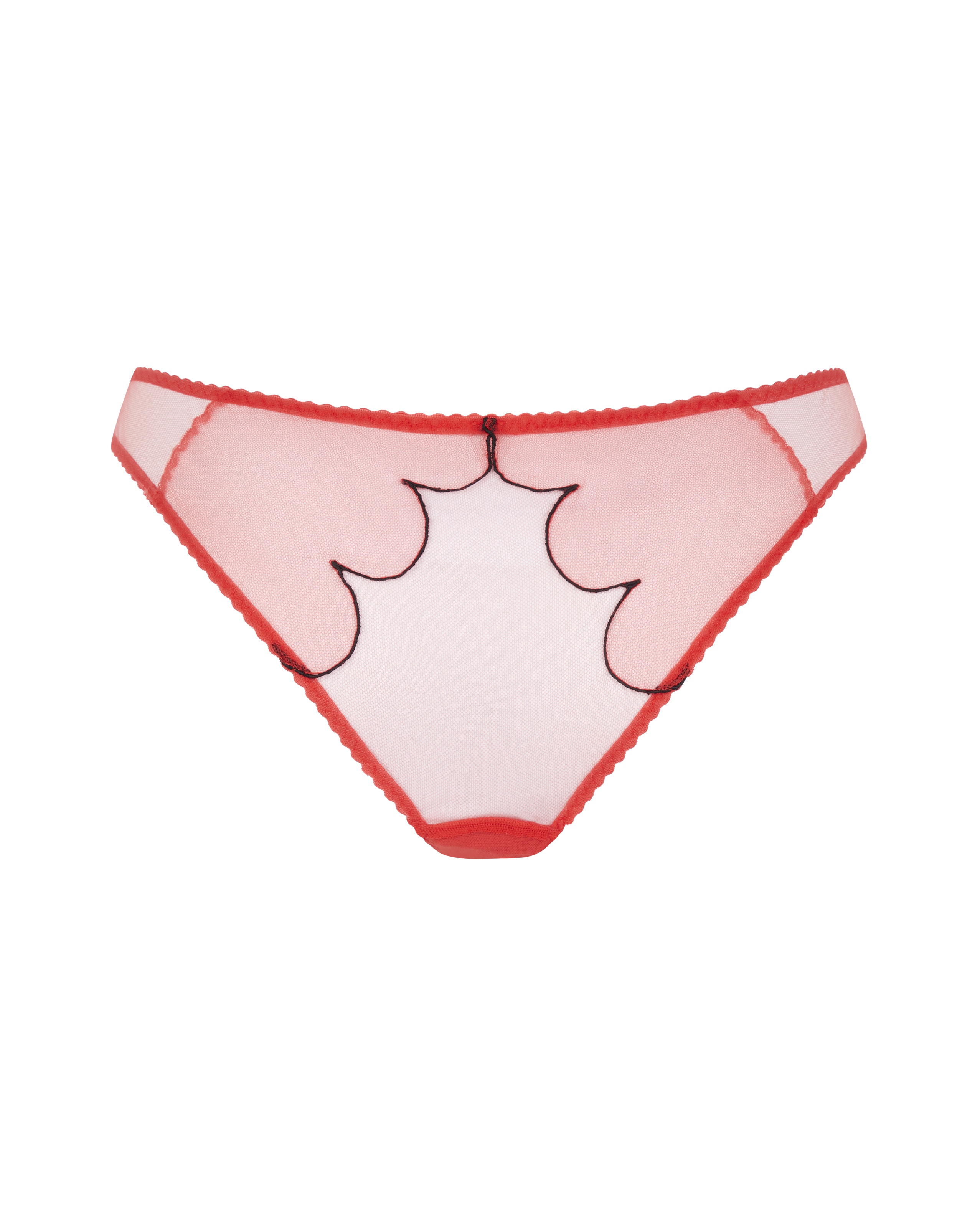 Трусики Lorna классического кроя созданы из тончайшей сетки красного цвета с полупрозрачным эффектом. Культовый дизайн с волнистыми краями подчеркнут черной вышивкой и дополнен атласным бантом с бутоном в центре. Дополните комплект бюстгальтером и поясом из коллекции Lorna.