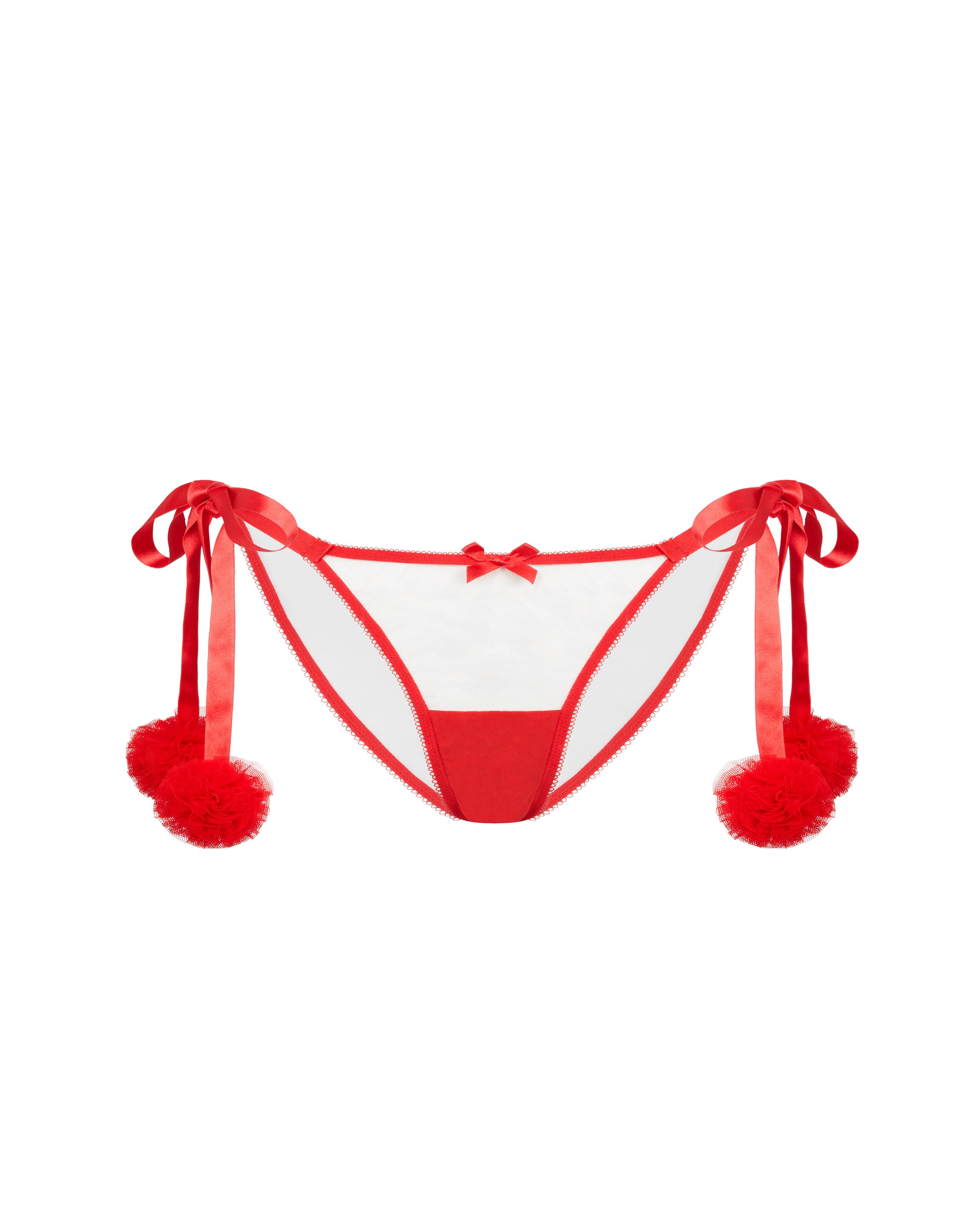 Трусы Hotpants из прозрачного невидимого тюля с яркой красной резинкой и атласными ленточными завязками по бокам. Игривые тюлевые помпоны добавляют кокетства. Сзади надпись HOT PANTS из сверкающих красных пайеток.