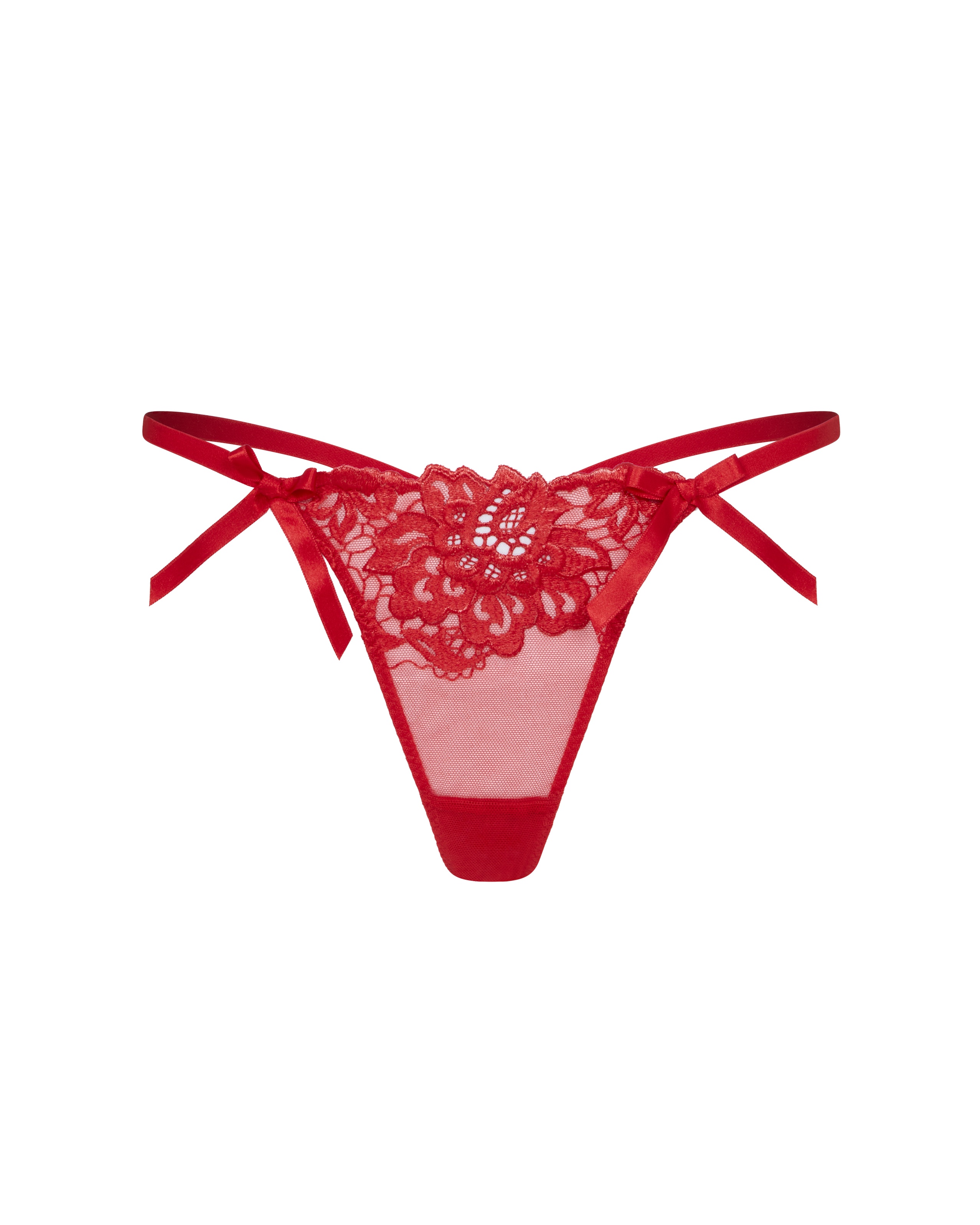 Красные стринги Cendrillon с цветочной вышивкой по всей поверхности и крупными атласными бантами. Завершите образ, сочетая с остальными изделиями коллекции.