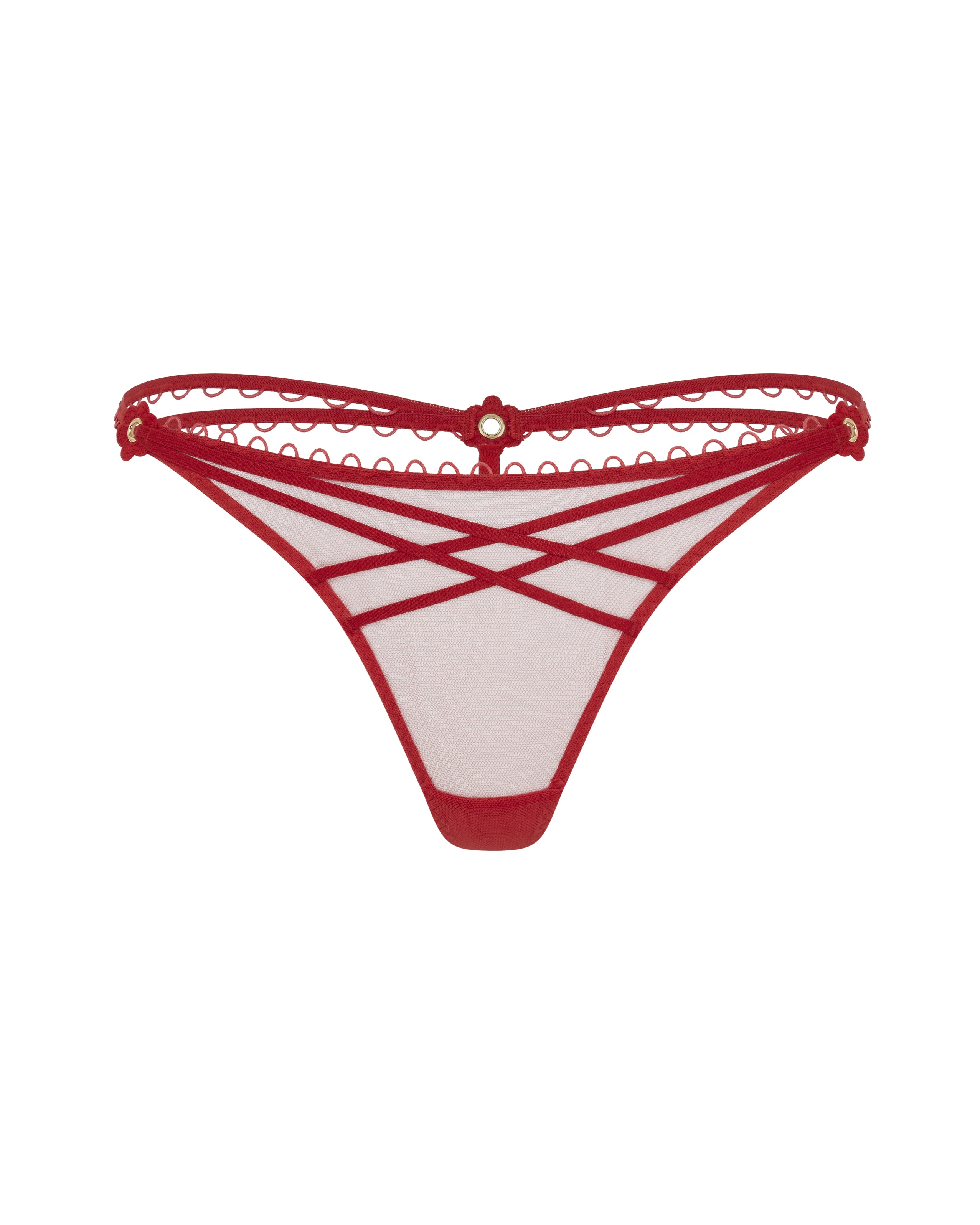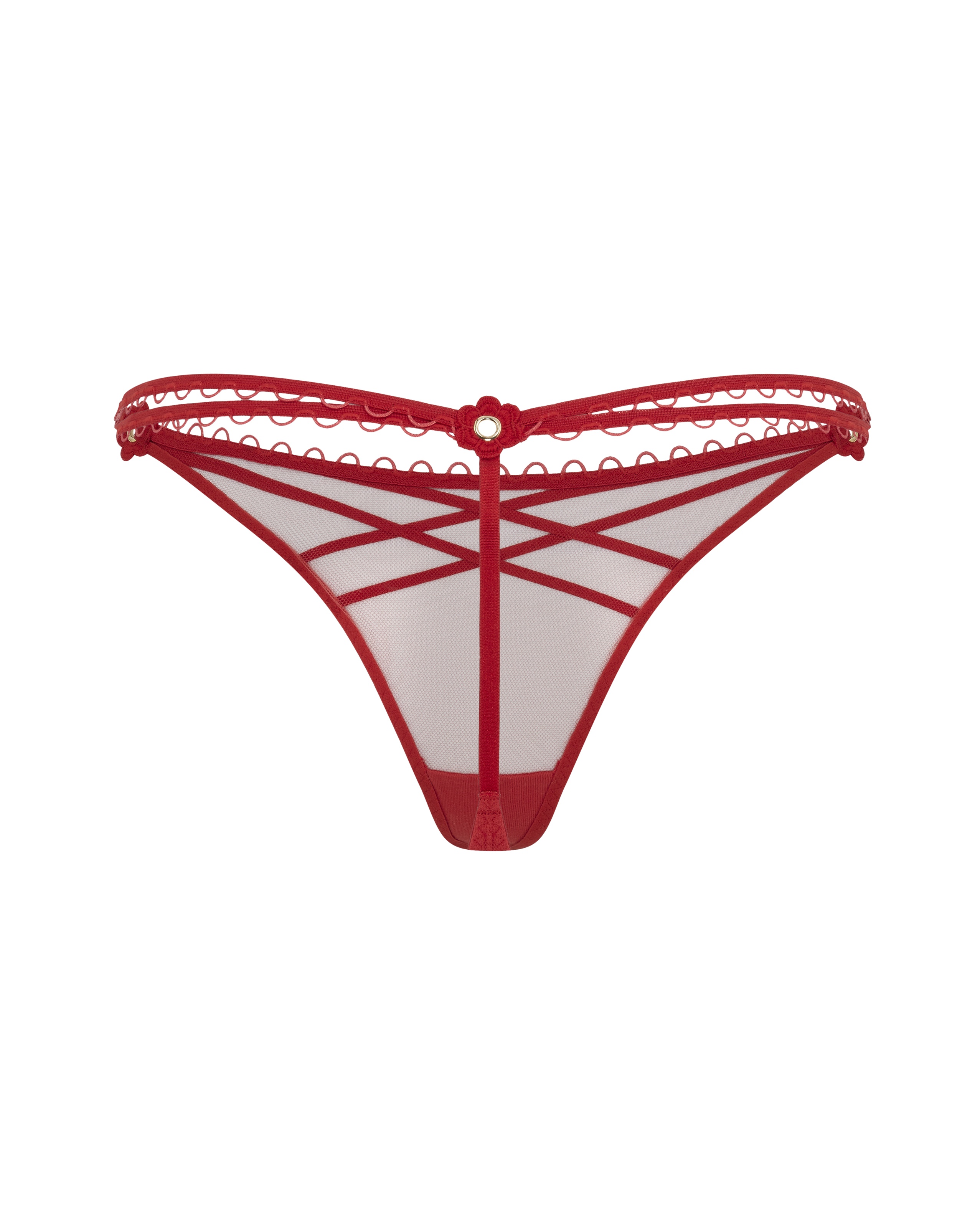 Красные стринги Doretta сочетают полупрозрачный тюль с геометрией эластичных лент спереди и цветочной отделкой сзади. Завершают образ аккуратные петельки, которые добавляют игривый штрих.
