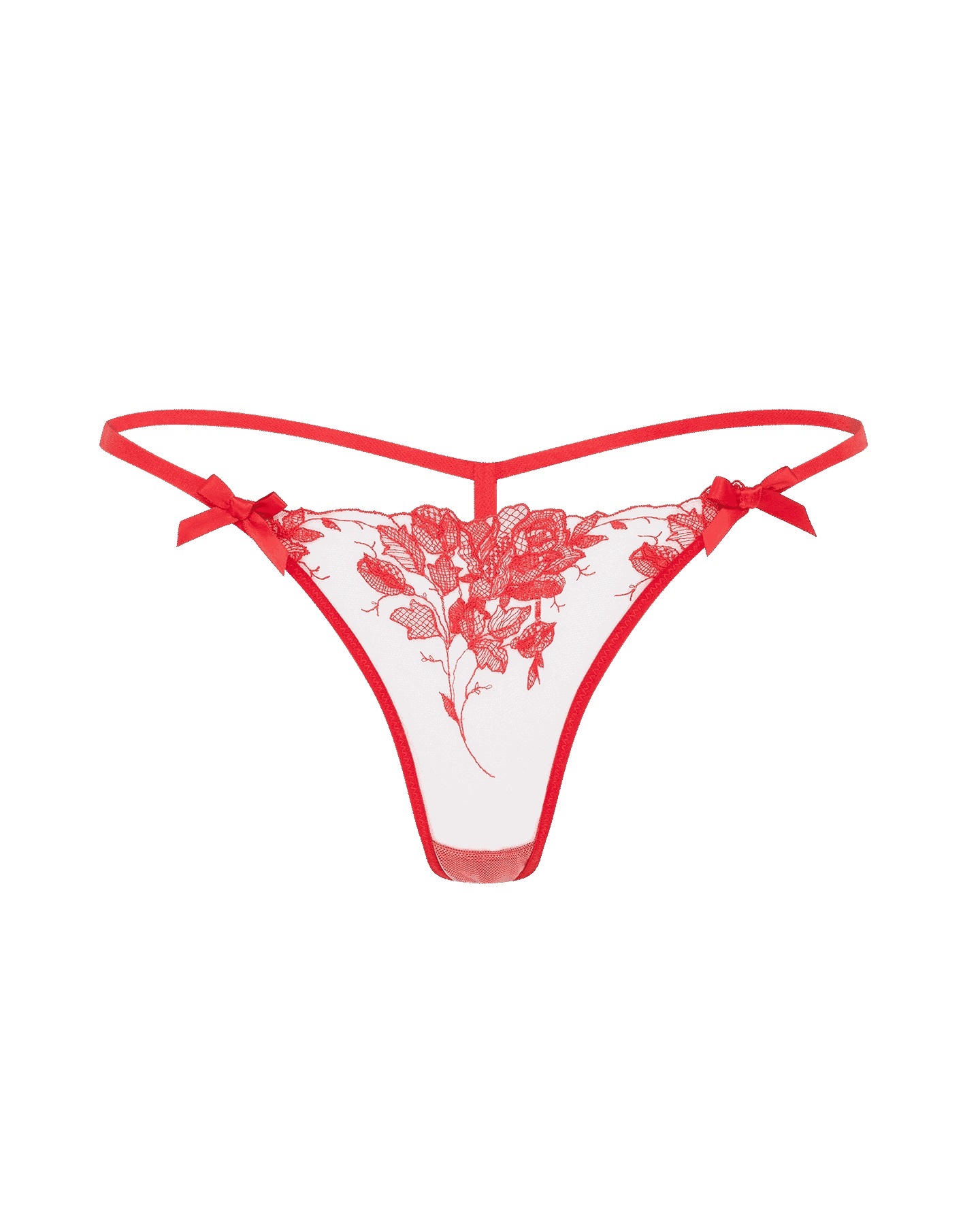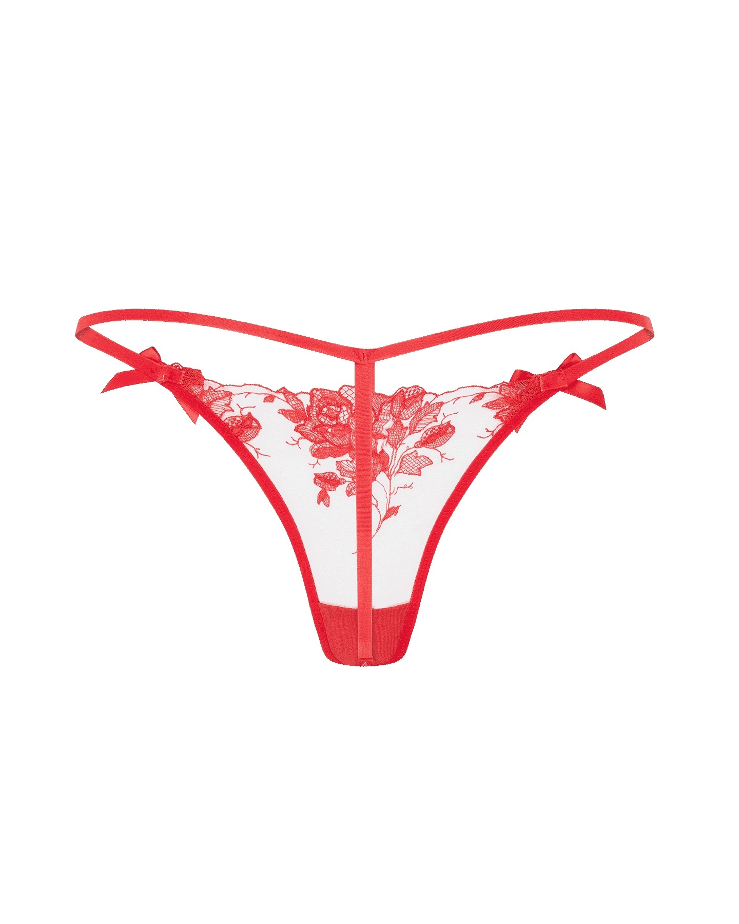 Стринги Elvie в классическом силуэте танга выполнены из нежного песочного тюля. Цветочная вышивка красного оттенка создает романтичный акцент. Соберите цветущий образ, дополнив комплектом Elvie.