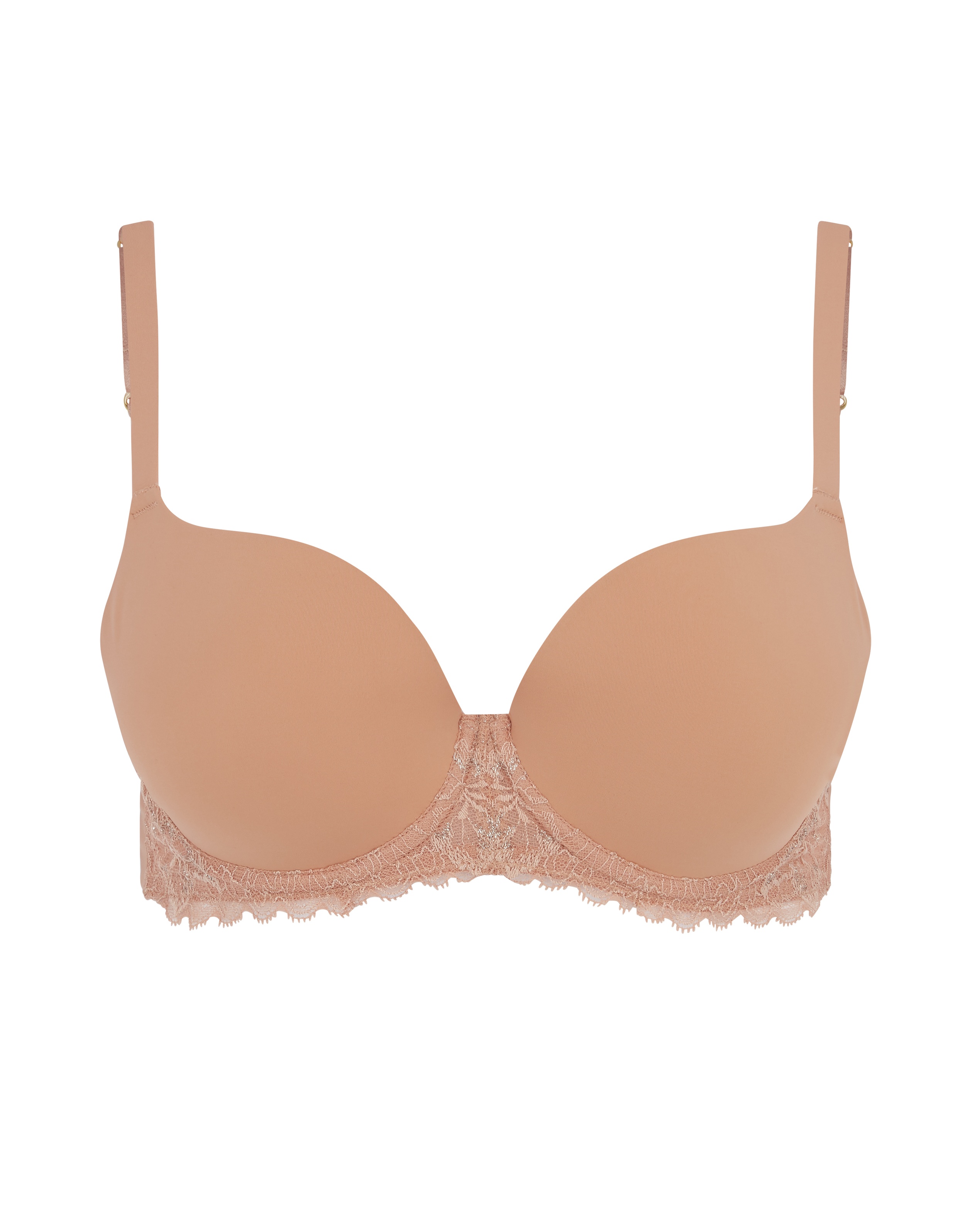 Базовый бюстгальтер Leni выполнен в персиковом цвете. Классическая модель балконет с дополнительной поддержкой пуш-ап. Гладкие чашечки выполнены из микрофибры, что позволяет носить бюстгальтер с тонкими прилегающими футболками, блузами и платьями. Лента под грудью выполнена из резного кружева в цвет.