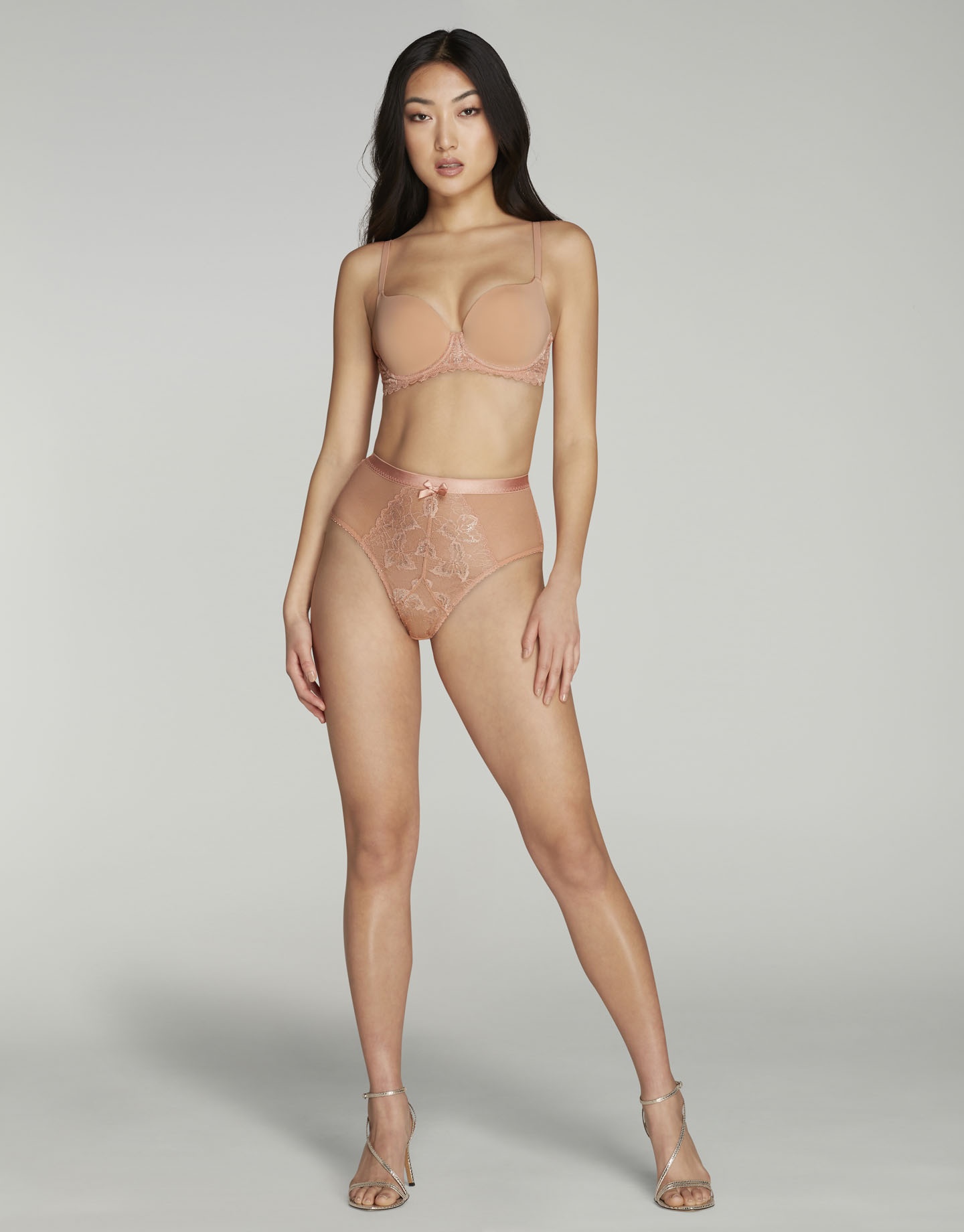 Высокие брифы Leni выполнены из японского кружева и полупрозрачного тюля персикового цвета. Кружевная вставка спереди ромбовидной формы выполнена с рельефными швами, что делает посадку удобной и подчеркивает изгибы. Линия бикини обработана резным эластичным кантом. Широкий пояс-резинка обеспечивает посадку на талии.