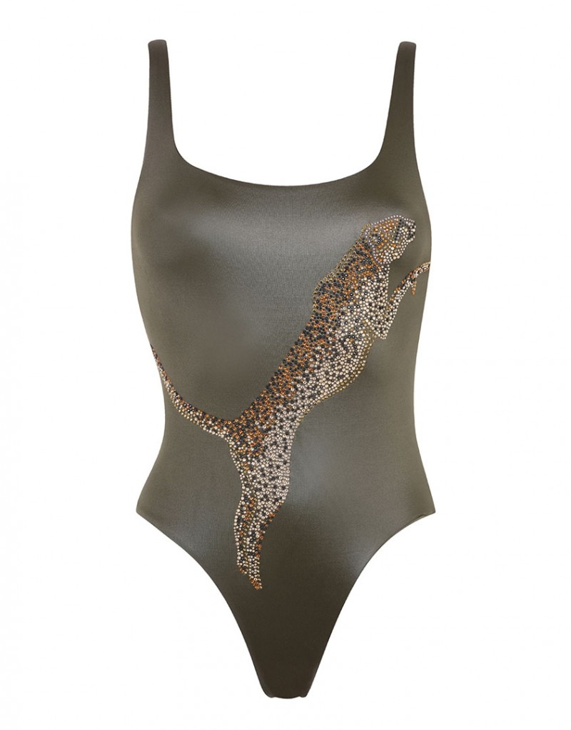 Выпустите на волю свою дикую натуру в Indiana. Купальник из ткани с "мокрым" эффектом спереди украшен принтом с гепардом, инкрустированным мерцающими кристаллами. Высокие трусики и глубокие вырезы спереди и на спине восхитительно подчеркивают фигуру. - Инкрустированный кристаллами гепард - Сделано в Италии Материалы и уход: Основной материал: 80% полиамид, 20% эластан. Подкладка: 83% полиэстер, 17% эластан. Рекомендована ручная стирка.
