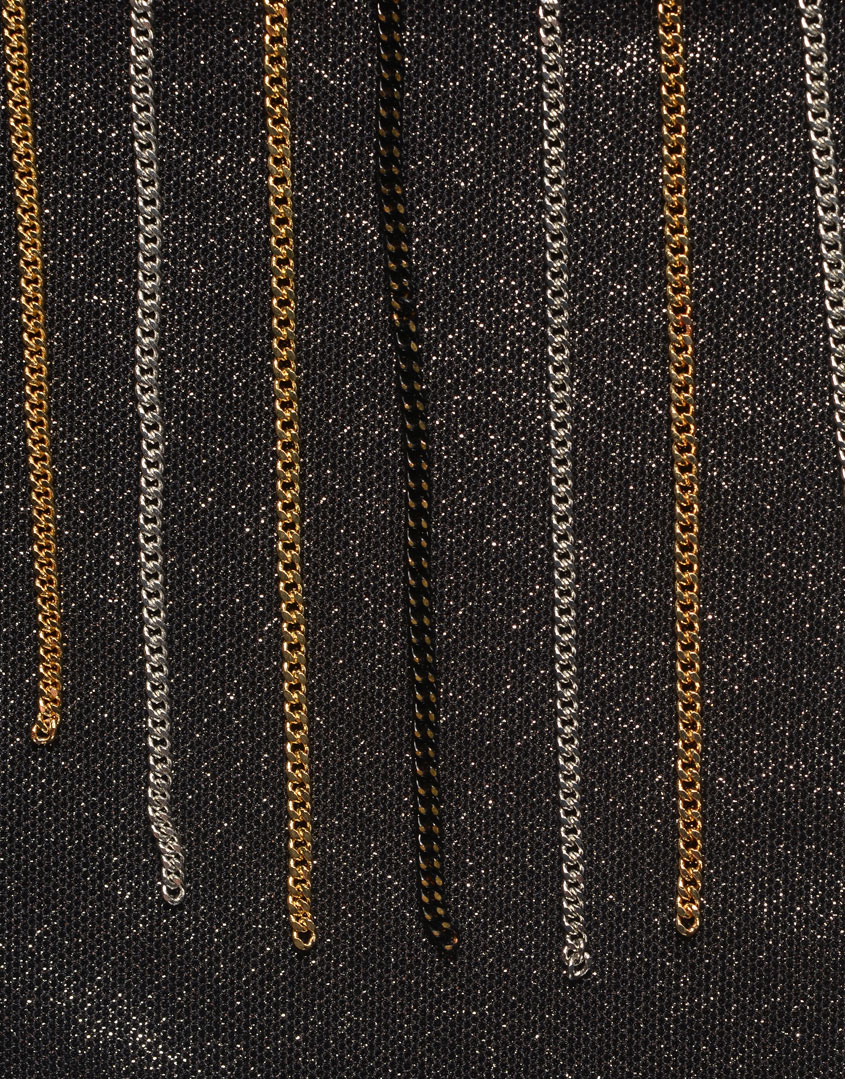 Добавьте блеска с Lu-Lou: спускаясь к морю в этом купальнике, Вы точно привлечете всеобщее внимание. Верхний слой ткани выполнен из сияющего люрекса с мокрым эффектом и украшен золотыми, черными и серебряными цепочками, которые изящно ниспадают вдоль линии декольте и бедер.