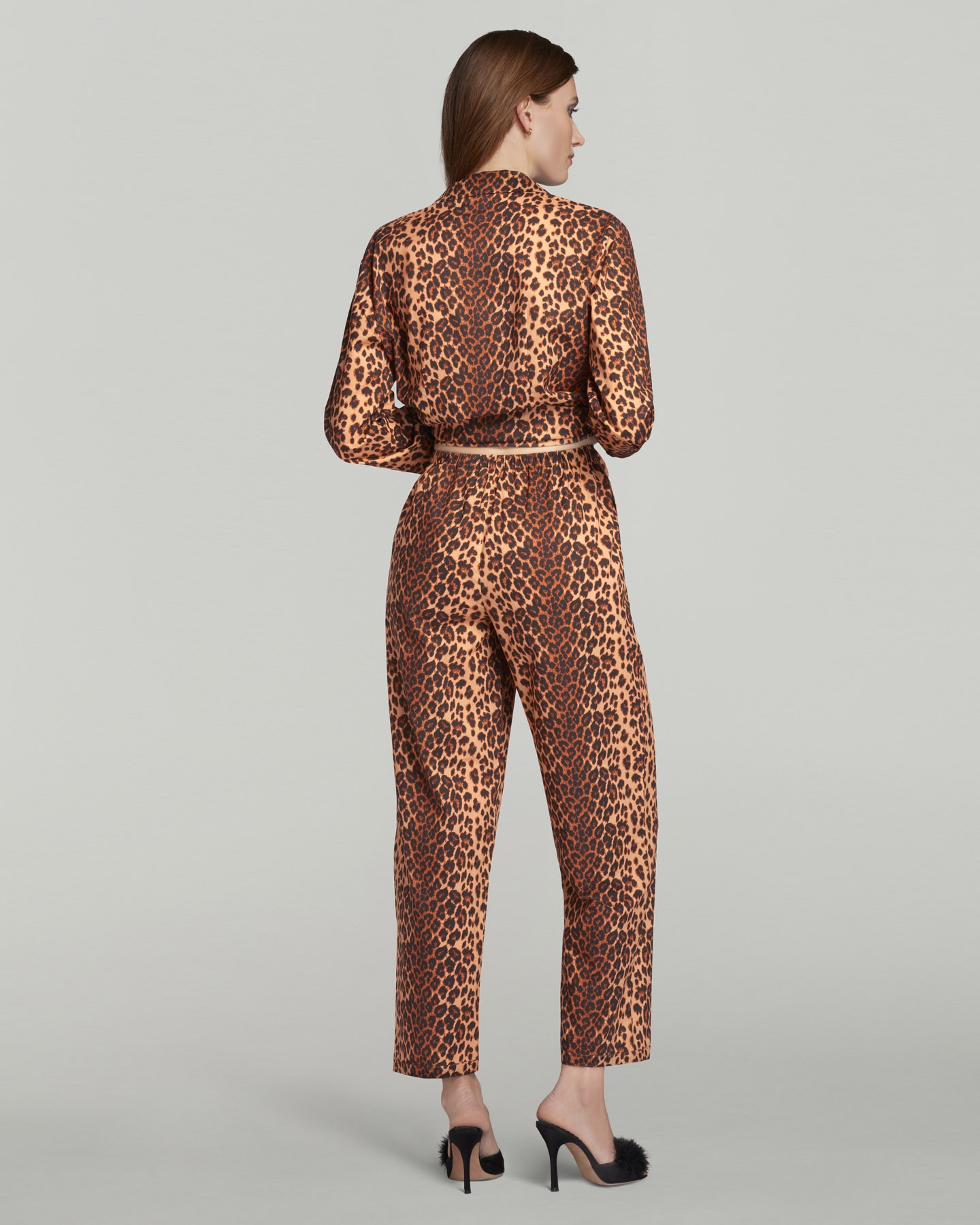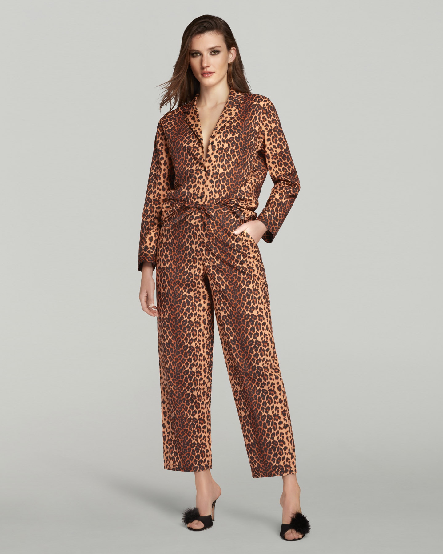 Пижамный комплект Filipa выполнен из хлопка фирменной леопардовой расцветки. При создании пижамы дизайнеры вдохновлялись мужским фасоном, поэтому пара состоит из прямой рубашки на пуговицах и широких укороченных брюк на завязках с карманами.